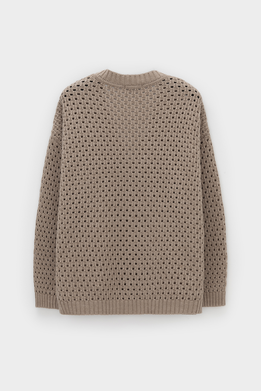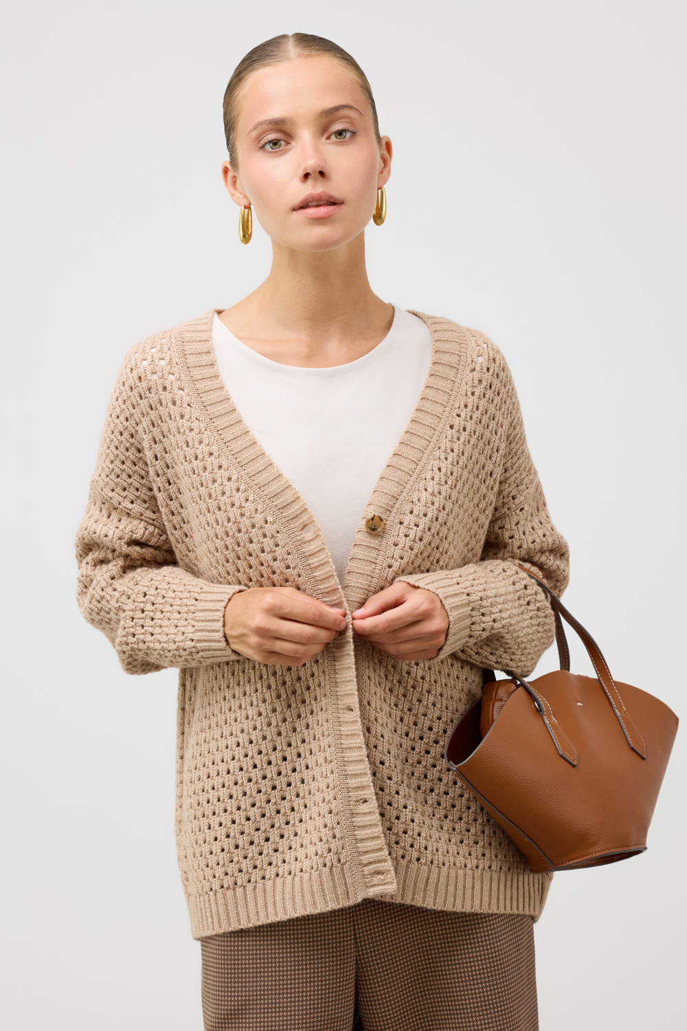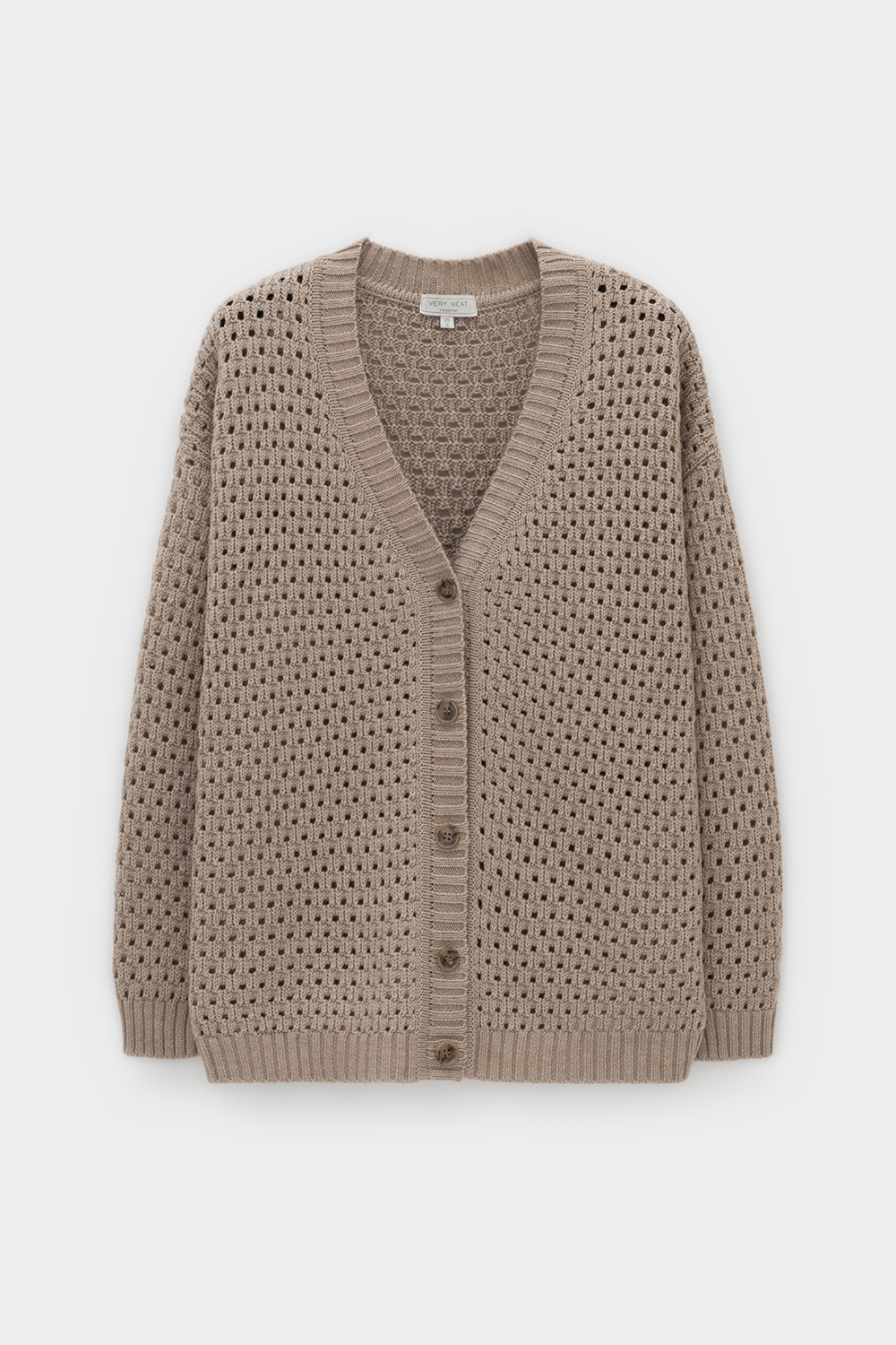 Мягкий  кардиган из ажурной вязки, выполненный из первоклассного материала, сочетает в себе шерсть и акрил, что создает атмосферу комфорта. Он приятно облегает тело, не вызывает дискомфорта и прекрасно сохраняет свою форму.