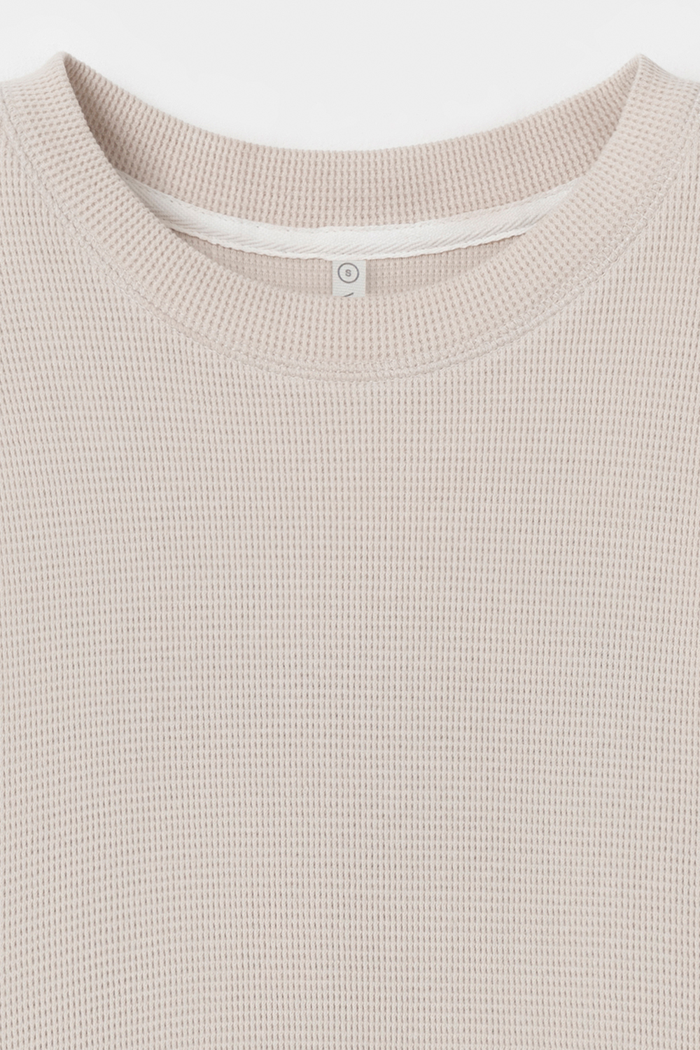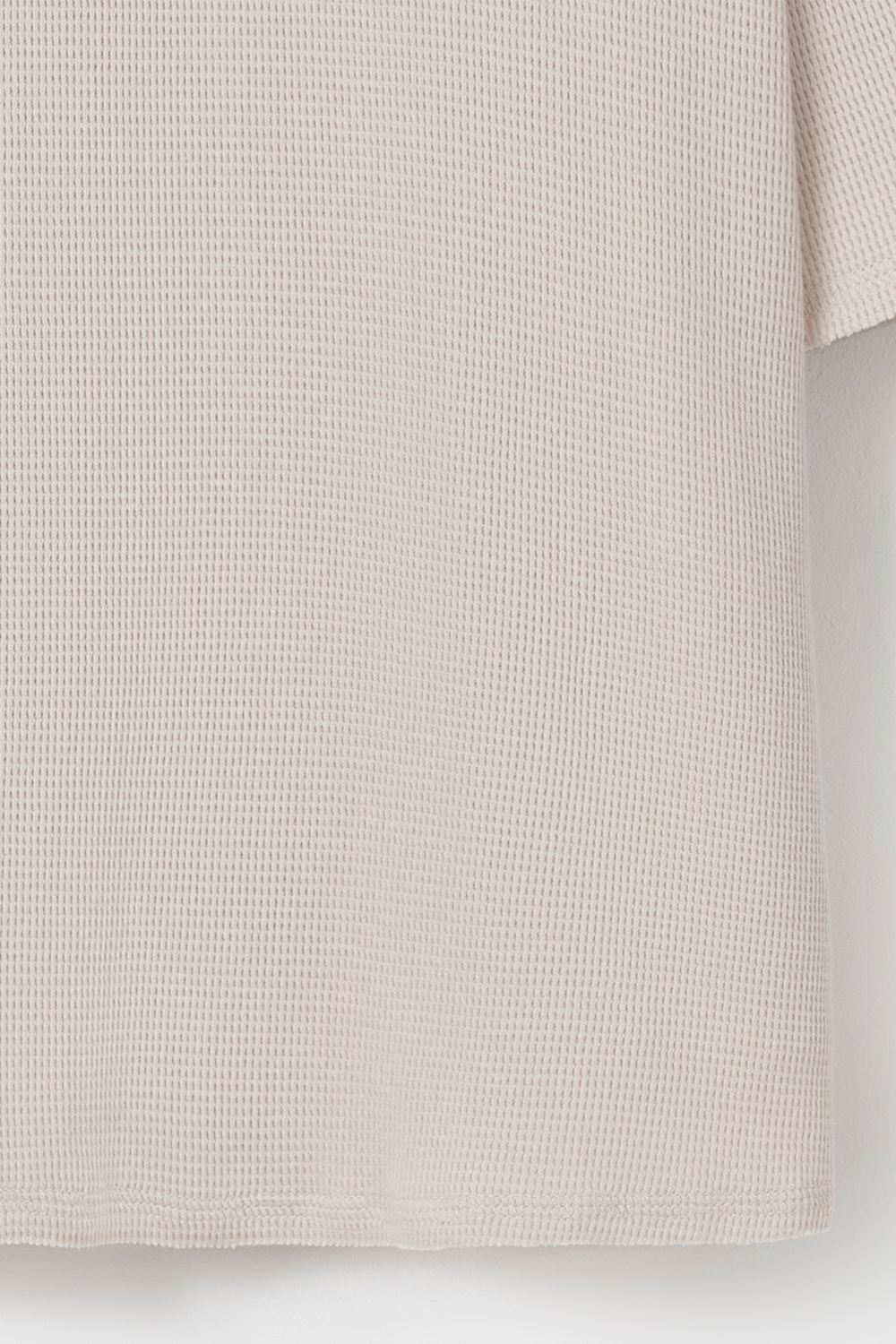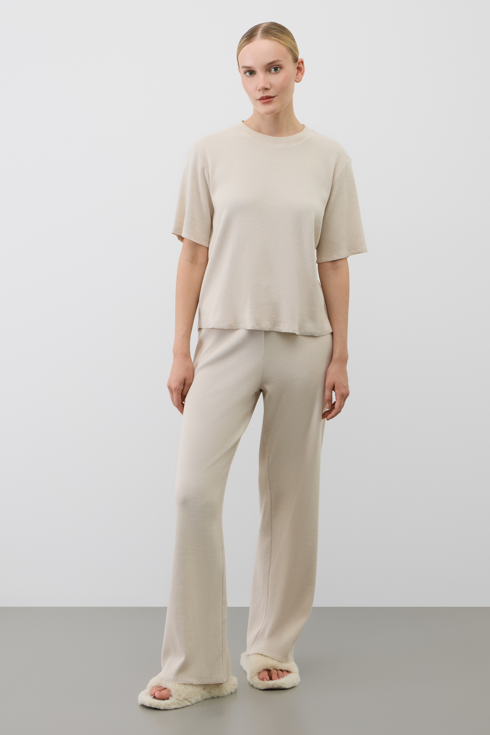 Комплект из объемного трикотажа с добавлением эластичных волокон. Свободный силуэт и мягкий пояс брюк обеспечат комфорт во время сна и отдыха.