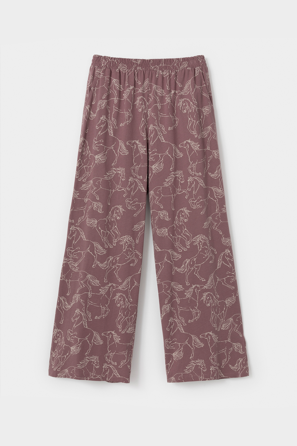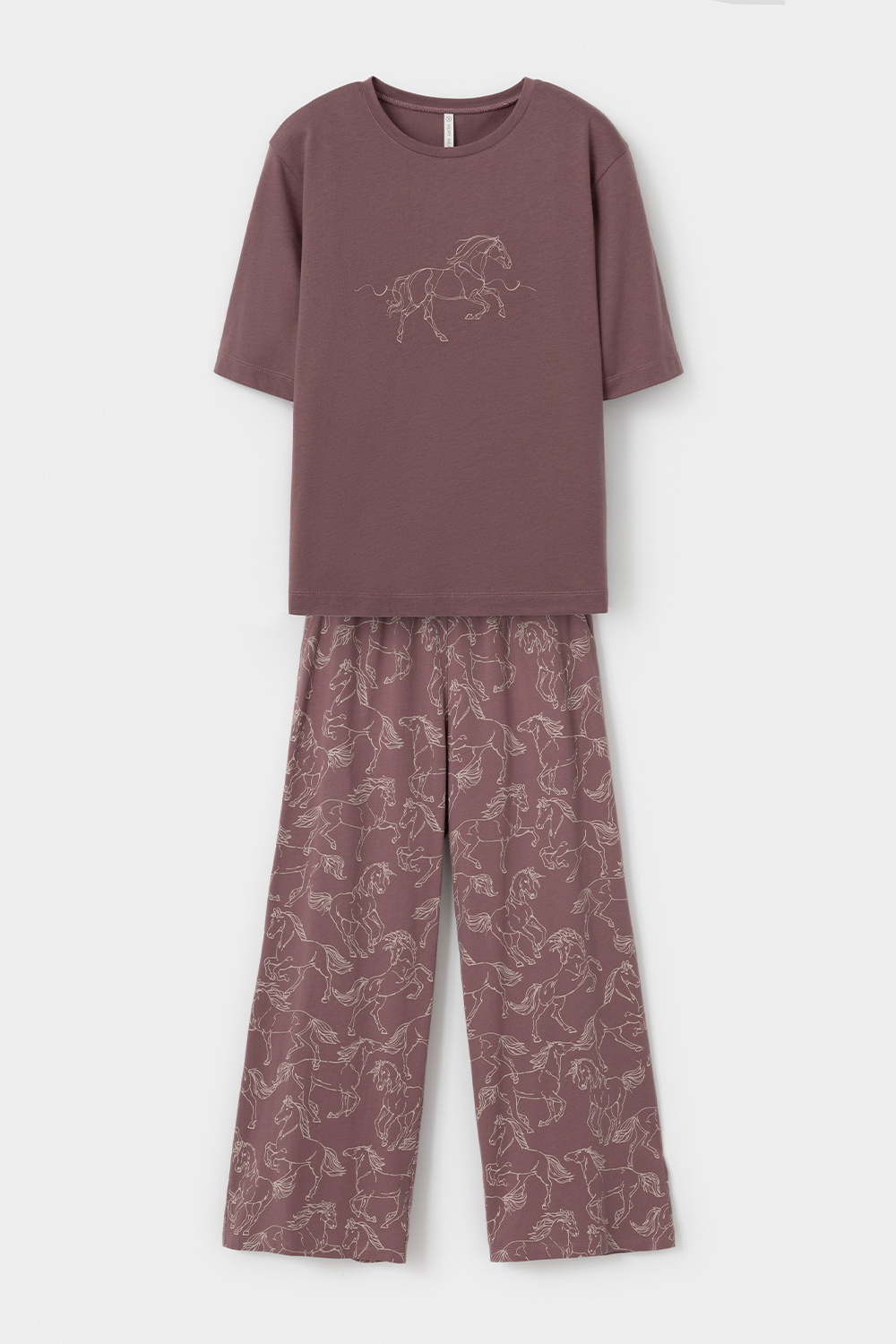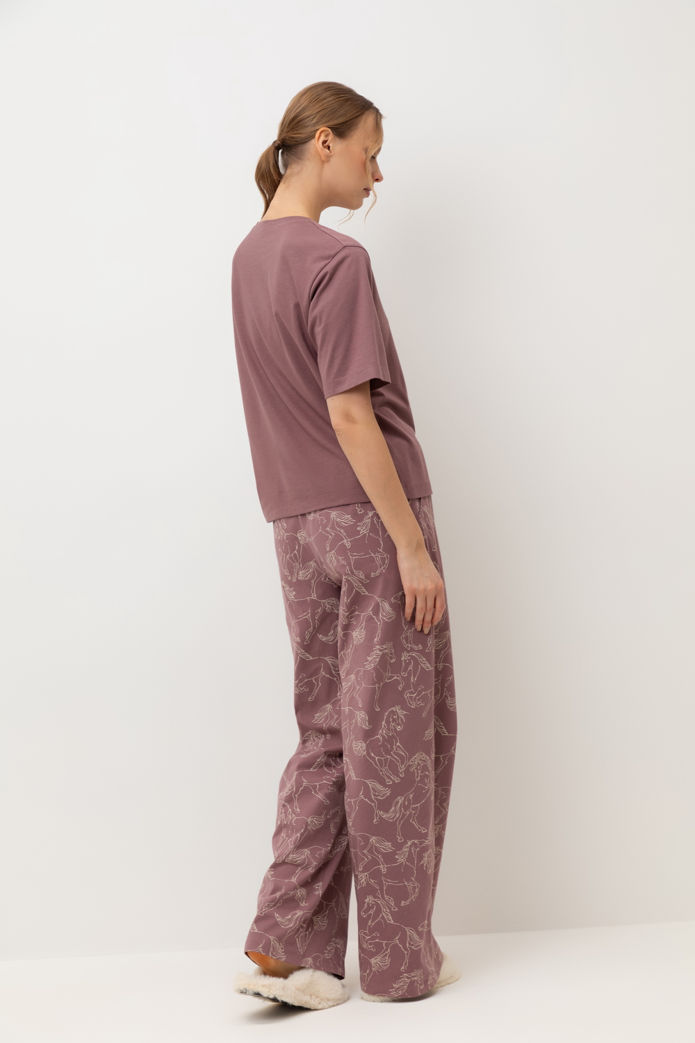 Комплект приглушенного оттенка выполнен из хлопка с нежнейшим модалом. Свободный крой футболки и мягкий пояс брюк обеспечивают легкость и свободу движений.