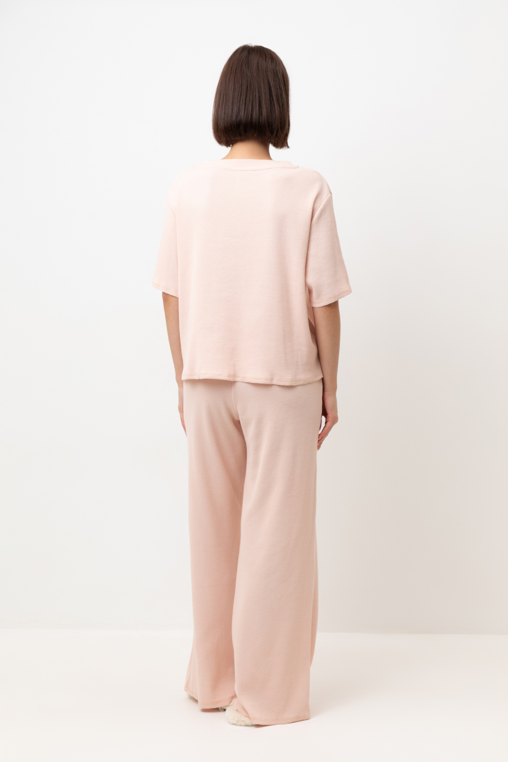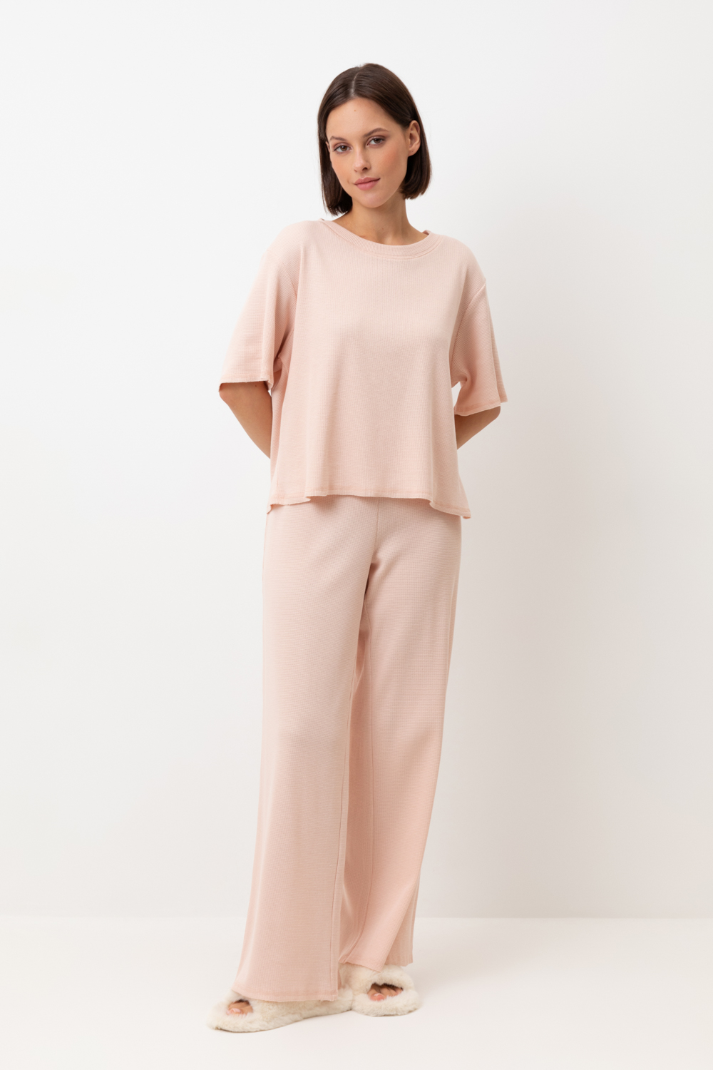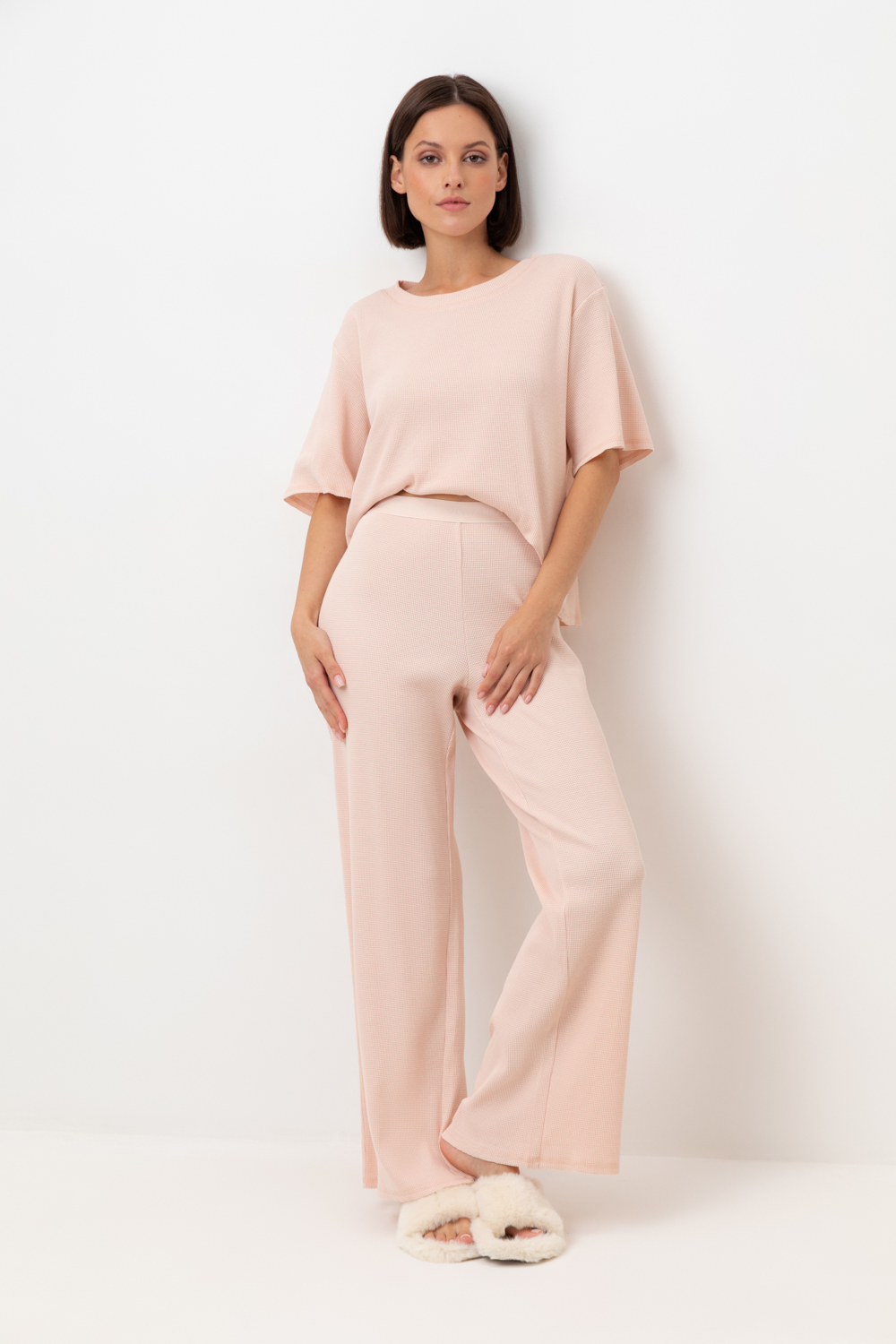 Комплект из объемного трикотажа с добавлением эластичных волокон. Свободный силуэт, мягкий пояс и отсутствие боковых швов на брюках обеспечат комфорт во время сна и отдыха.