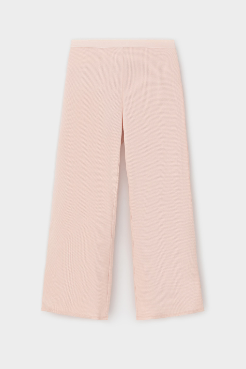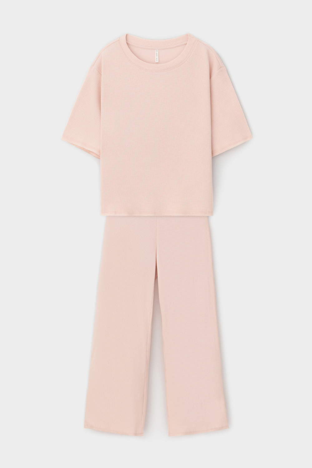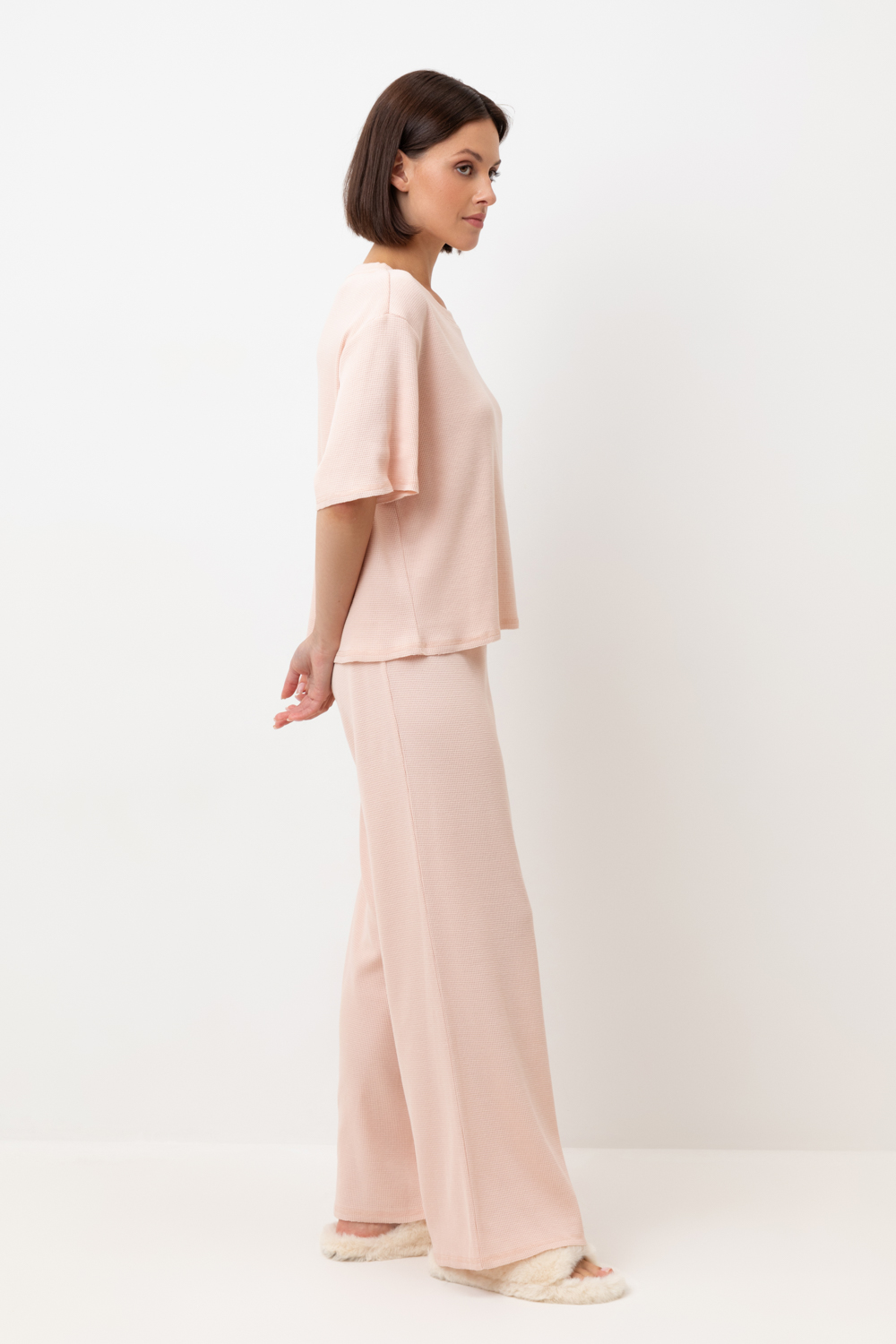 Комплект из объемного трикотажа с добавлением эластичных волокон. Свободный силуэт, мягкий пояс и отсутствие боковых швов на брюках обеспечат комфорт во время сна и отдыха.