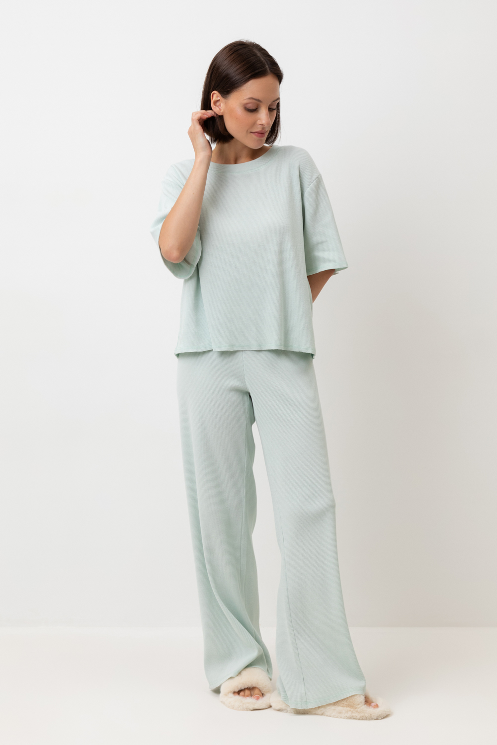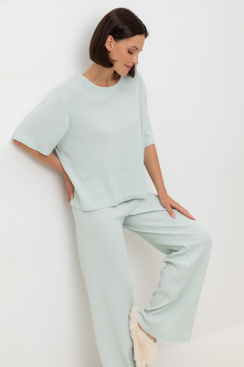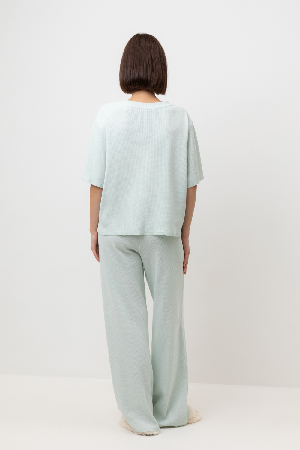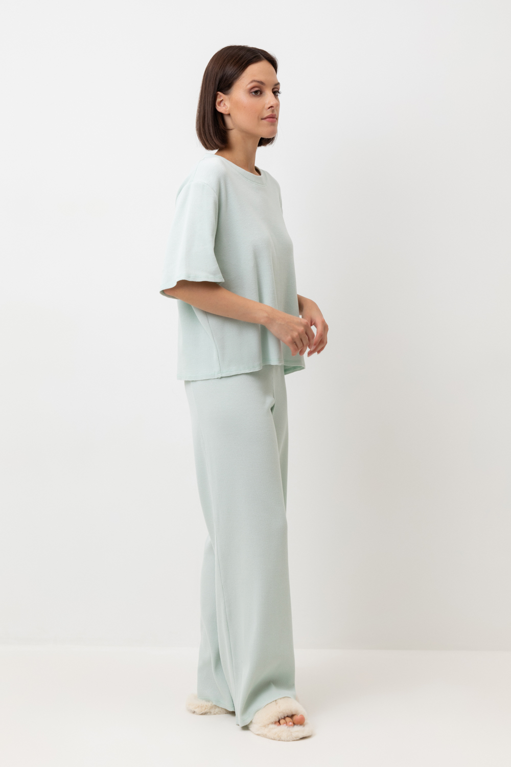Комплект из объемного трикотажа с добавлением эластичных волокон. Свободный силуэт, мягкий пояс и отсутствие боковых швов на брюках обеспечат комфорт во время сна и отдыха.