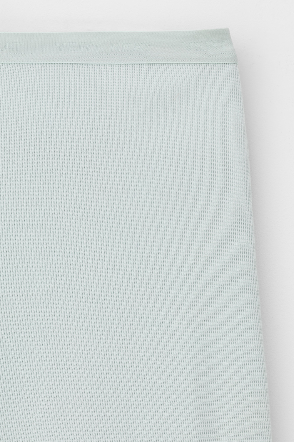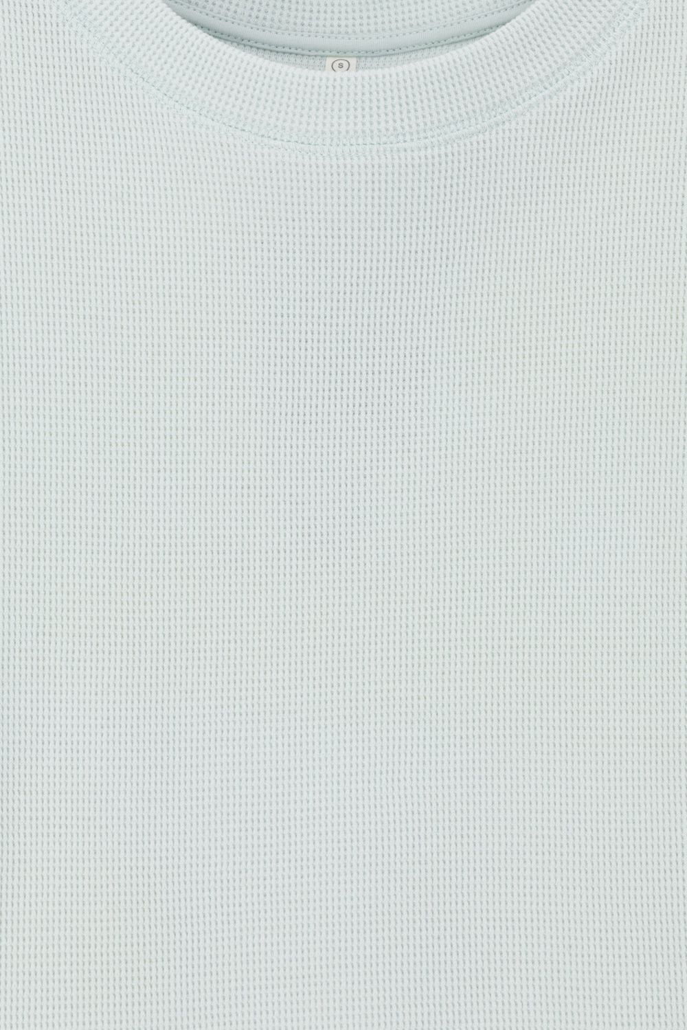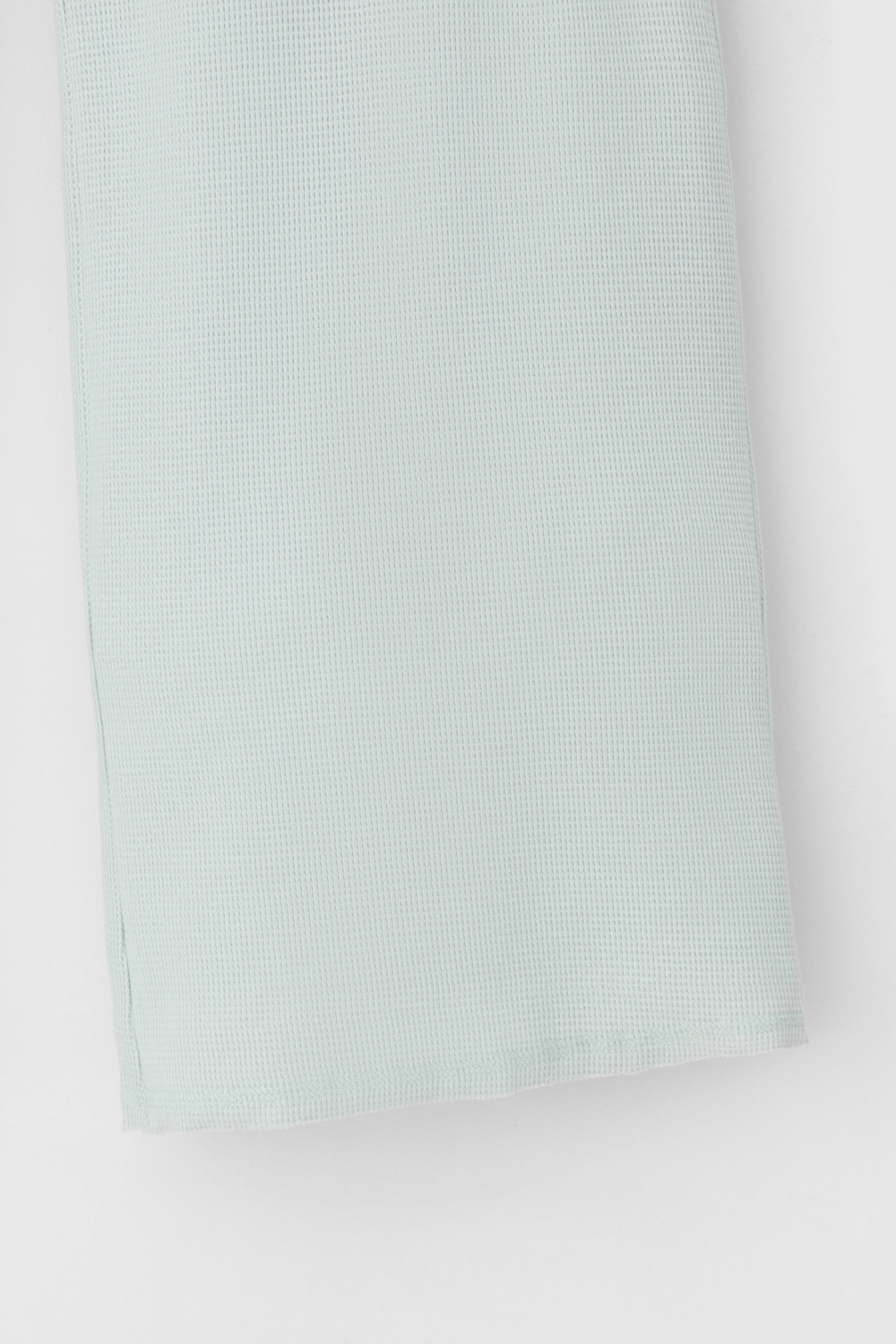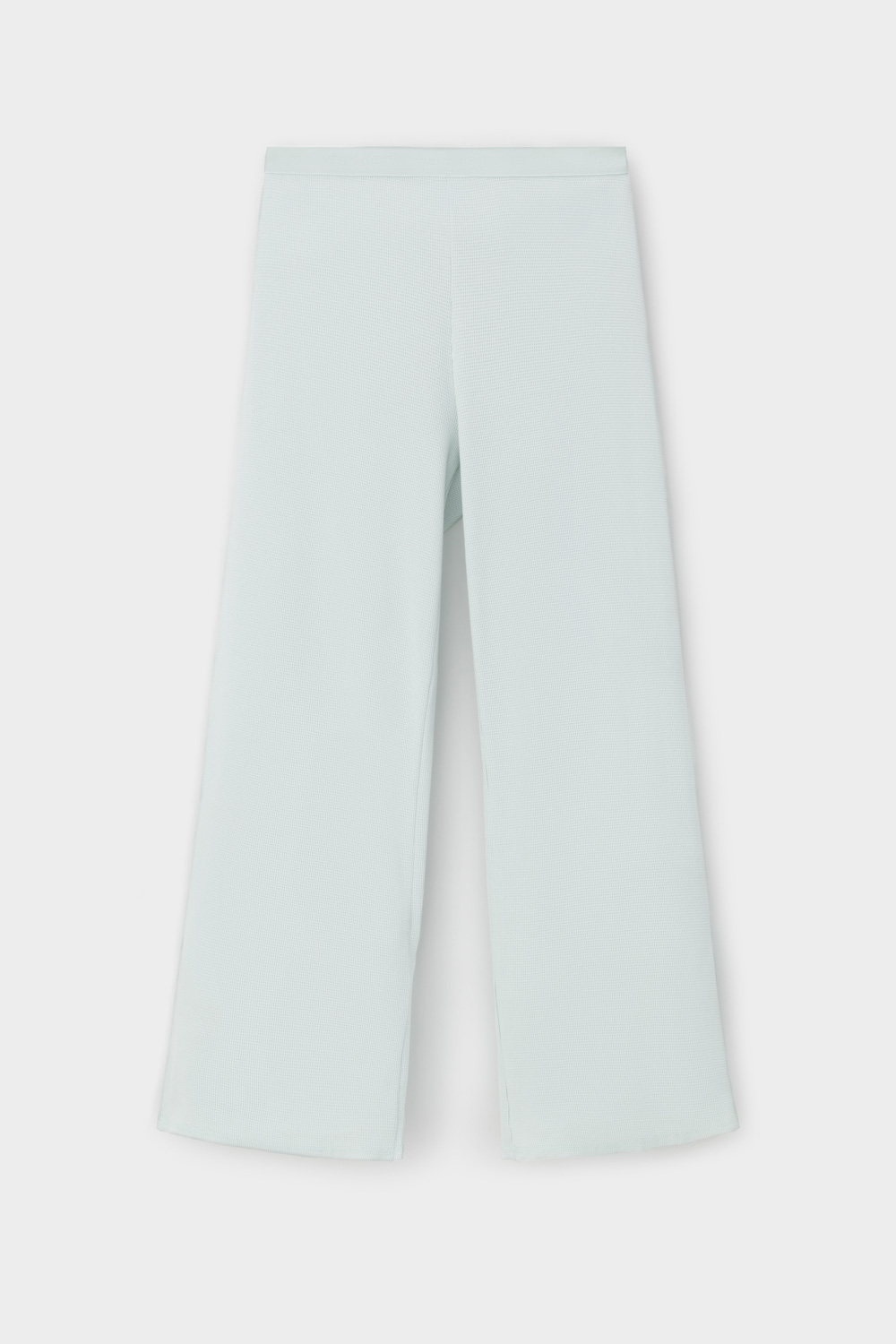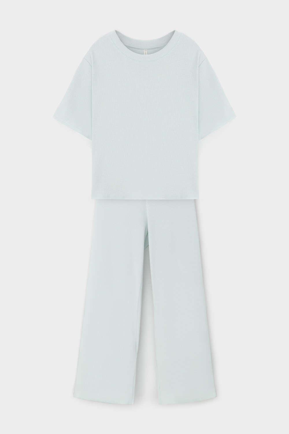 Комплект из объемного трикотажа с добавлением эластичных волокон. Свободный силуэт, мягкий пояс и отсутствие боковых швов на брюках обеспечат комфорт во время сна и отдыха.