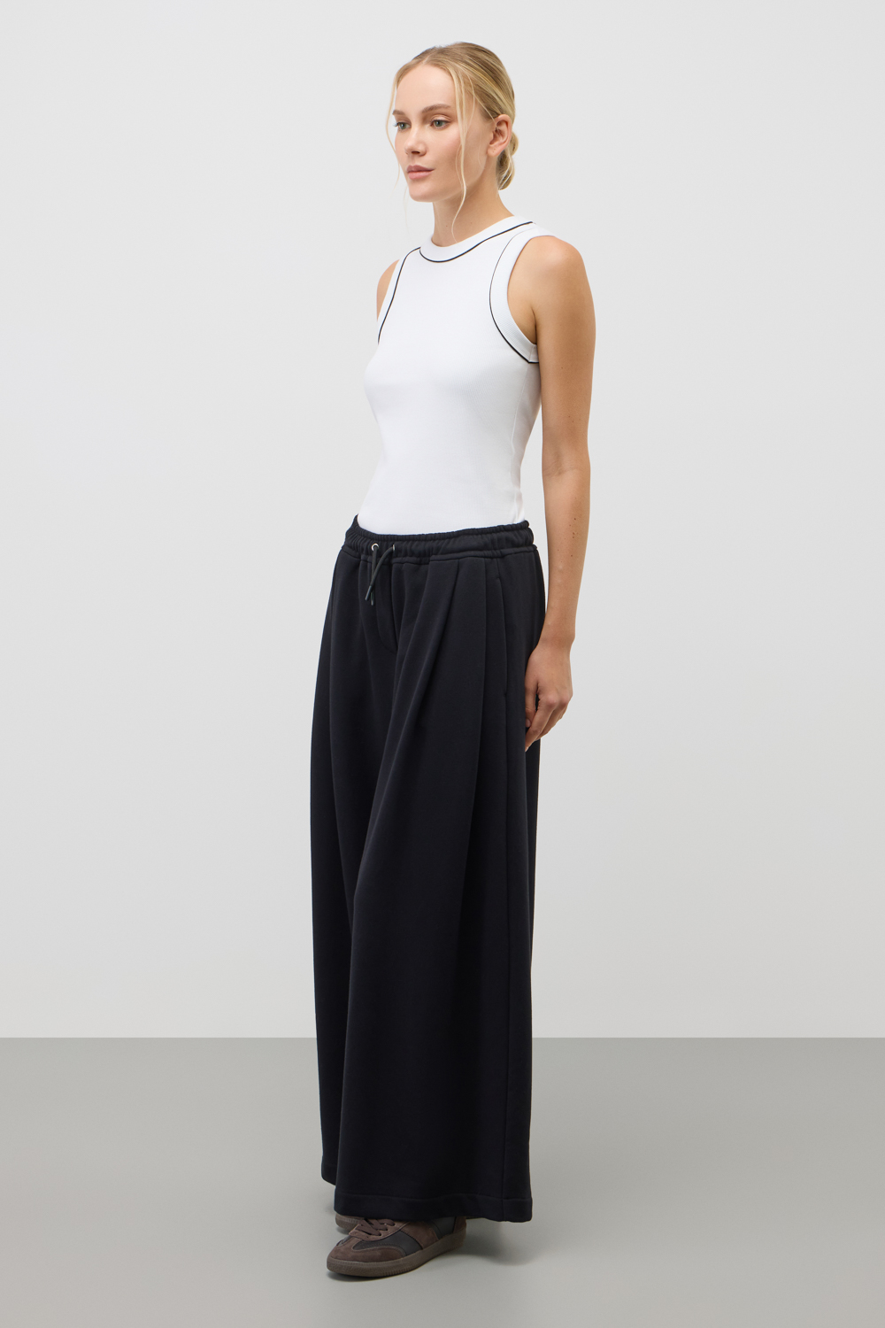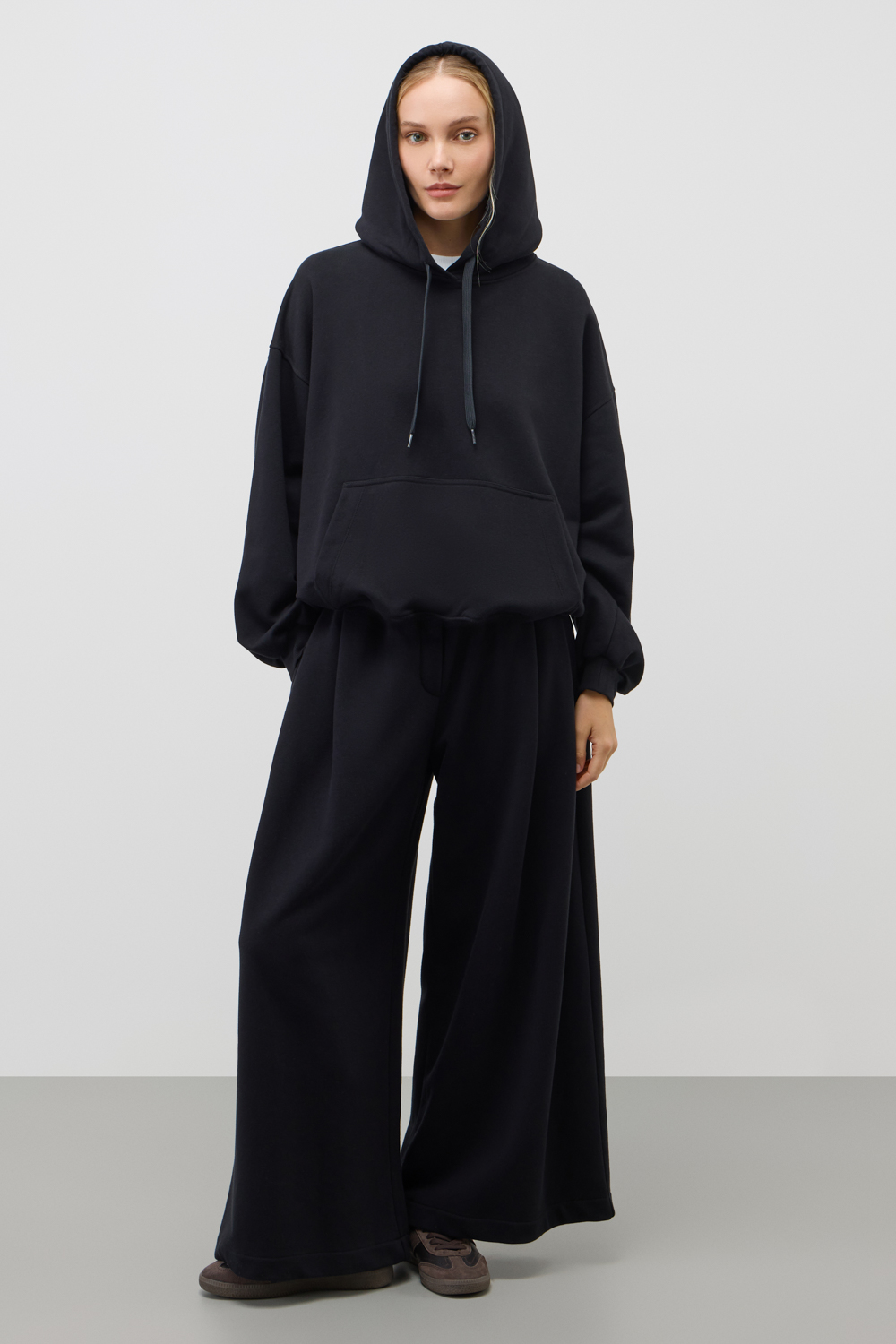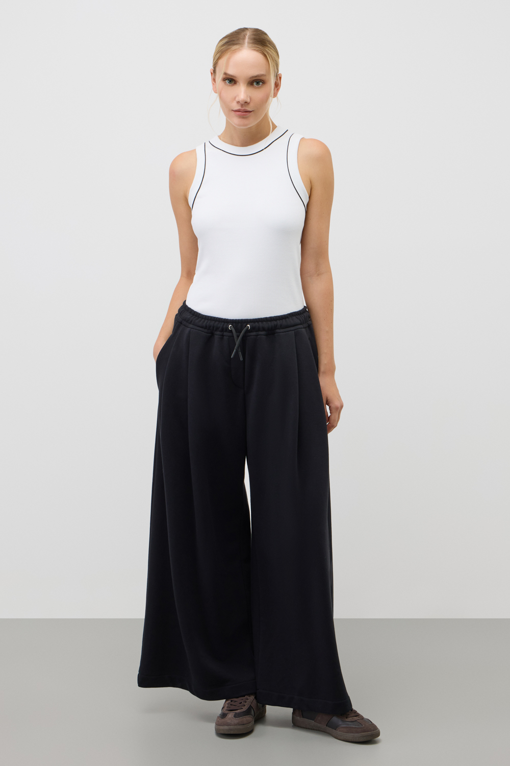 Широкие брюки из футера со складками станут стильным дополнением в гардеробе. Широкий крой придает расслабленности образу и комфорт в движении. Изделие дополняют функциональные карманы