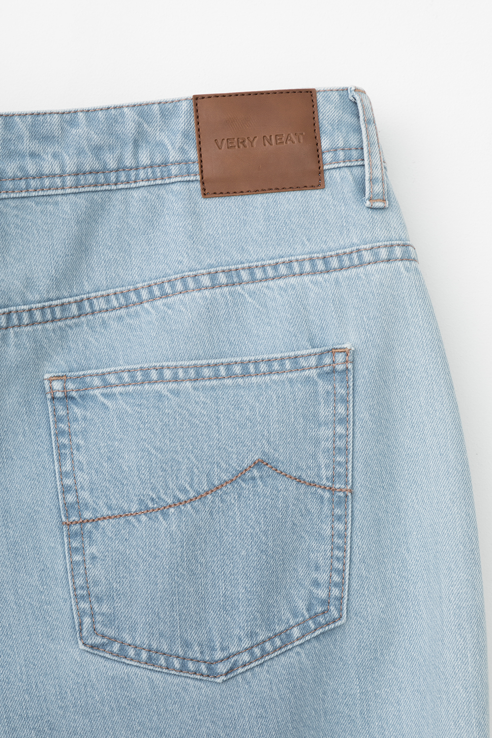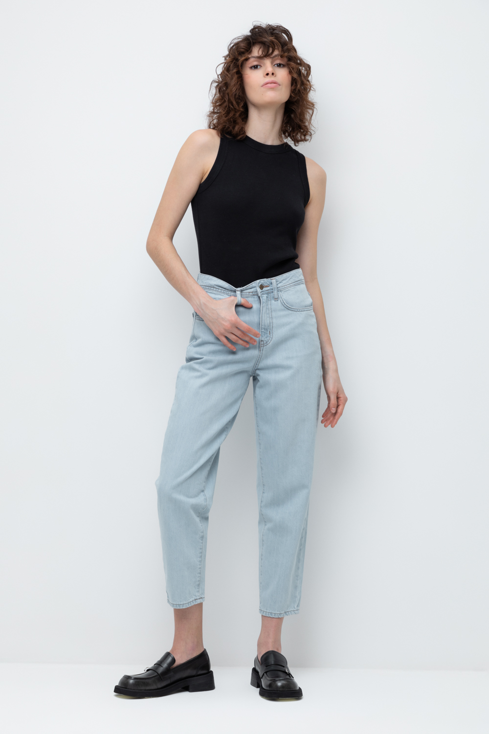 Женские джинсы из 100% хлопка свободного кроя, зауженные книзу, с эффектом выбеленности и завышенной линией талии. Модель с классическими 5 карманами и фирменной нашивкой из эко кожи Very Neat.