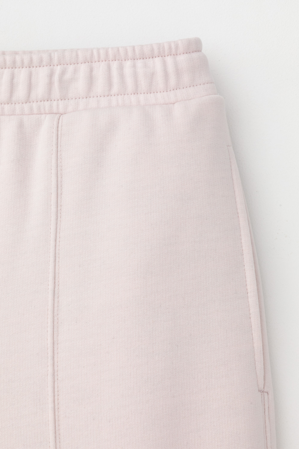 Брюки свободного силуэта со стрелками из мягкого двухцветного футера. Внутренняя сторона изделия представлена в натуральном цвете хлопка, внешняя в нежно-розовом. За счет использования крашенной пряжи, данный вид полотна прошел минимальную обработку, что придало изделию мягкость и шелковистость.