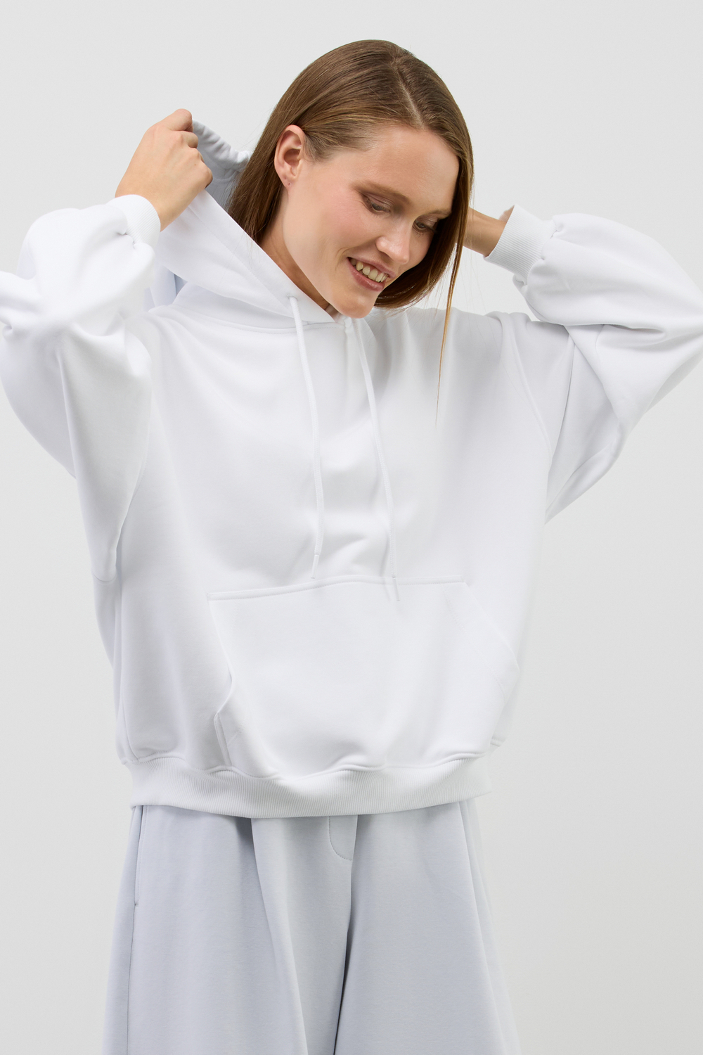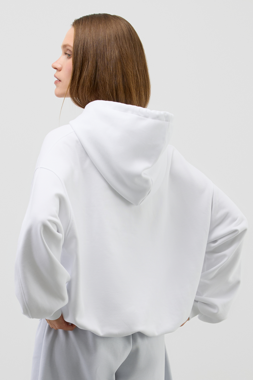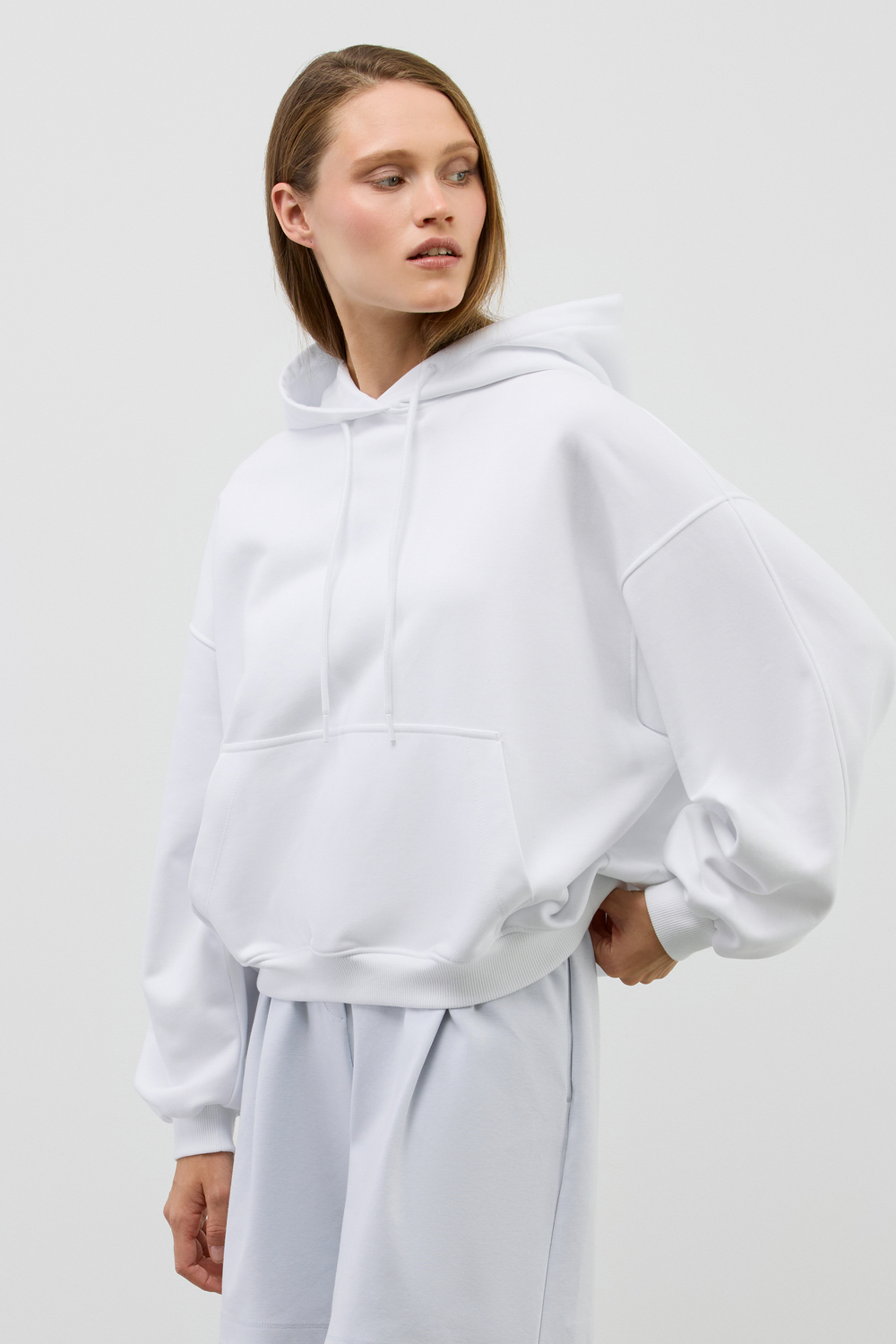 Худи из мягкого хлопкового футера для расслабленных образов. Для еще большего комфорта изделие дополняют спущенная линия плеч,  объёмный капюшон и в  вместительный накладной карман.