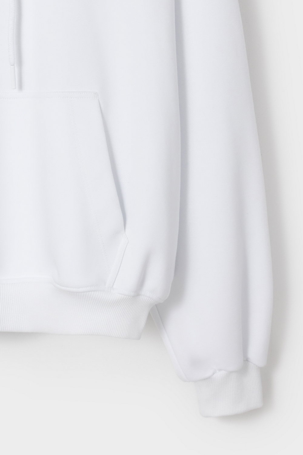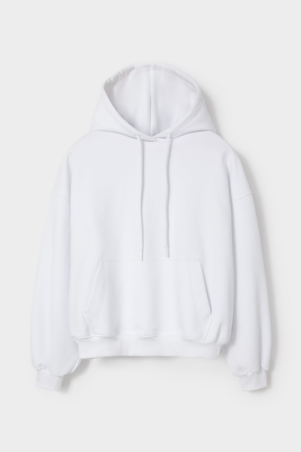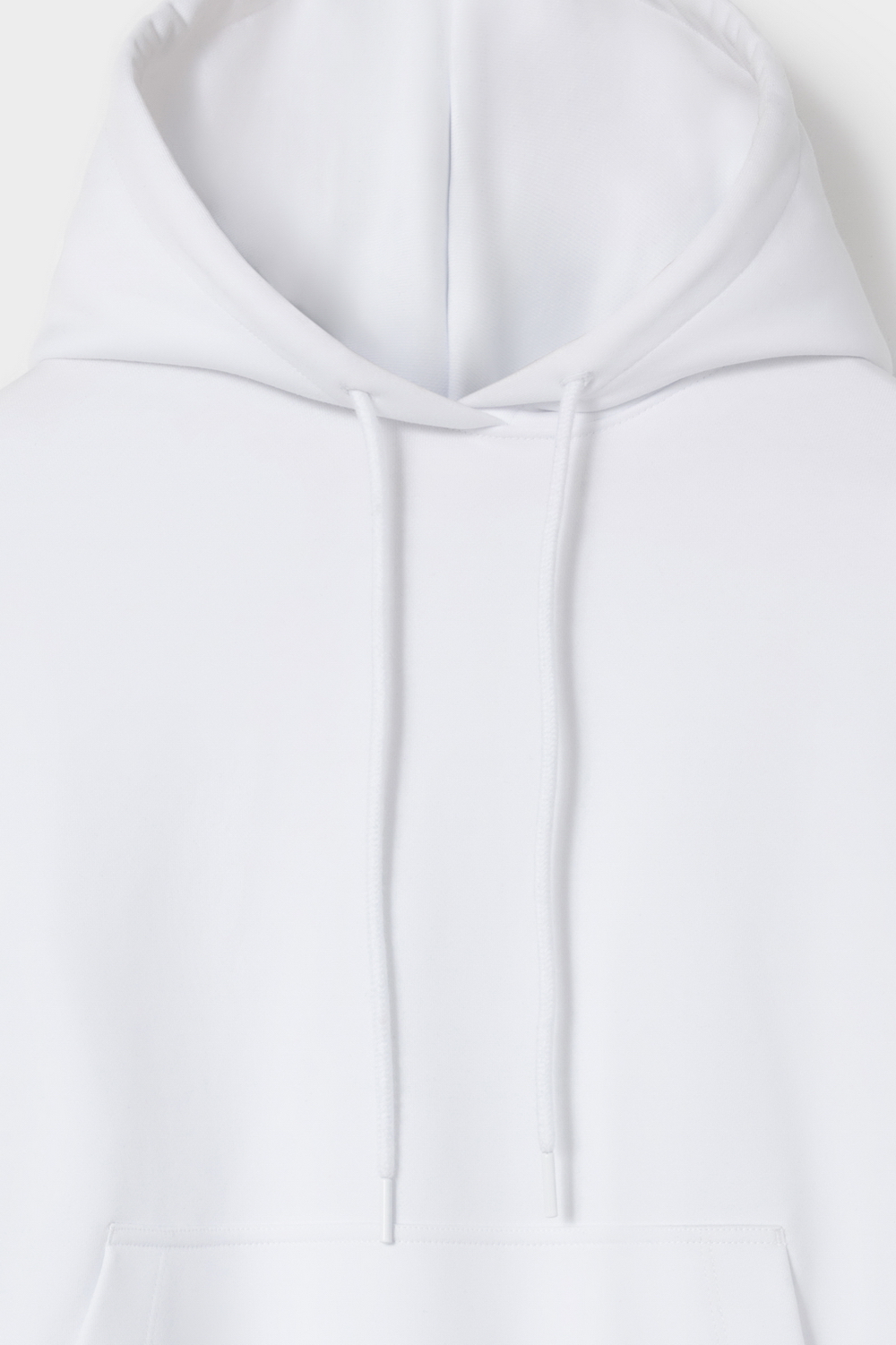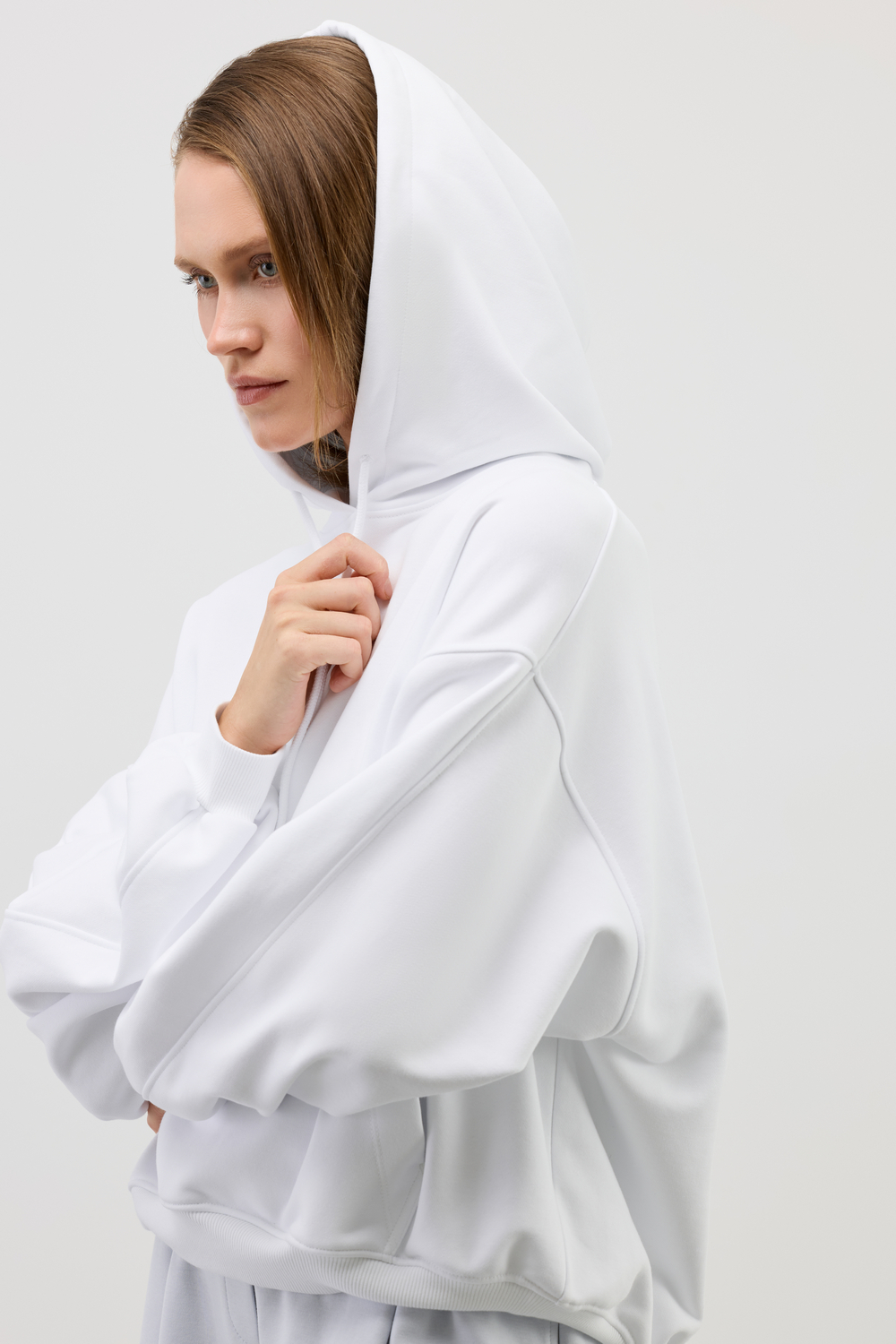 Худи из мягкого хлопкового футера для расслабленных образов. Для еще большего комфорта изделие дополняют спущенная линия плеч,  объёмный капюшон и в  вместительный накладной карман.