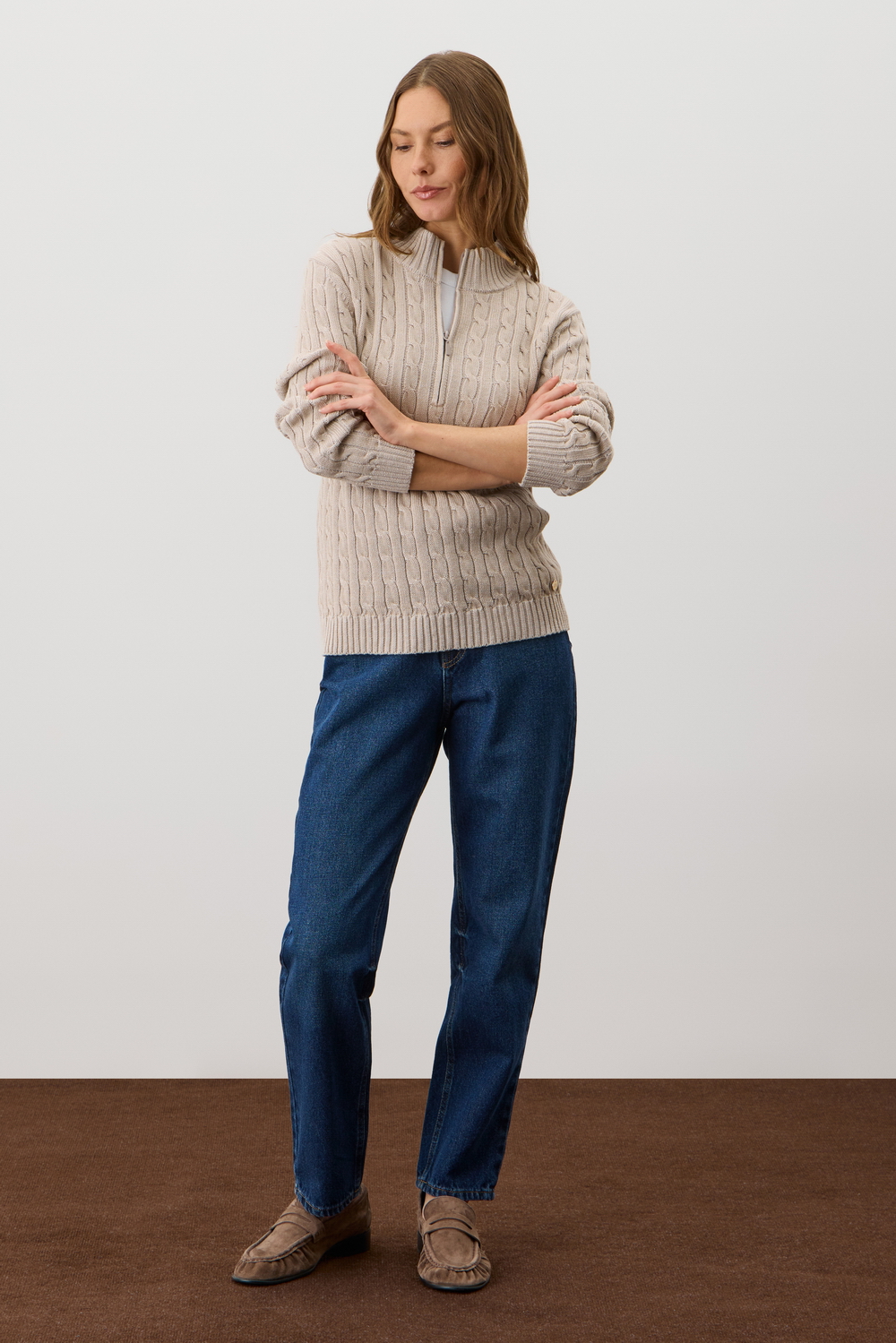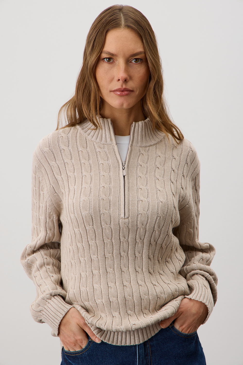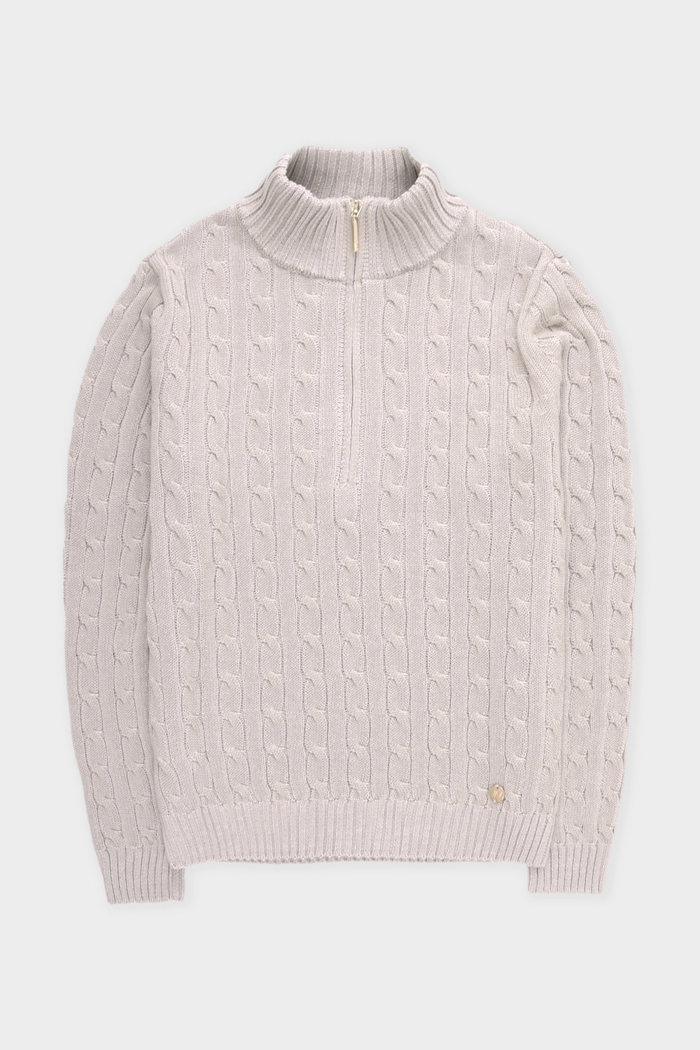 Джемпер с воротником на молнии является лаконичной базой. Комфортный тандем вязки косами и расслабленного кроя становится стильным дополнением различным образам. Джемпер создан из хлопковой пряжи и прошел дополнительную обработку по итальянской технологии, это гарантирует минимальную усадку во время носки. Акрил в составе не позволяет изделию пилинговаться.