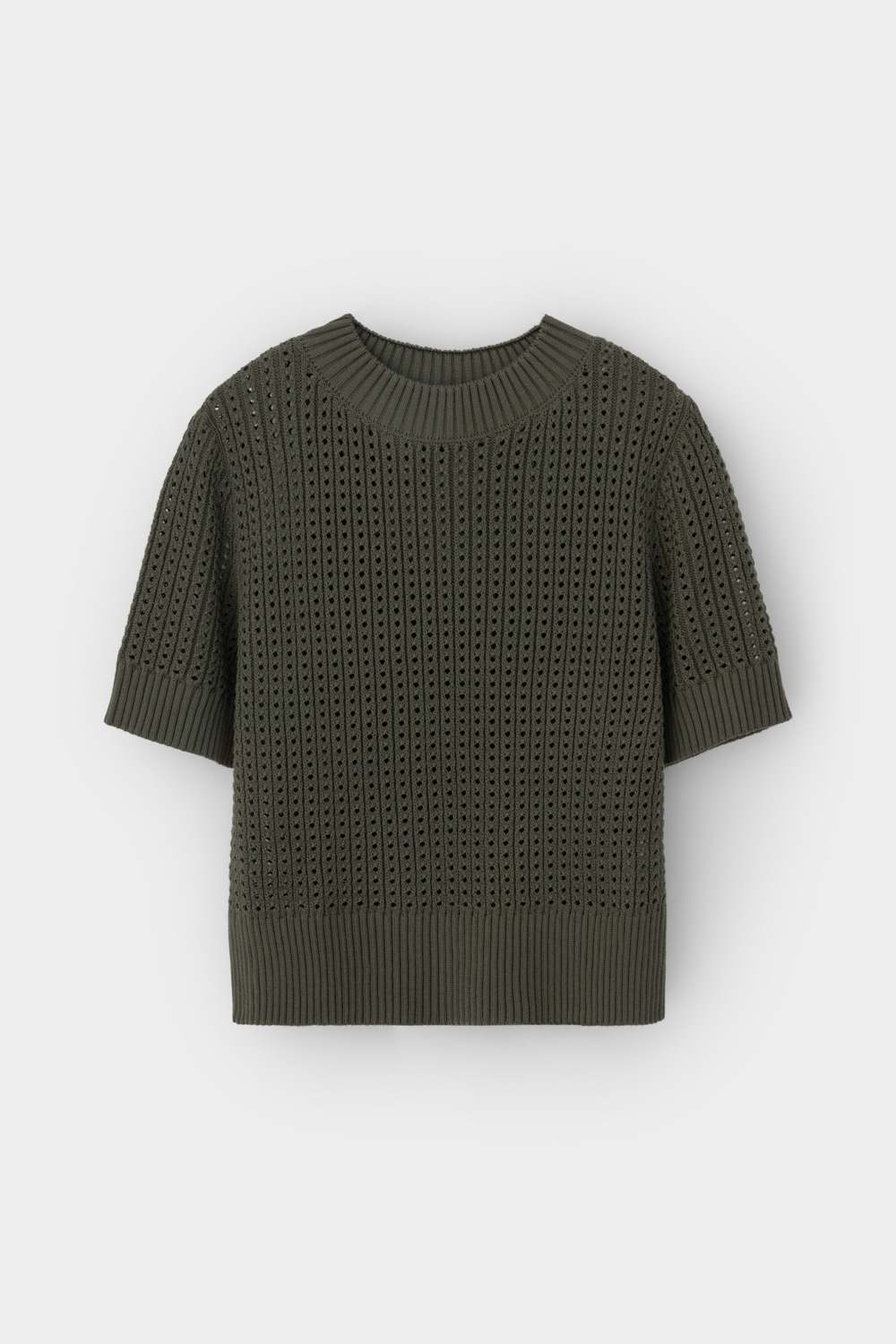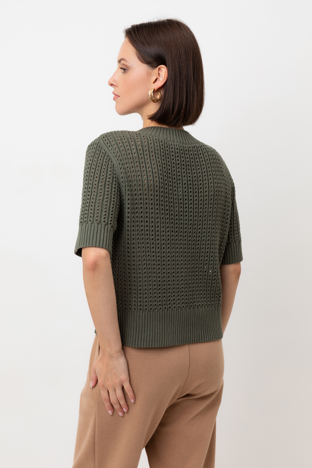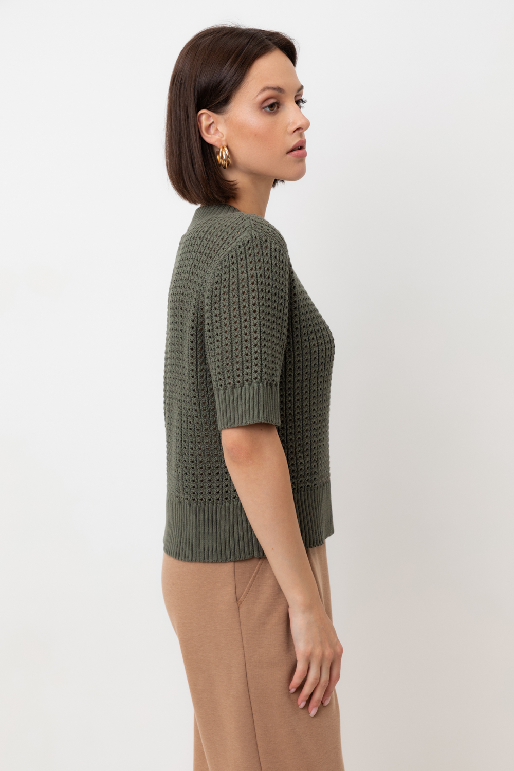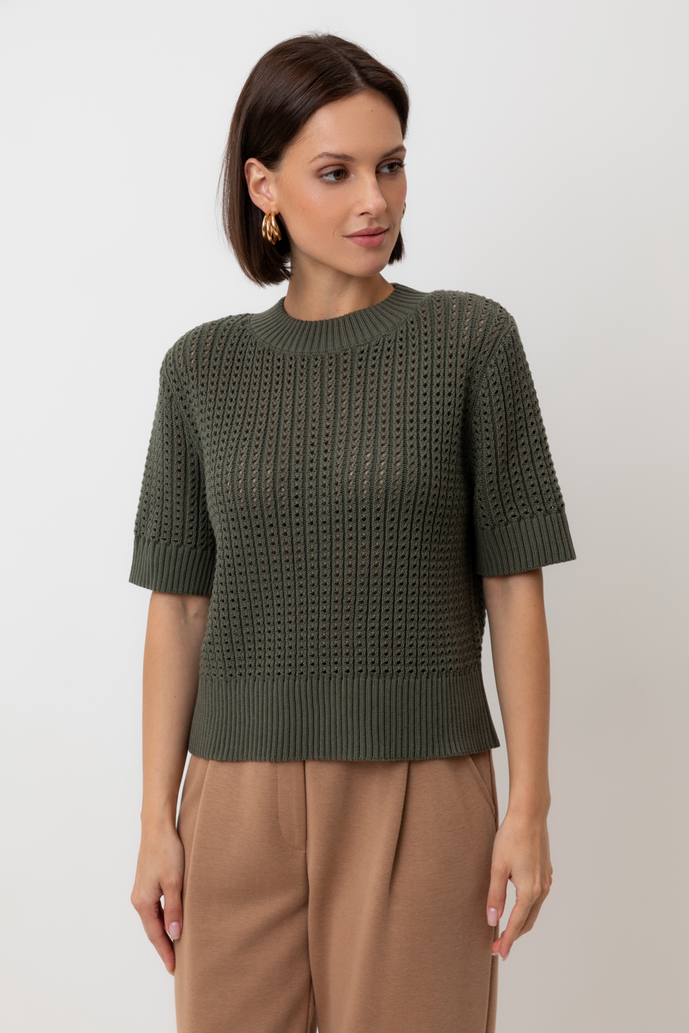Джемпер с коротким рукавом ажурной вязки из итальянского хлопка. Умеренное переплетение, хлопок в составе придают изделию форму и дают ощущение комфорта во время носки. Незаменим в повседневном летнем гардеробе.