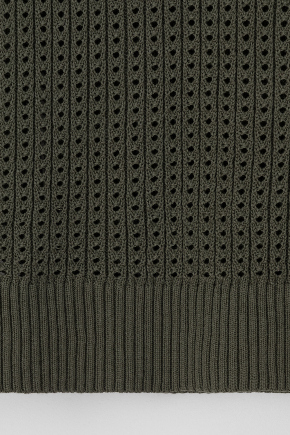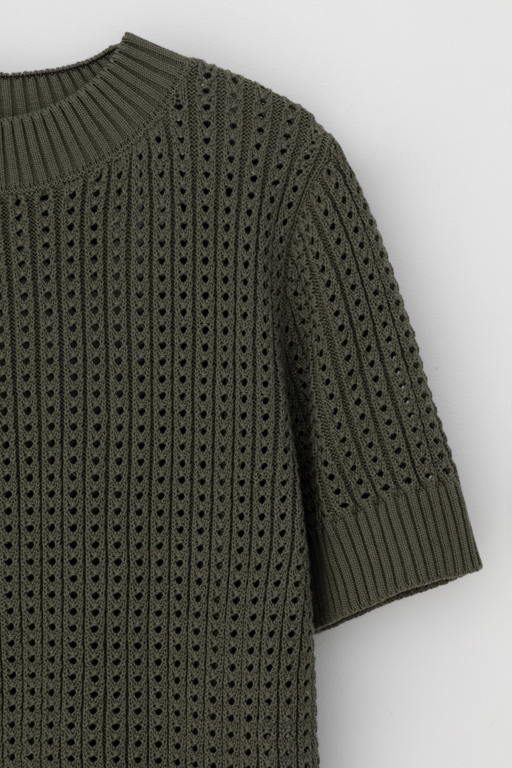 Джемпер с коротким рукавом ажурной вязки из итальянского хлопка. Умеренное переплетение, хлопок в составе придают изделию форму и дают ощущение комфорта во время носки. Незаменим в повседневном летнем гардеробе.