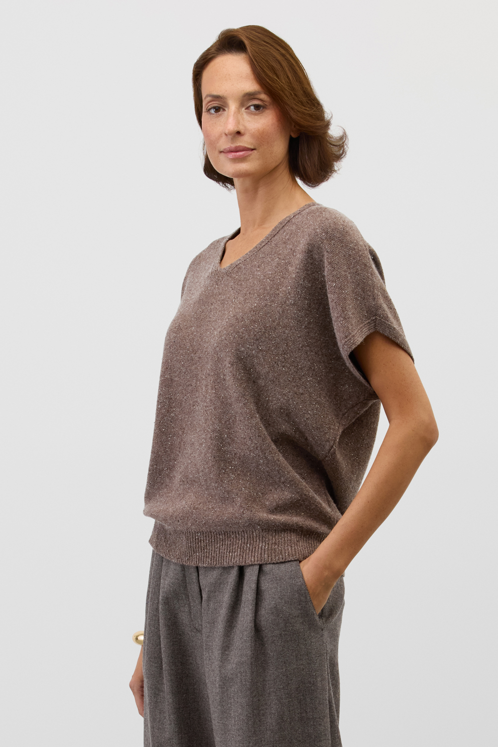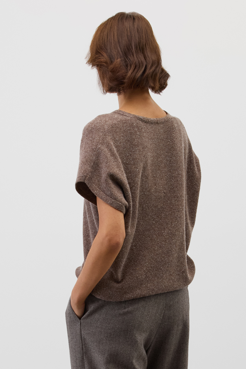 Джемпер с коротким  руковом из уникальной коллекции премиальных изделий, выполненных из итальянской пряжи, включает в себя мягчайшую шерсть мериноса и натуральный шелк. Это идеальное сочетание обеспечивает комфортное прилегание к телу, отличную терморегуляцию, воздухопроницаемость и отсутствие раздражения даже на самой чувствительной коже. Гладкая текстура с изысканными вкраплениями выглядит особенно стильно и современно.