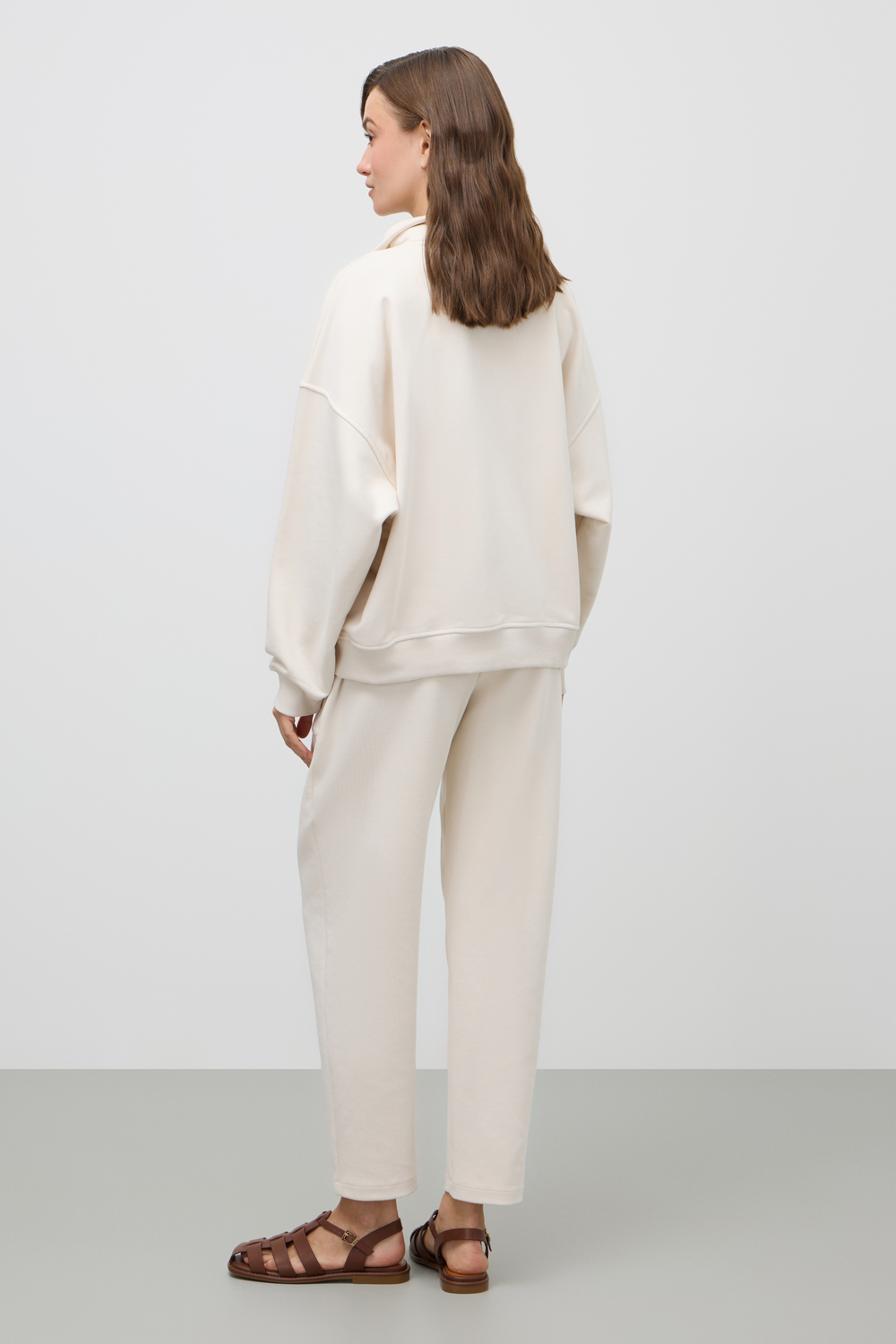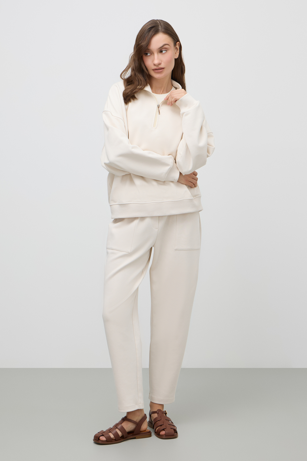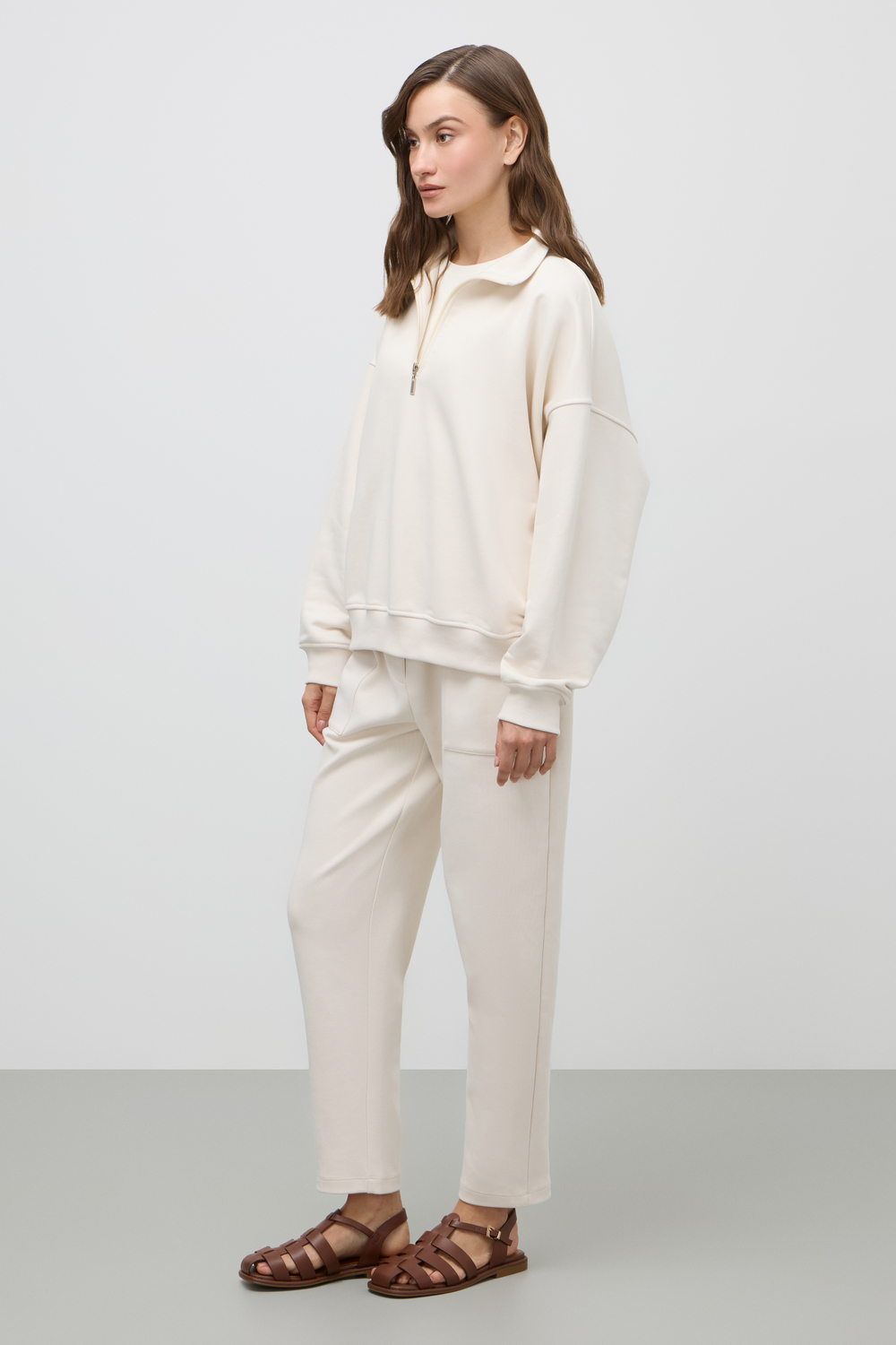 Джемпер с воротником на молнии является лаконичной базой. Комфортный тандем спущенной линии плеч и расслабленного кроя становится стильным дополнением различным образам.