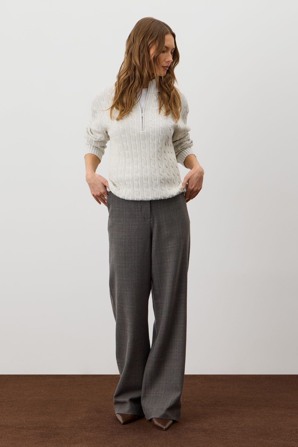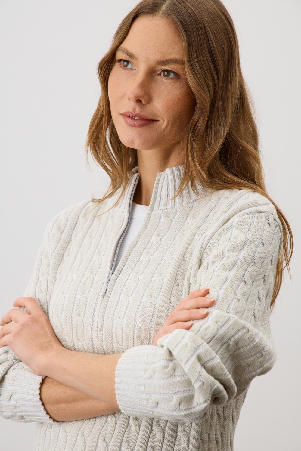 Джемпер с воротником на молнии является лаконичной базой. Комфортный тандем вязки косами и расслабленного кроя становится стильным дополнением различным образам. Джемпер создан из хлопковой пряжи и прошел дополнительную обработку по итальянской технологии, это гарантирует минимальную усадку во время носки. Акрил в составе не позволяет изделию пилинговаться.