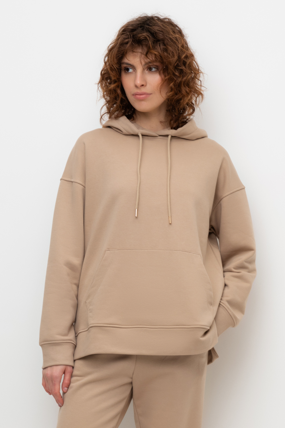 Трикотажная толстовка-оверсайз из петельчатого футера трехнитки. Капюшон регулируется с помощью шнура. У изделия свободная посадка, карман-кенгуру, эластичные манжеты. По бокам разрезы. Гладкий и плотный материал на основе хлопка сохраняет форму.