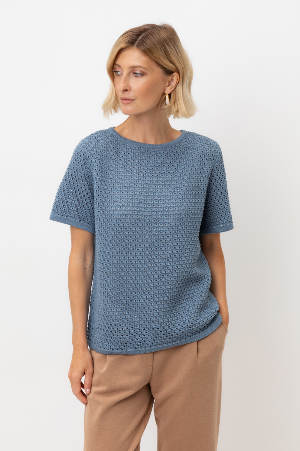Джемпер с коротким рукавом ажурной вязки из итальянского хлопка. Умеренное переплетение, хлопок в составе придают изделию форму и дают ощущение комфорта во время носки. Незаменим в повседневном летнем гардеробе.