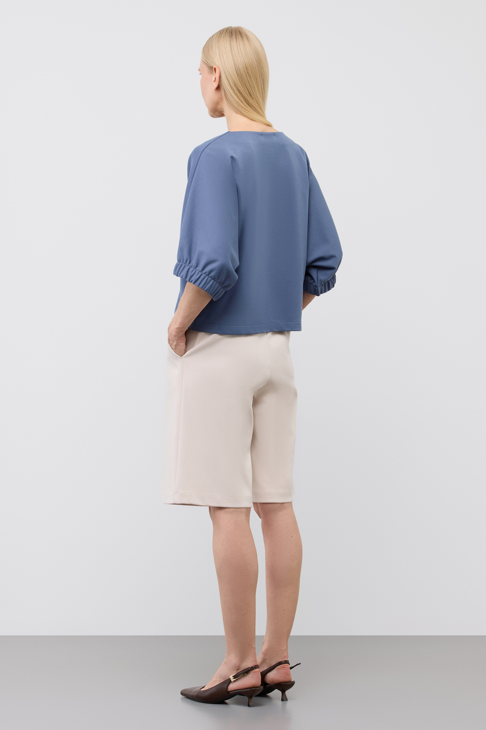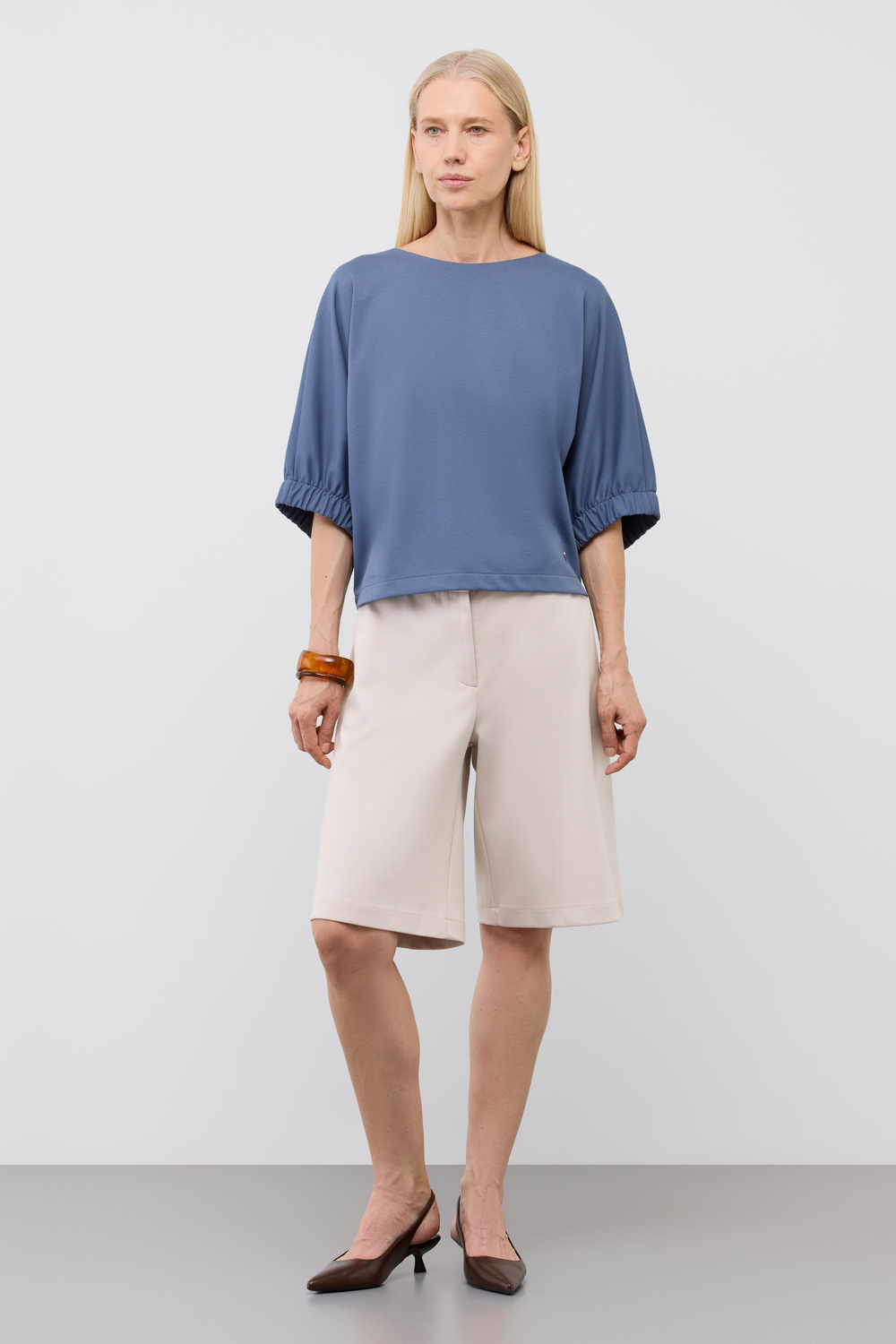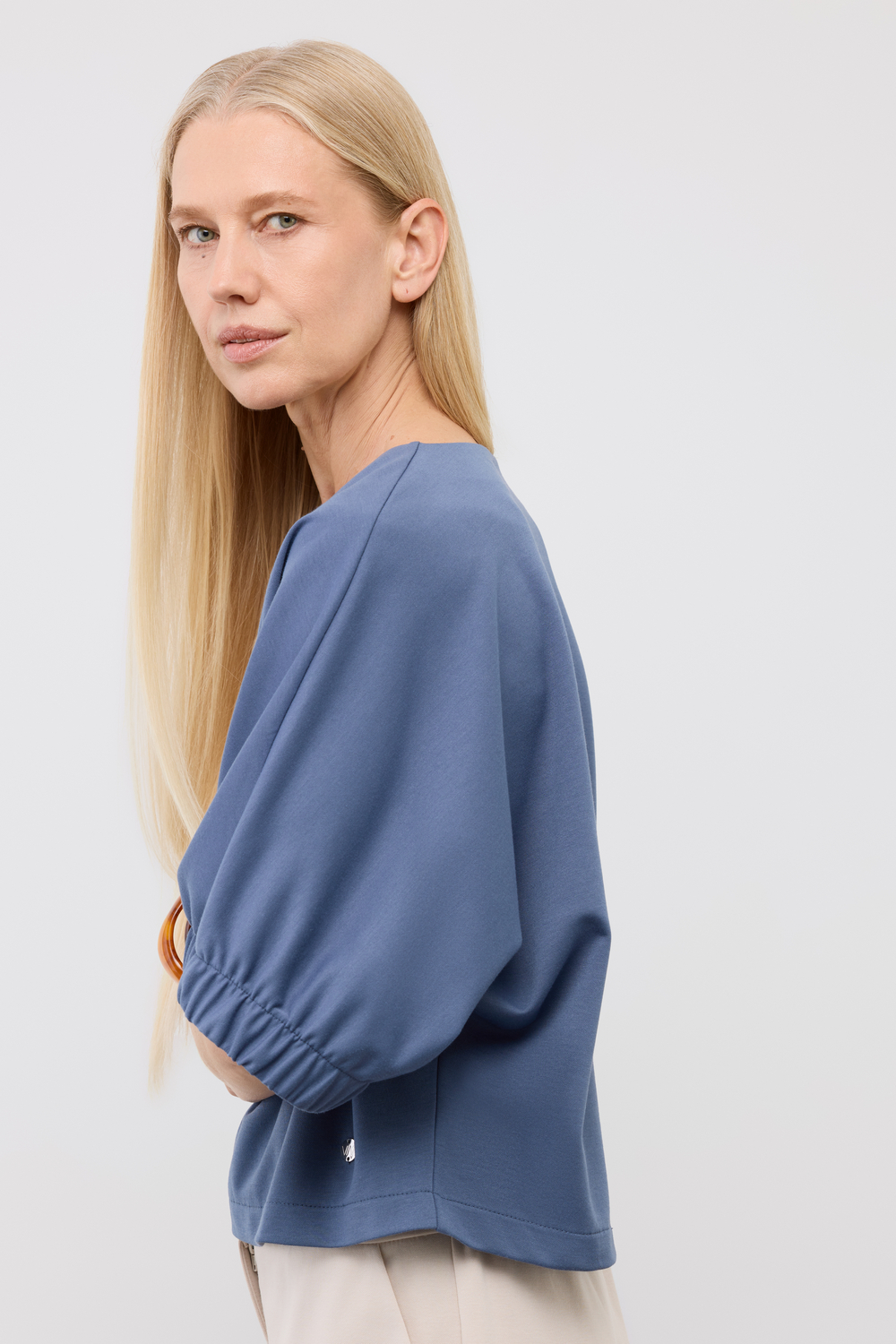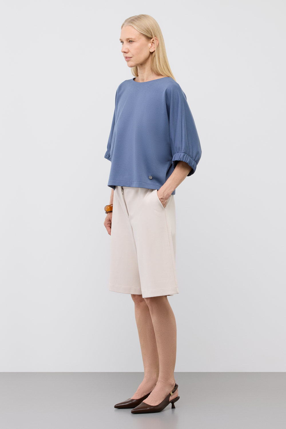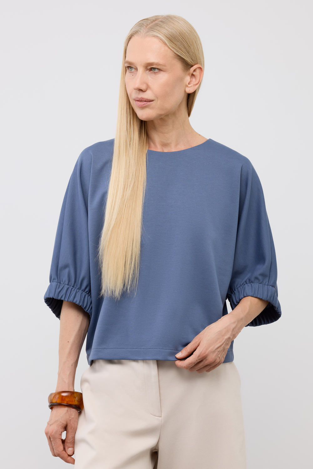 Джемпер из премиального хлопка. Объемные укороченные рукава придают образу расслабленность и легкость, позволяя сочетать его как в повседневных, так и в более элегантных образах.