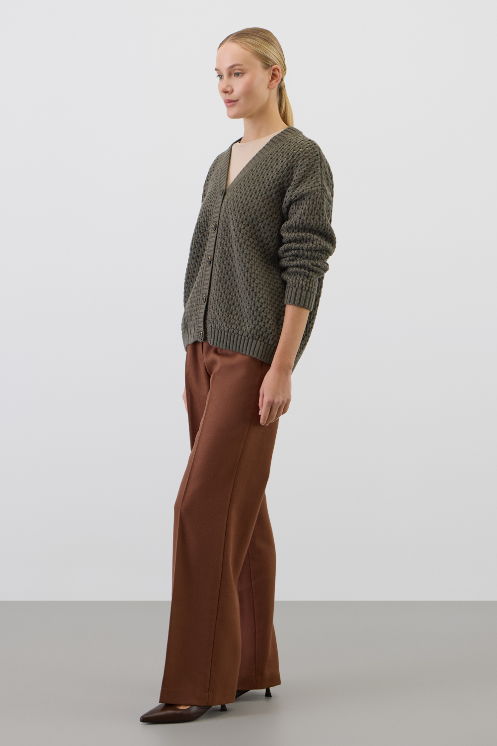 Мягкий  кардиган из ажурной вязки, выполненный из первоклассного материала, сочетает в себе шерсть и акрил, что создает атмосферу комфорта. Он приятно облегает тело, не вызывает дискомфорта и прекрасно сохраняет свою форму.