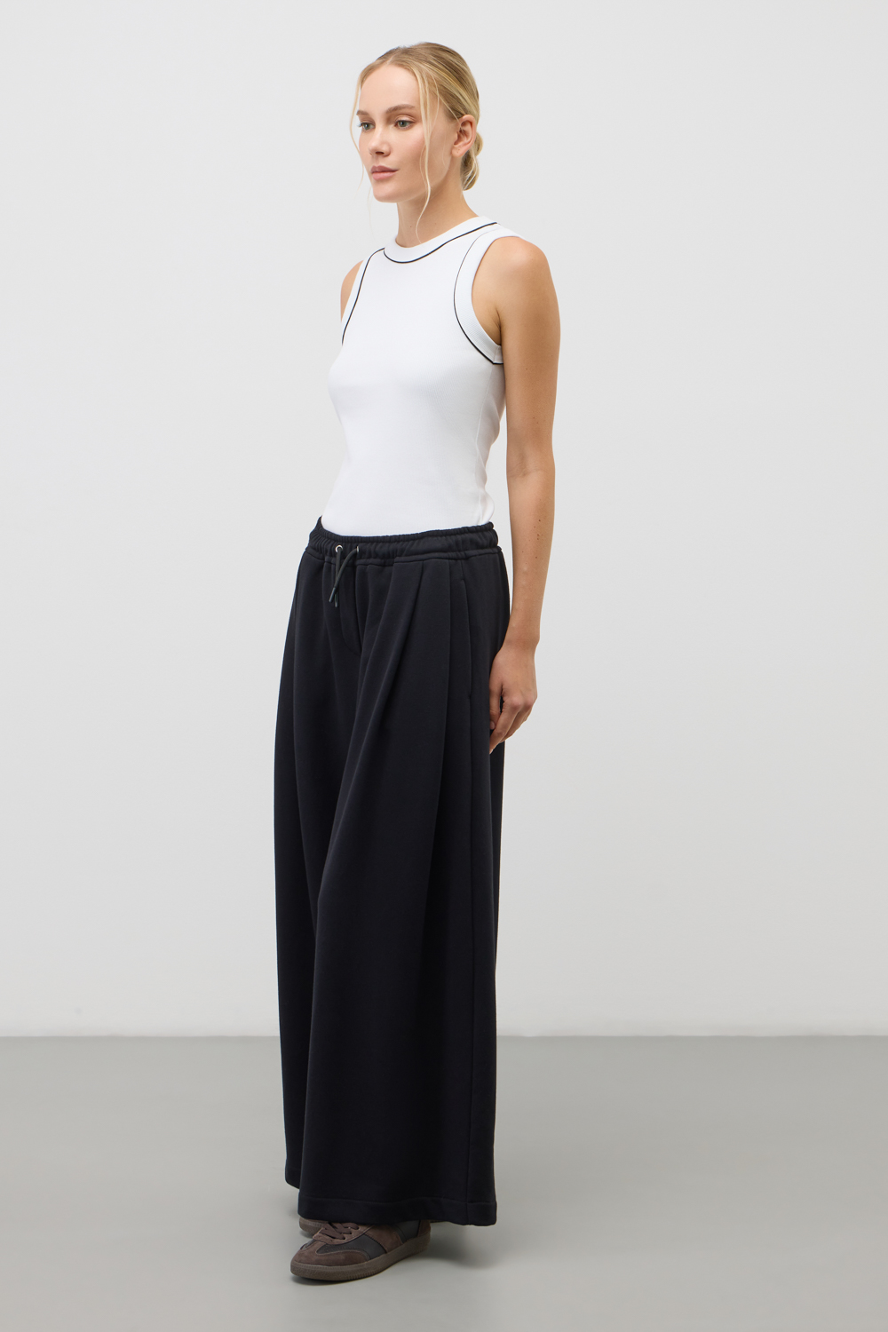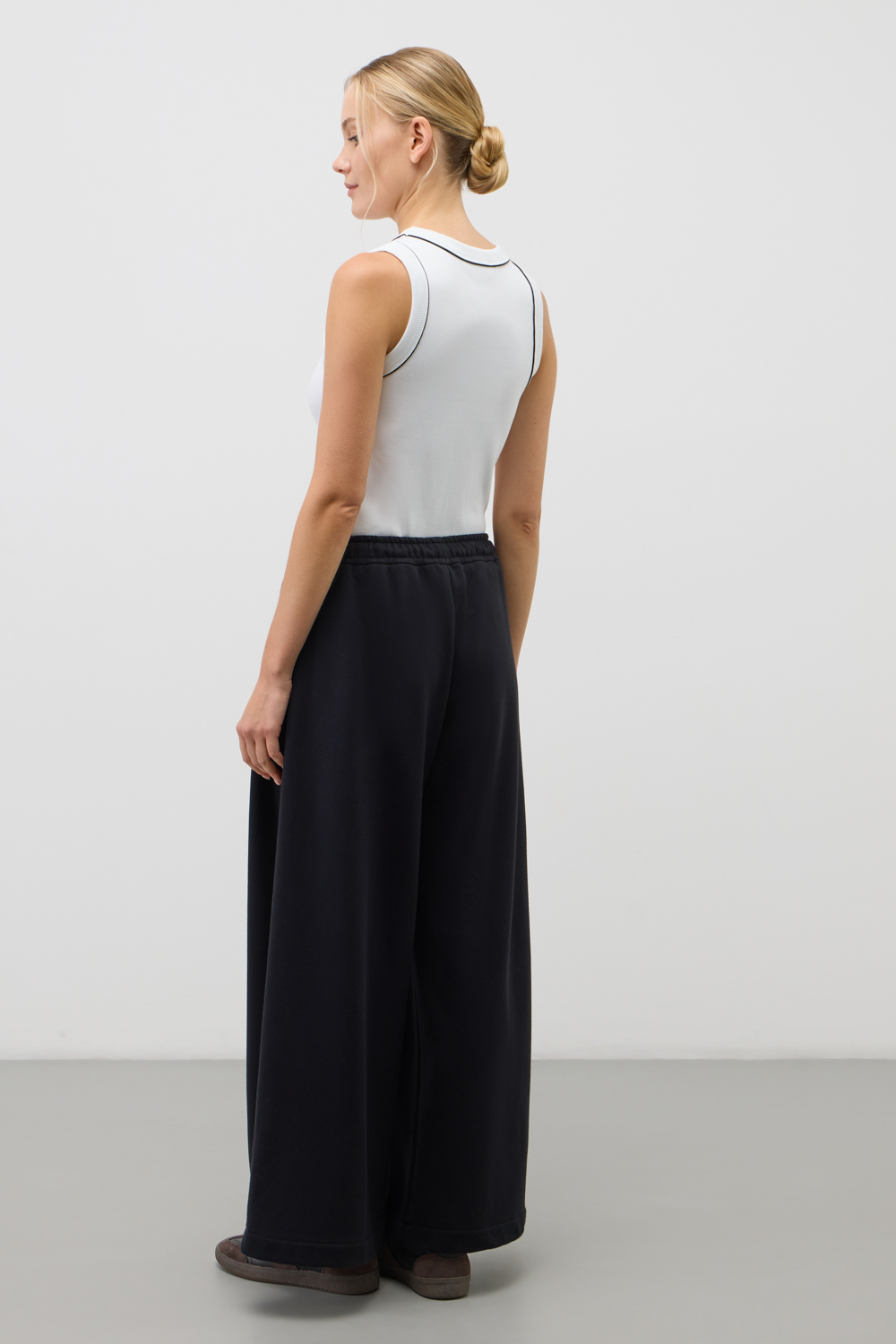 Классическим элементом гардероба является базовый топ в рубчик. Дополняет изделие отделка атласным кантом. Широкие бретели и высокий вырез делают топ комфортным в носке и универсальным в повседневной жизни.