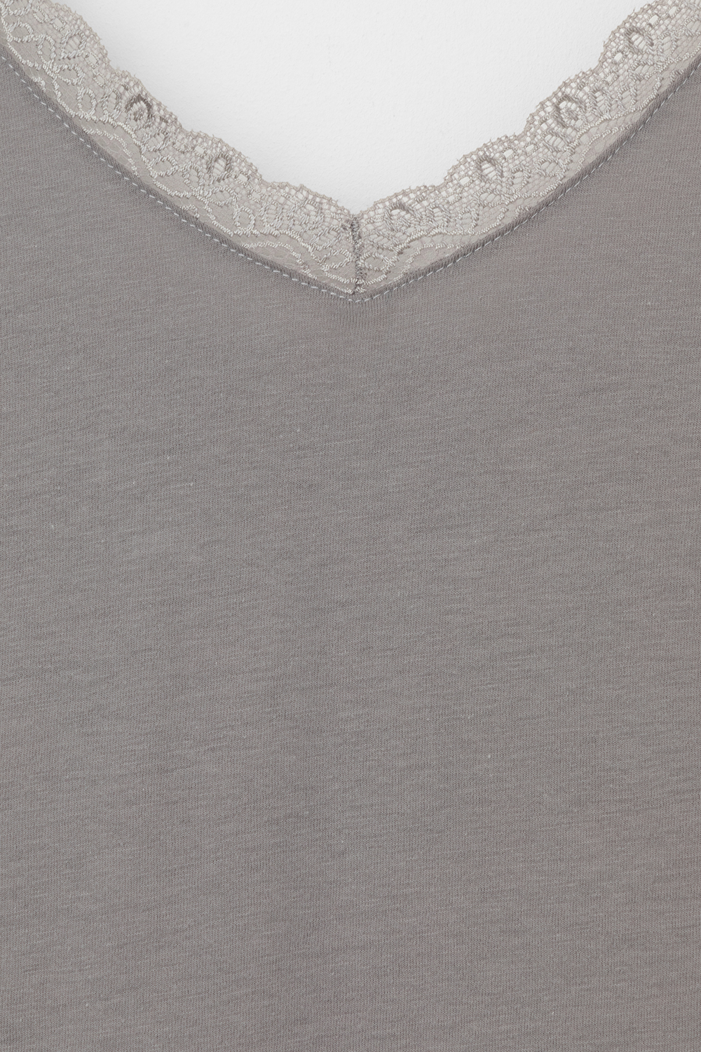 Легкий комплект приглушенного зеленого оттенка выполнен из хлопка с нежнейшим модалом. Свободный крой топа декорированный эластичным кружевом и мягкий пояс шорт обеспечивают легкость и свободу движений.