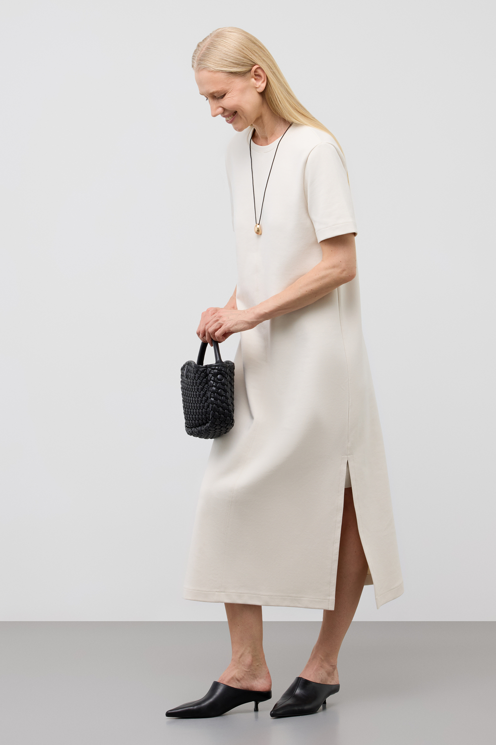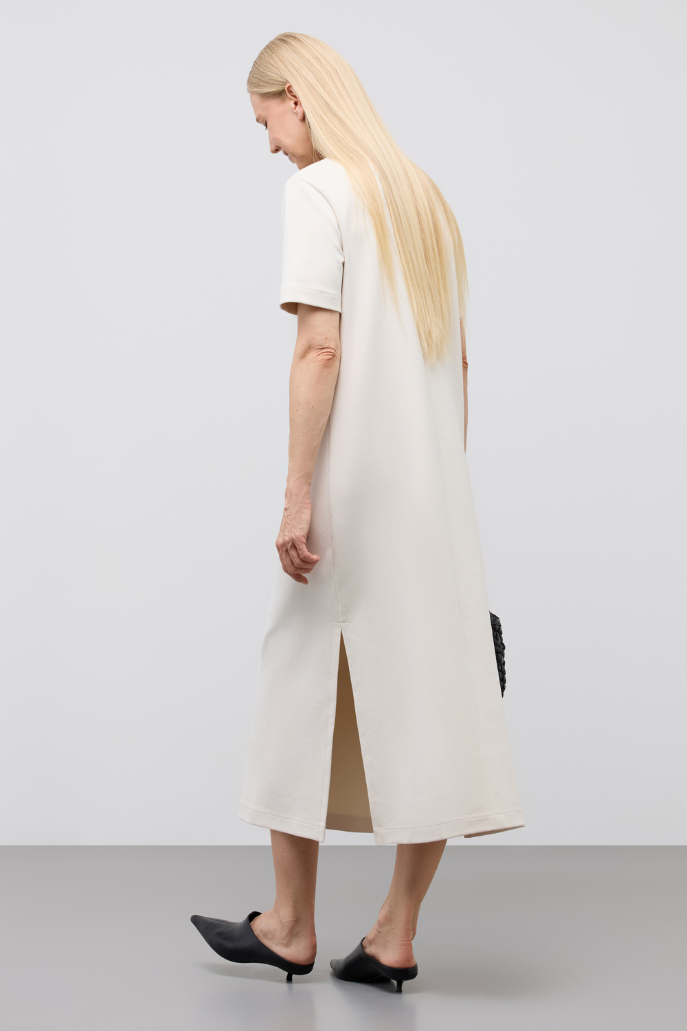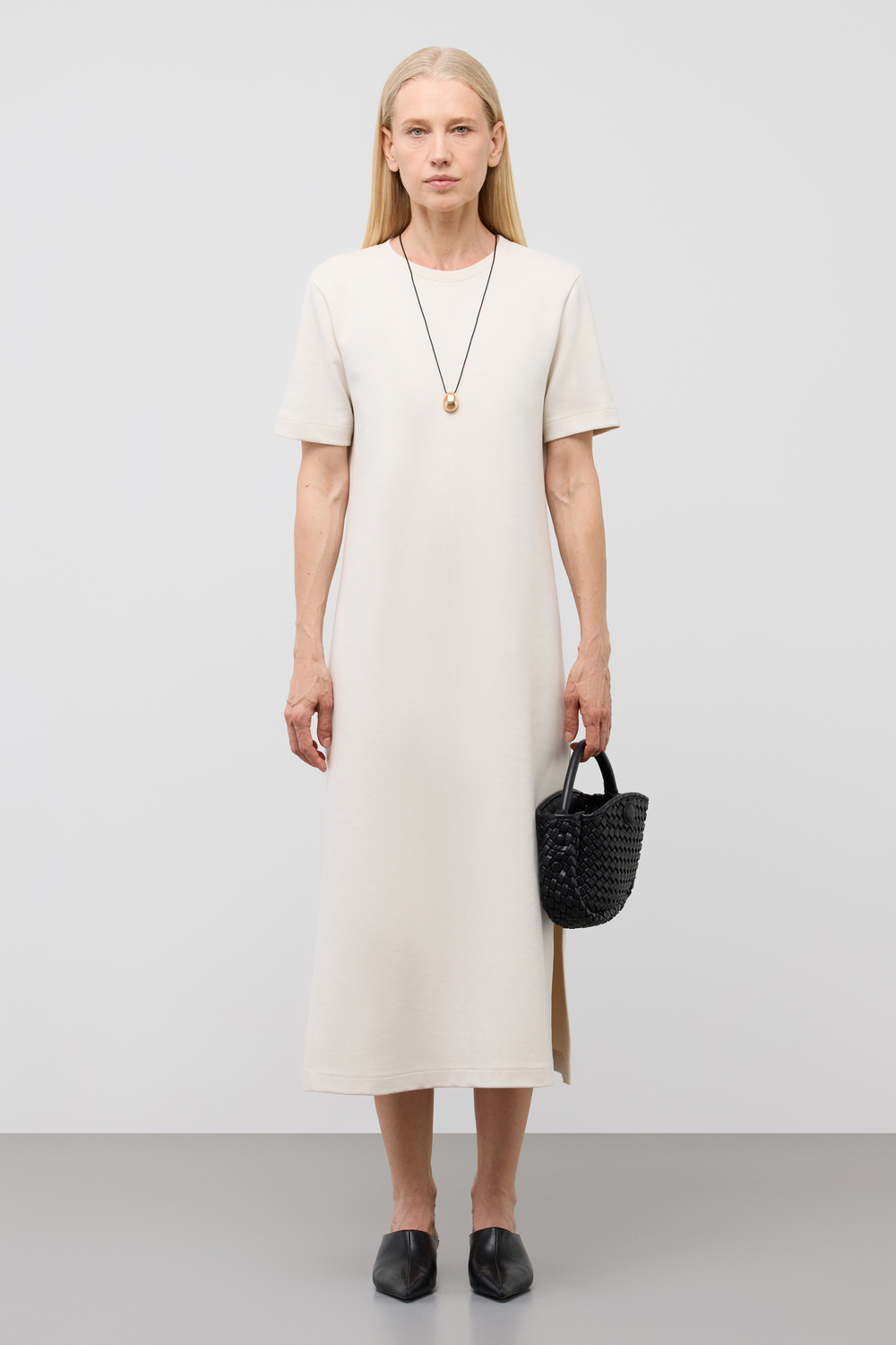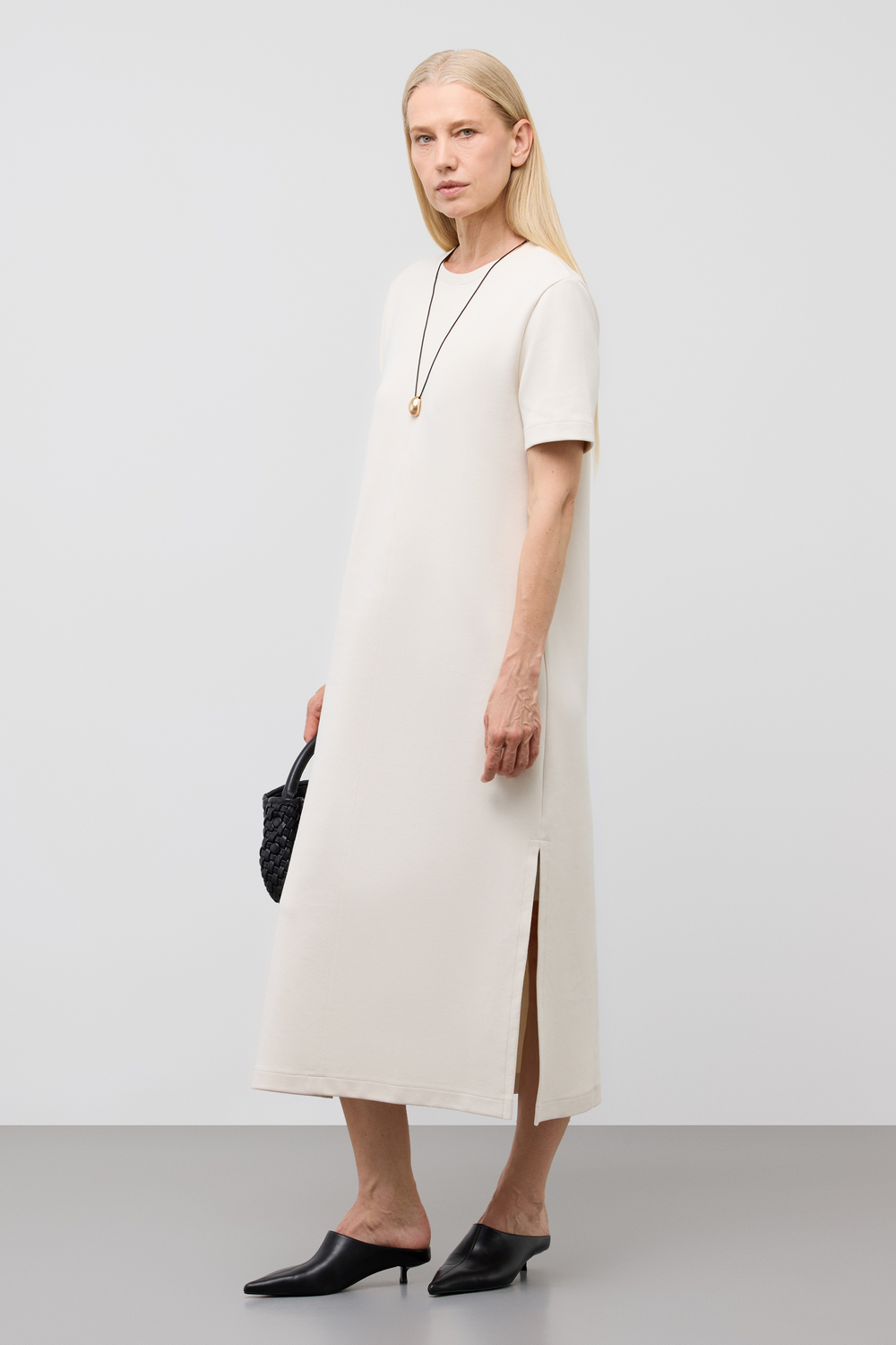 Летящий силуэт платья дополняет широкий отстроченный шов, который проходит по всей длине, добавляя динамики изделию. Отсутствие застежек и высокие разрезы по бокам делает платье еще более удобным. Платье изготовлено из премиального трикотажа DOUBLE FACE.