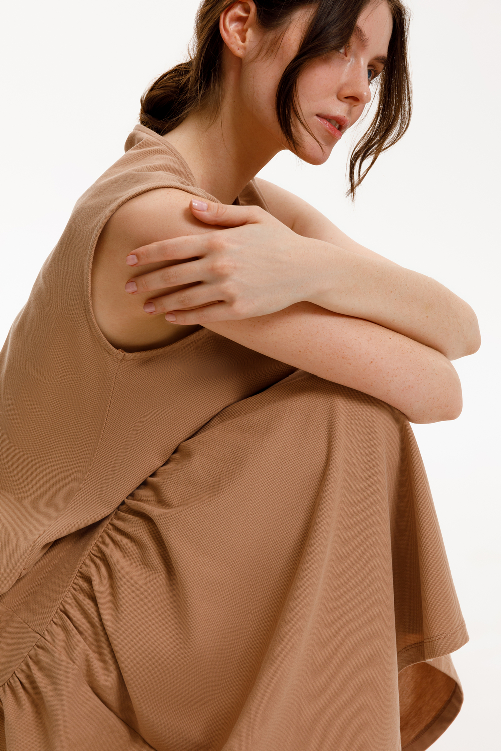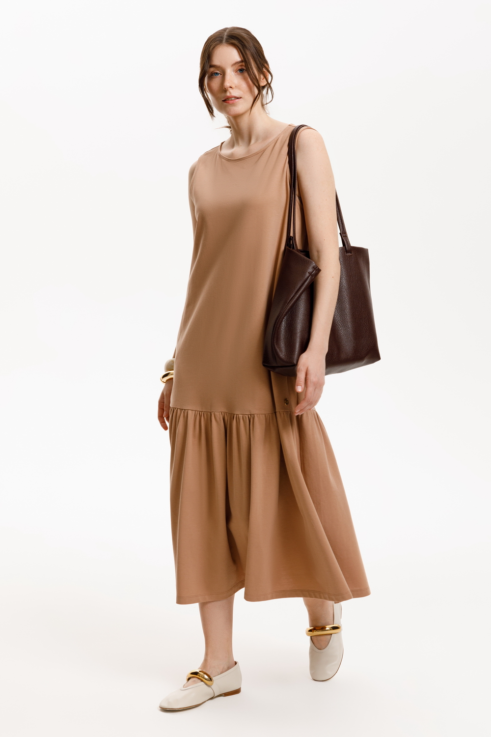 Стильный летний сарафан в трендовом оттенке выполнен из трикотажа с легкой рельефной фактурой, а 100% хлопок в составе дарит ощущение комфорта. Боковые карманы добавляют изделию функциональности.