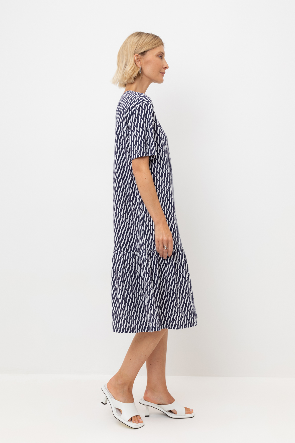 Летнее трикотажное платье из 100% хлопка с легкой текстурой пике, дарит невероятное ощущение комфорта и легкости.  Спущенное плечо и карманы в боковых швах добавляют изделию спортивный образ.