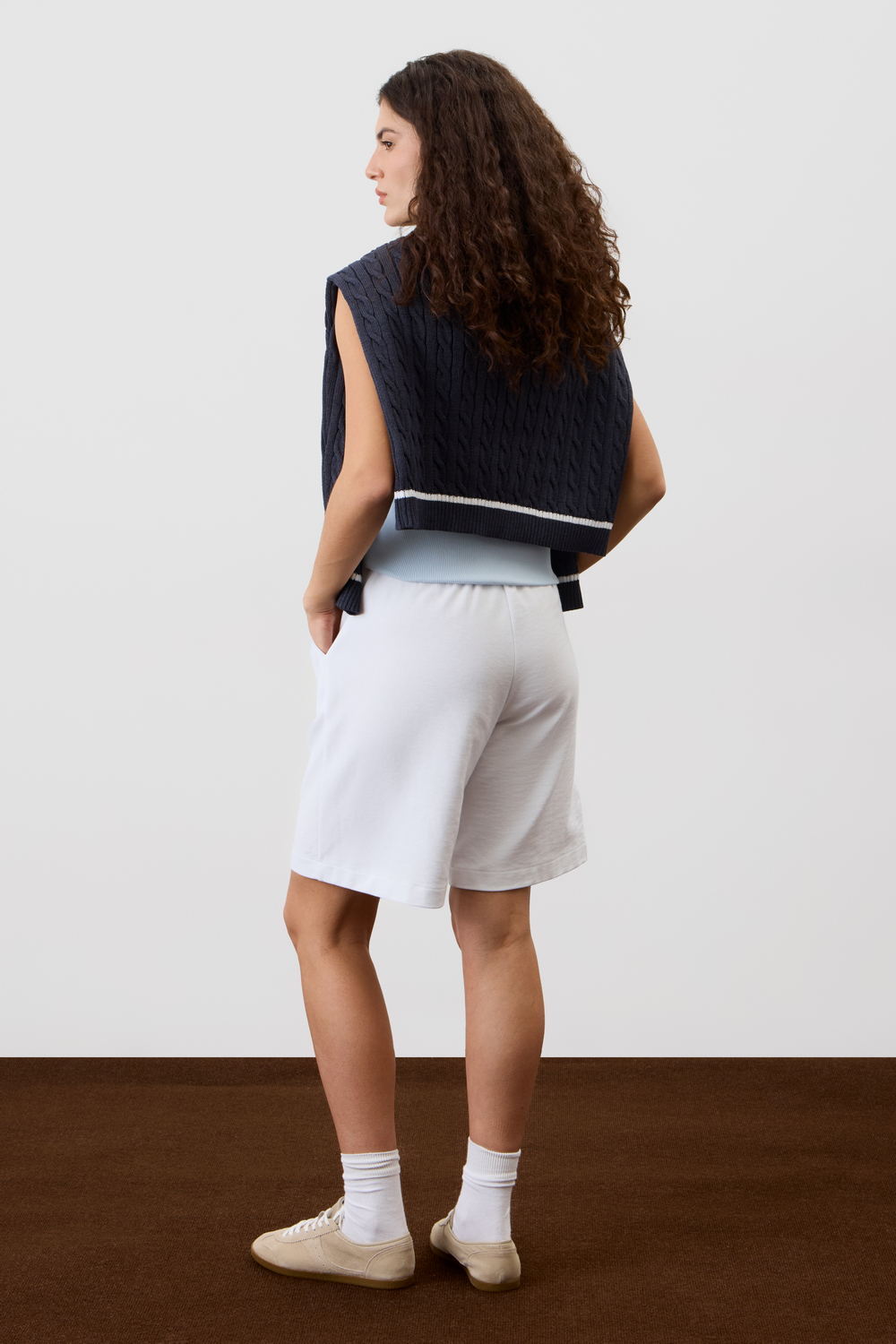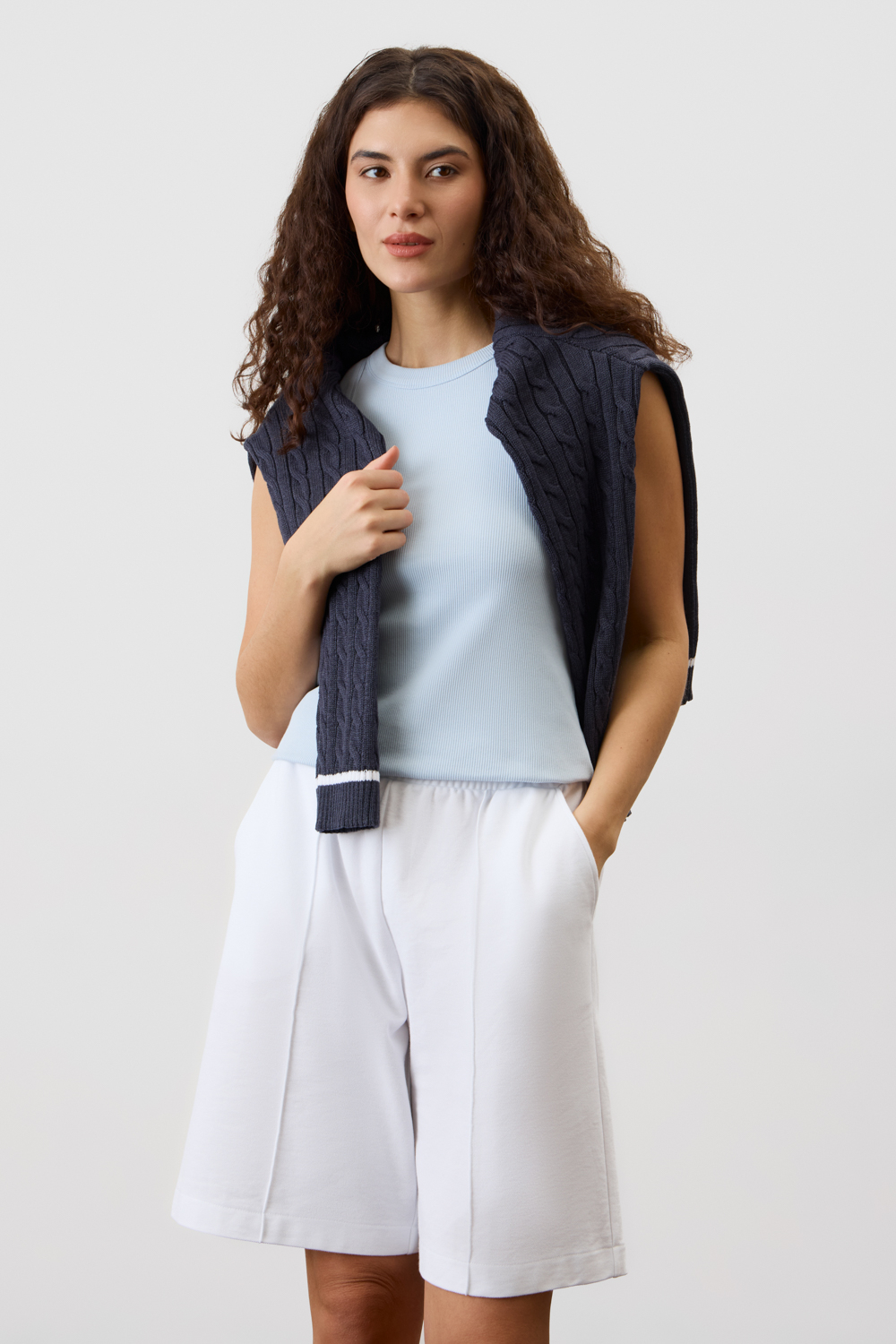 Шорты со стрелками свободного силуэта изготовленные из легкого  трикотажа пике. Удобный пояс с эластичной резинкой внутри и карманы придают шортам практичность и функциональность, а комфортная длина и наличие стрелок позволит носить изделие как во время отдыха, так и в официальной обстановке.