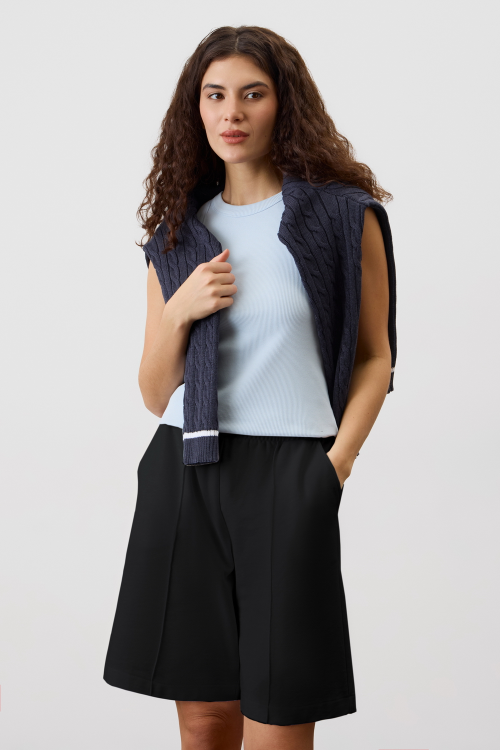 Шорты со стрелками свободного силуэта изготовленные из легкого  трикотажа пике. Удобный пояс с эластичной резинкой внутри и карманы придают шортам практичность и функциональность, а комфортная длина и наличие стрелок позволит носить изделие как во время отдыха, так и в официальной обстановке.