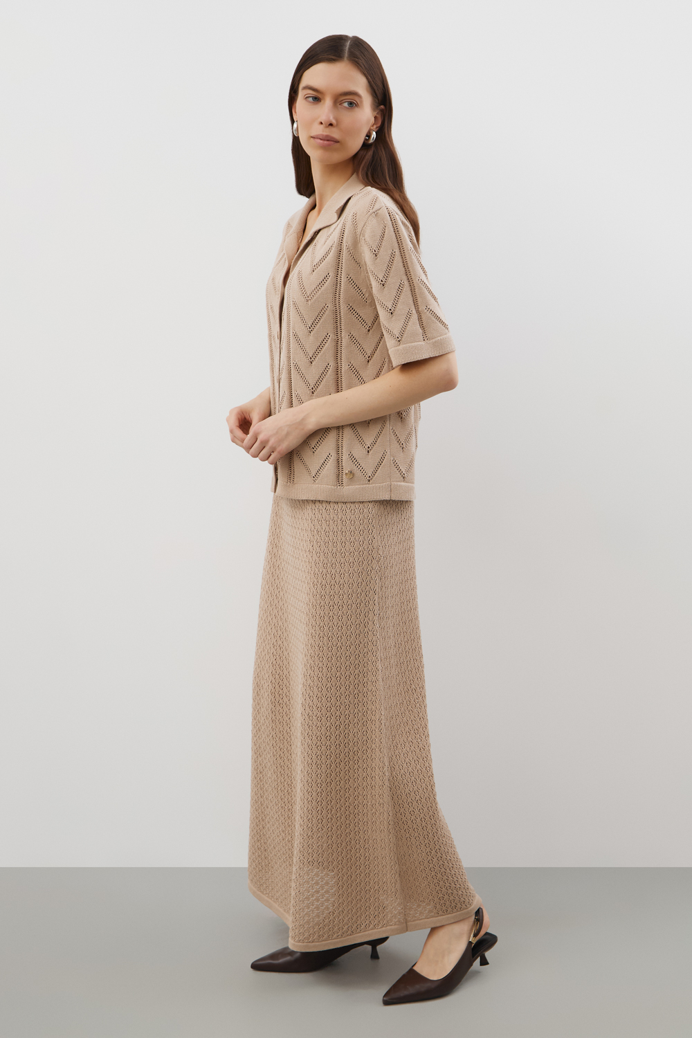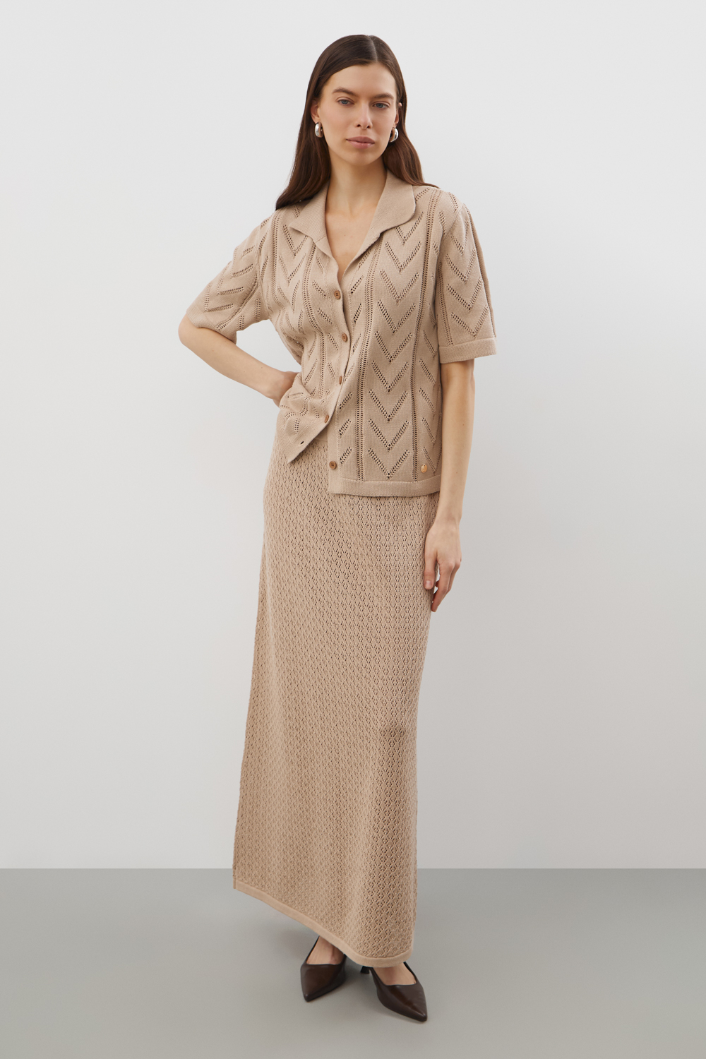 Ажурная юбка из хлопковой пряжи отражает классический стиль. Дополняет изделие внутренний невесомый подклад из премиального бифлекса телесного цвета. Юбка прошла дополнительную обработку по итальянской технологии, это гарантирует минимальную усадку во время носки. Акрил в составе не позволяет изделию пилинговаться.