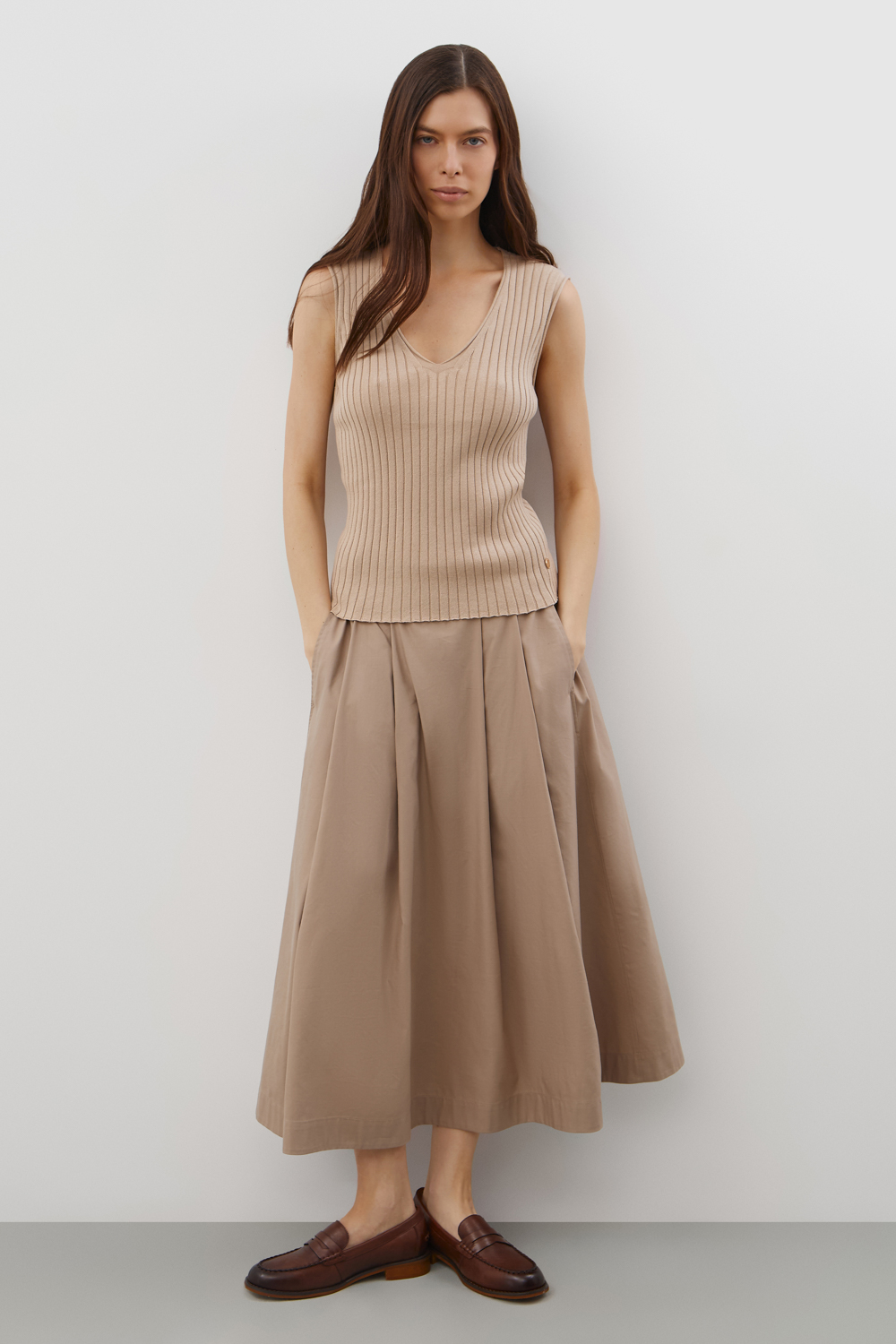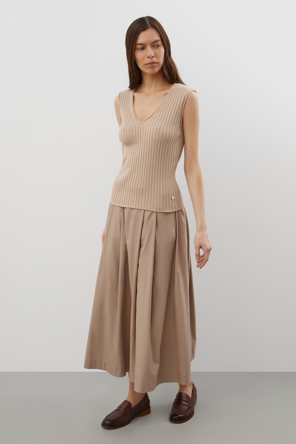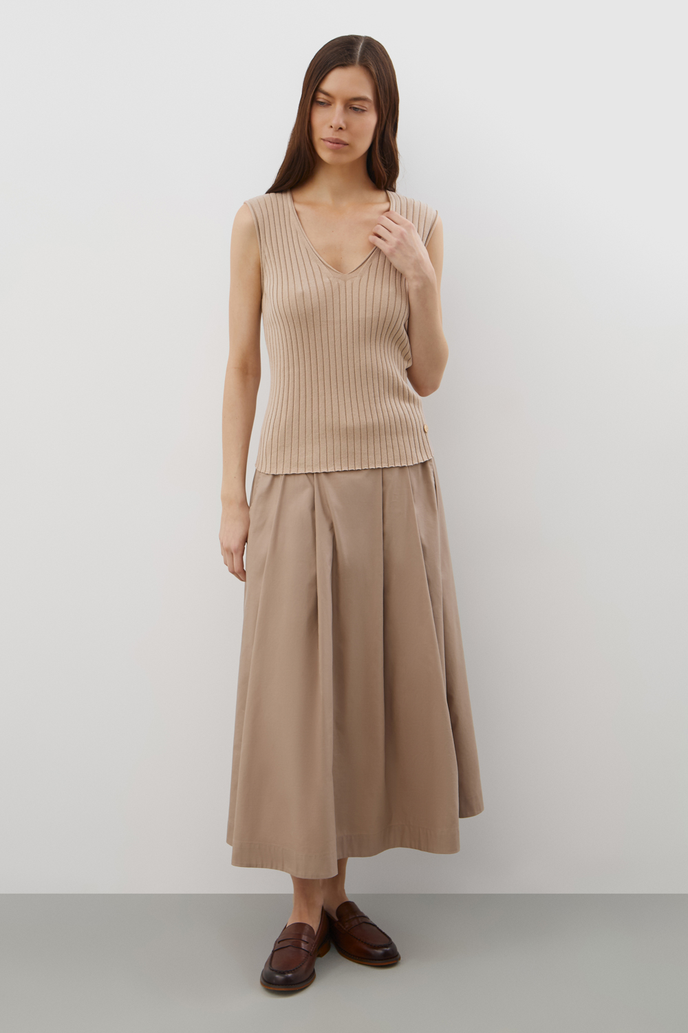 Топ выполнен из хлопковой пряжи. Лаконичный стиль топа позволяет сочетать его в разных образах. Изделие прошло дополнительную обработку по итальянской технологии, это гарантирует минимальную усадку во время носки. Акрил в составе не позволяет изделию пилинговаться.