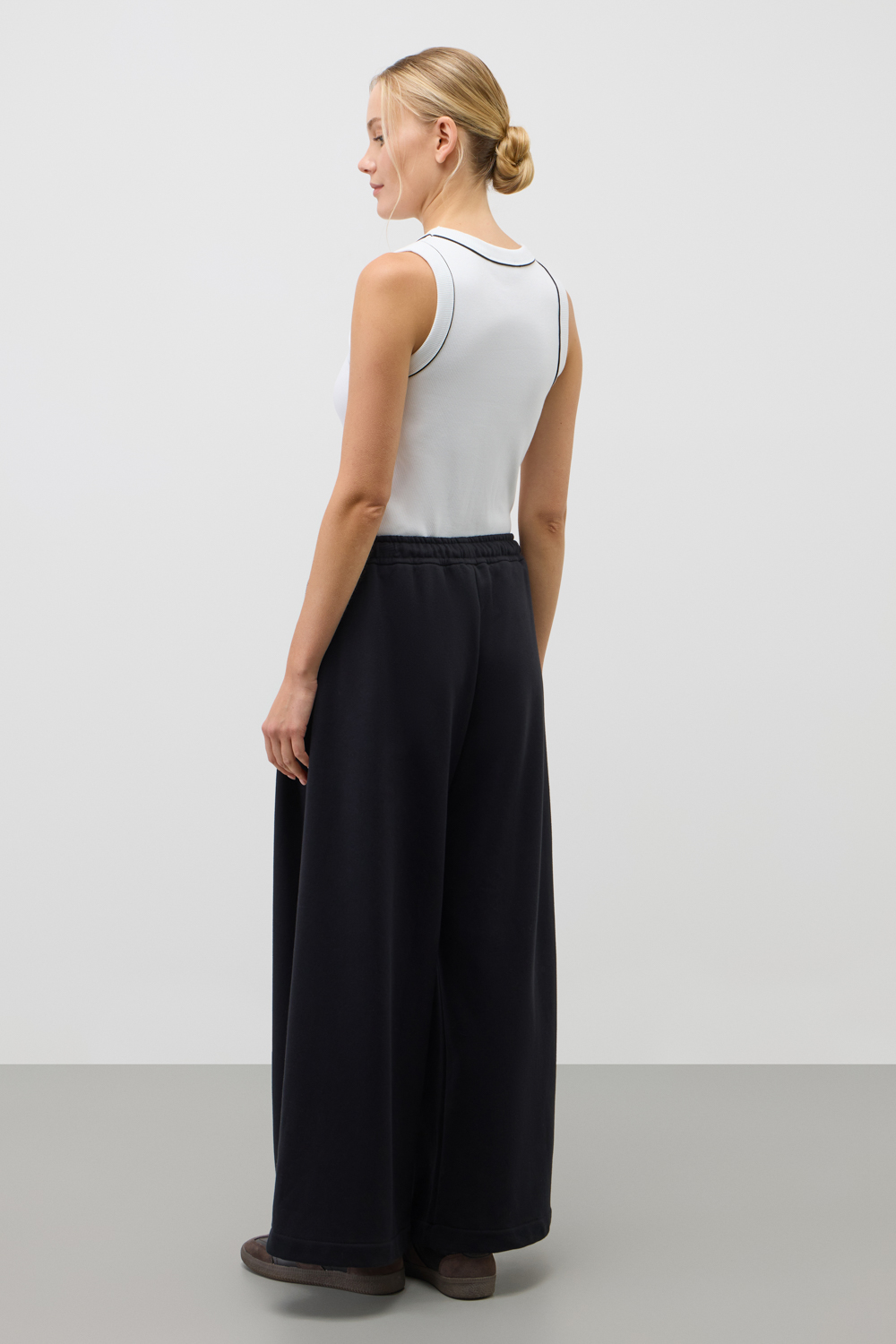 Широкие брюки из футера со складками станут стильным дополнением в гардеробе. Широкий крой придает расслабленности образу и комфорт в движении. Изделие дополняют функциональные карманы