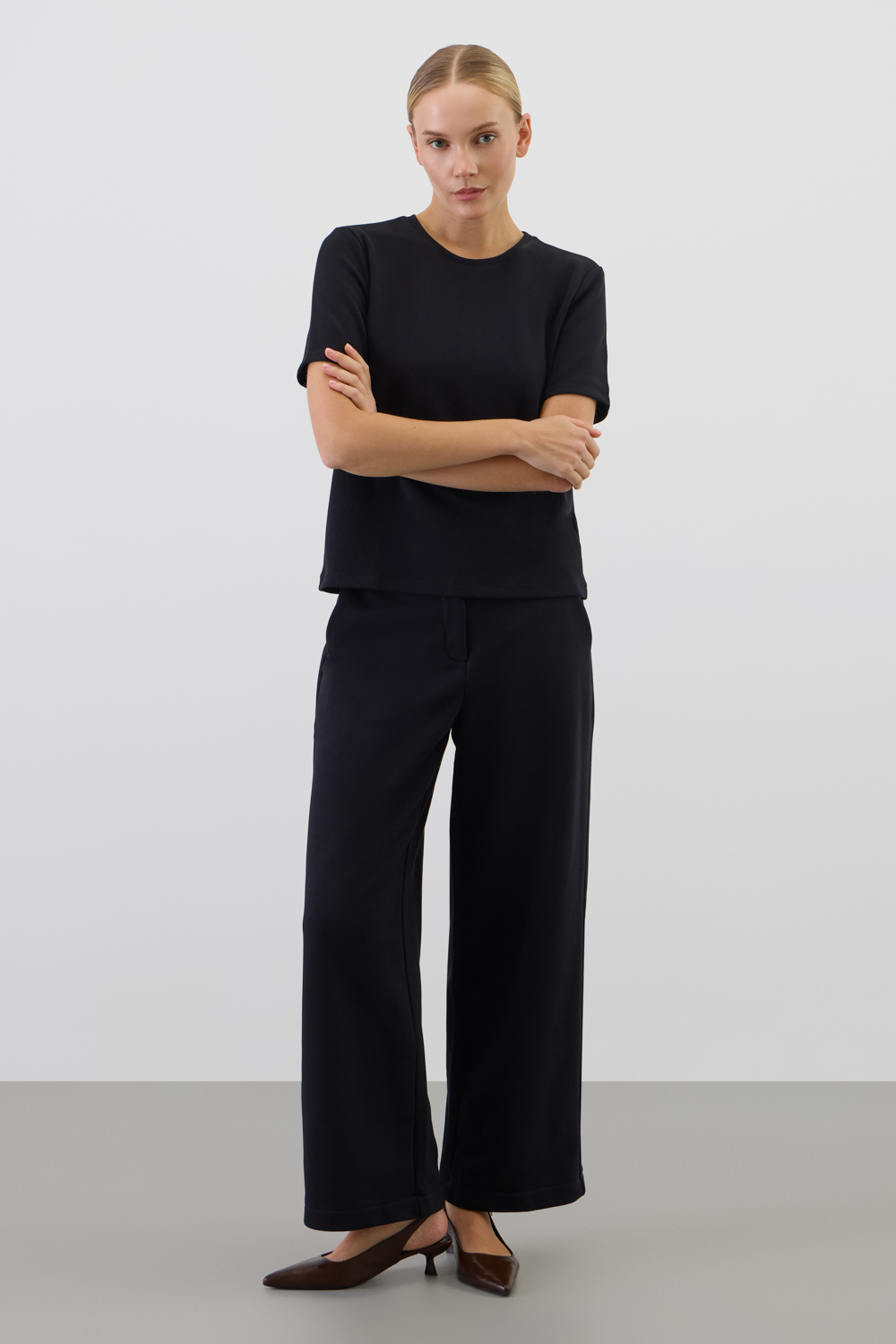 Брюки, выполненные из петельчатого футера трехнитки, отличаются особой текстурой и комфортом. Прямой крой подчеркивает силуэт, создавая классический образ. Боковые карманы придают изделию функциональность.