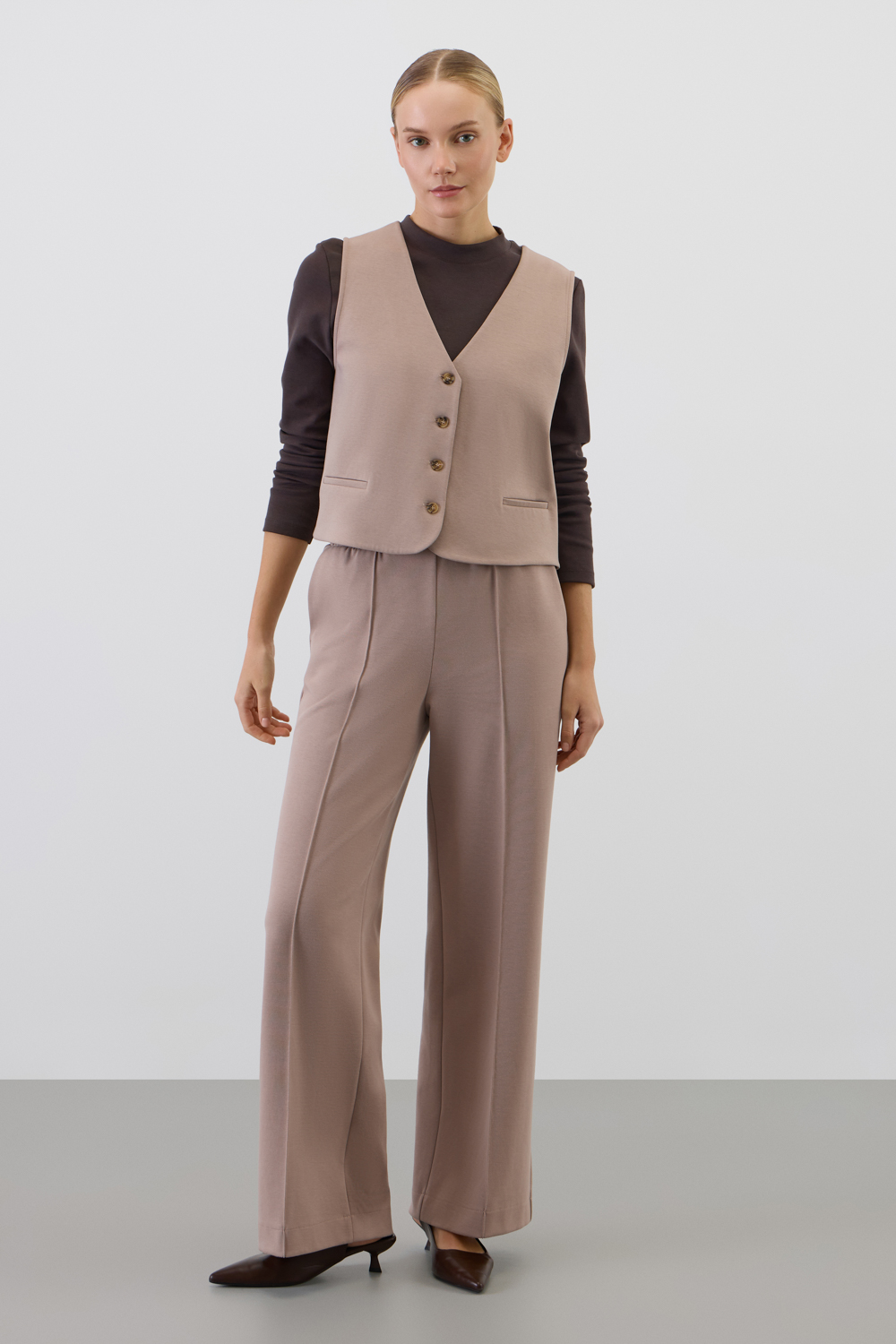 Брюки прямого кроя на резинке изготовлены из высококачественного трикотажного полотна DOUBLE FACE. Трикотаж прошел специальную каучуковую обработку, что придает ему легкость и шелковистую текстуру. Прямой крой вытягивает силуэт, формируя элегантный классический образ. Боковые карманы добавляют изделию практичности.