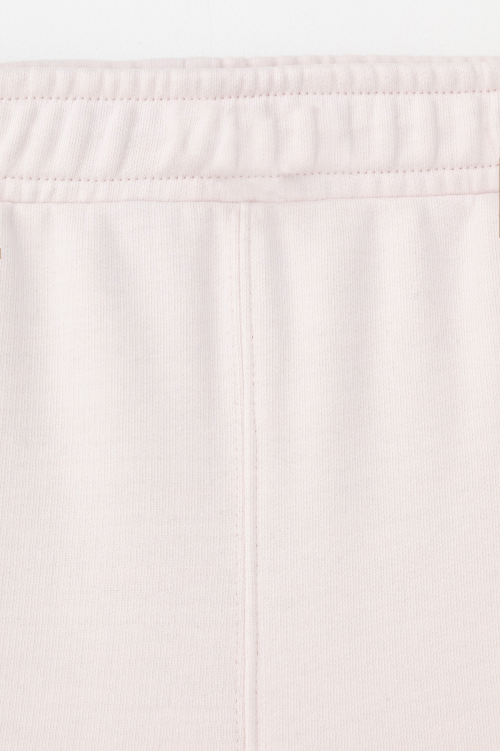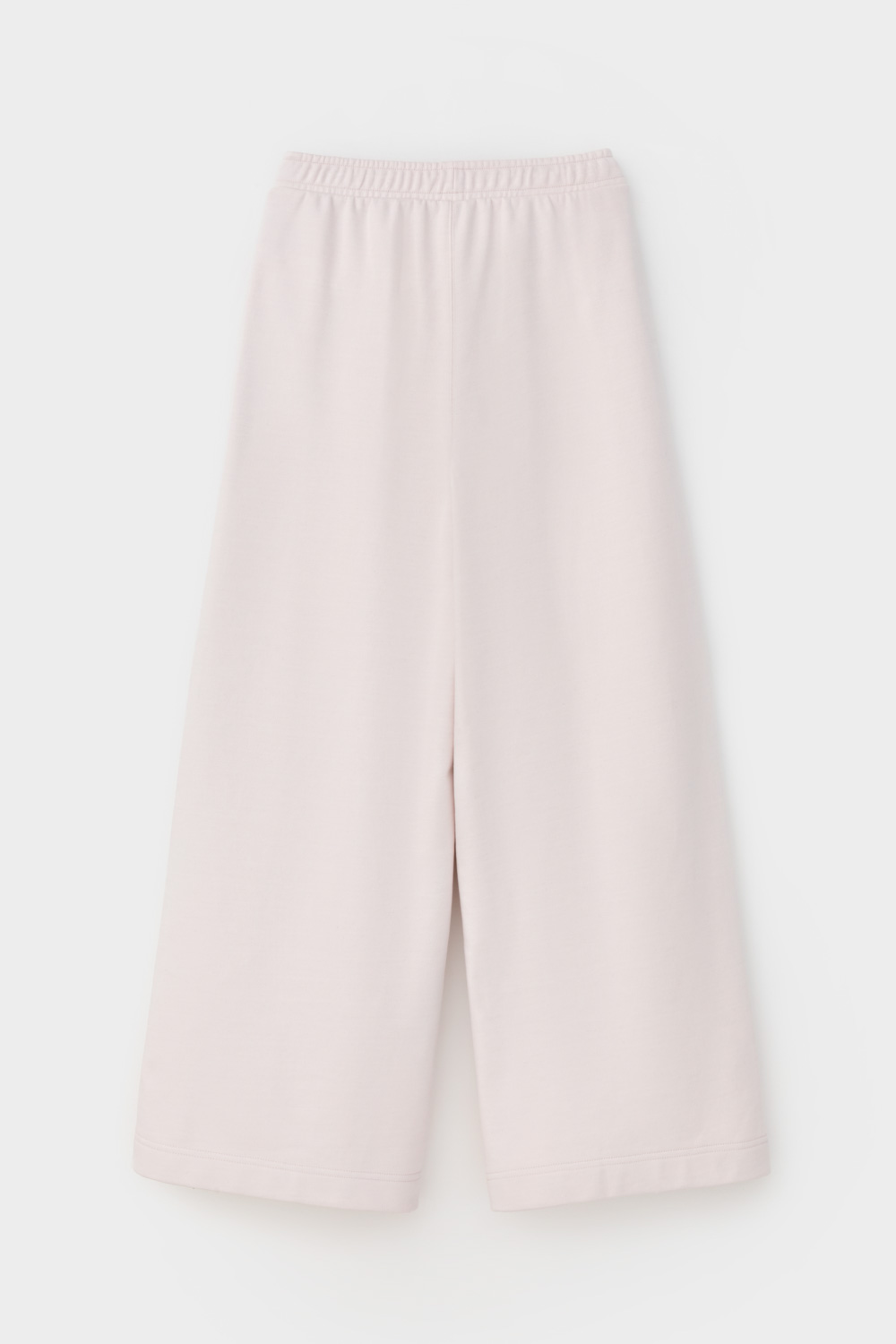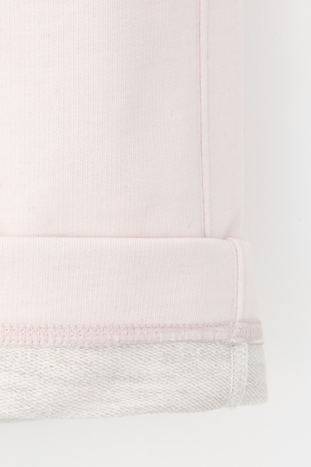 Брюки свободного силуэта со стрелками из мягкого двухцветного футера. Внутренняя сторона изделия представлена в натуральном цвете хлопка, внешняя в нежно-розовом. За счет использования крашенной пряжи, данный вид полотна прошел минимальную обработку, что придало изделию мягкость и шелковистость.