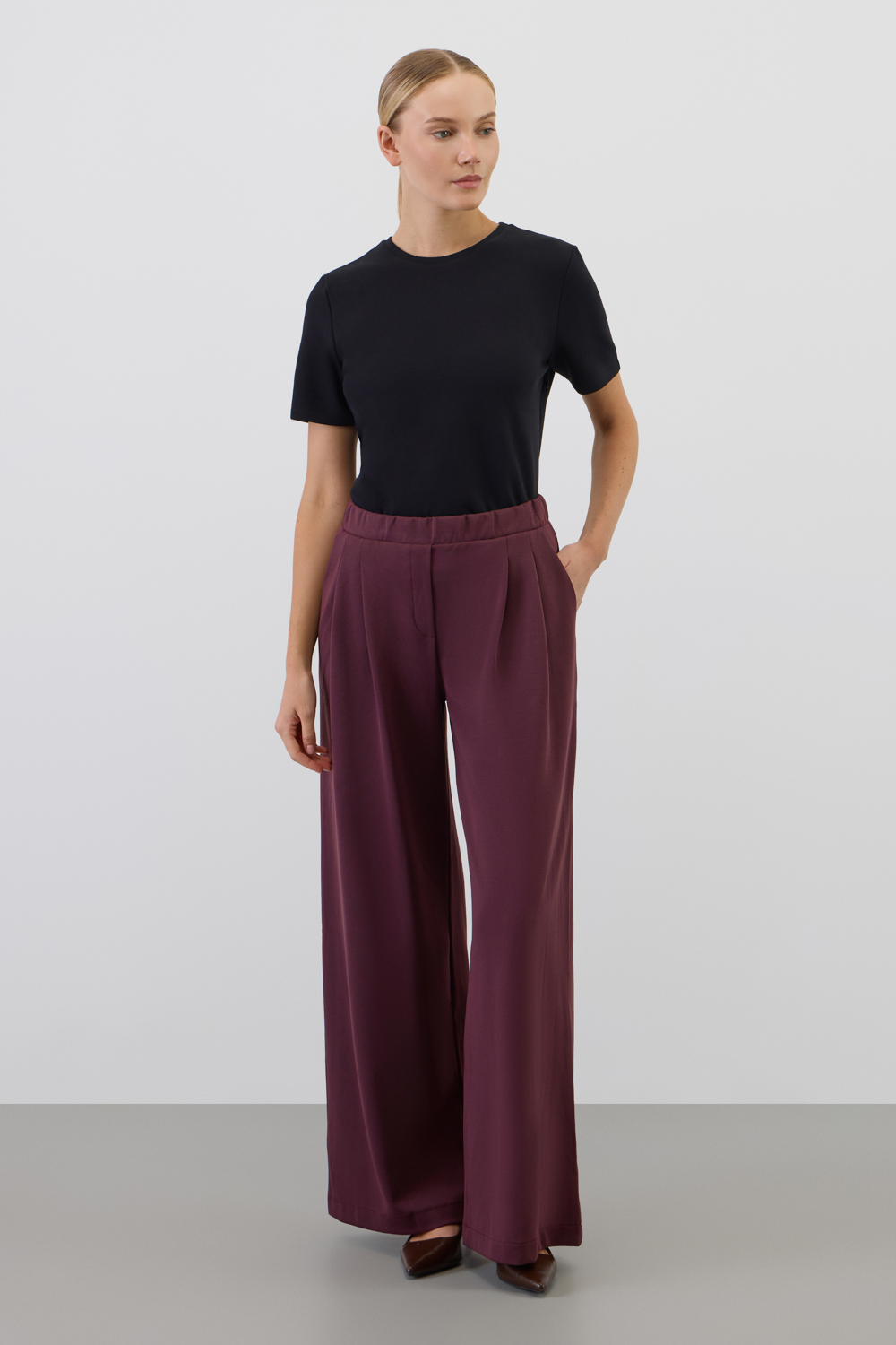 Брюки прямого кроя с защипами изготовлены из высококачественного трикотажного полотна DOUBLE FACE с добавлением спандекса. Ткань прошла каучуковую обработку, что придает ей легкость и шелковистую текстуру. Прямой крой акцентирует силуэт, формируя элегантный классический образ. Боковые карманы добавляют изделию практичности.