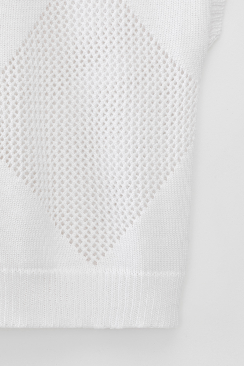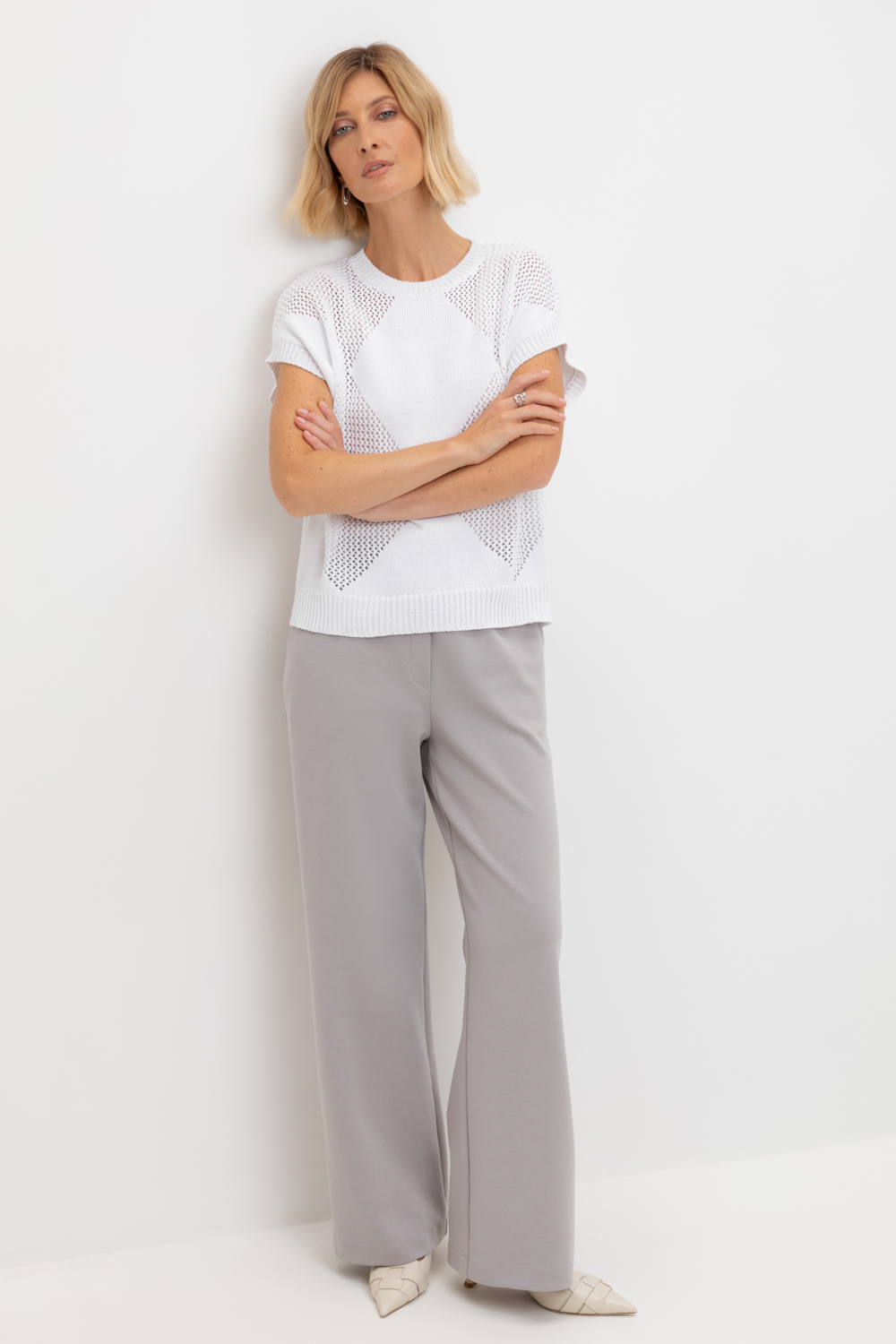 Джемпер со спущенным плечом ажурной вязки из итальянского хлопка. Умеренное переплетение, хлопок в составе придают изделию форму и ощущение комфорта во время носки. Незаменим в повседневном летнем гардеробе.