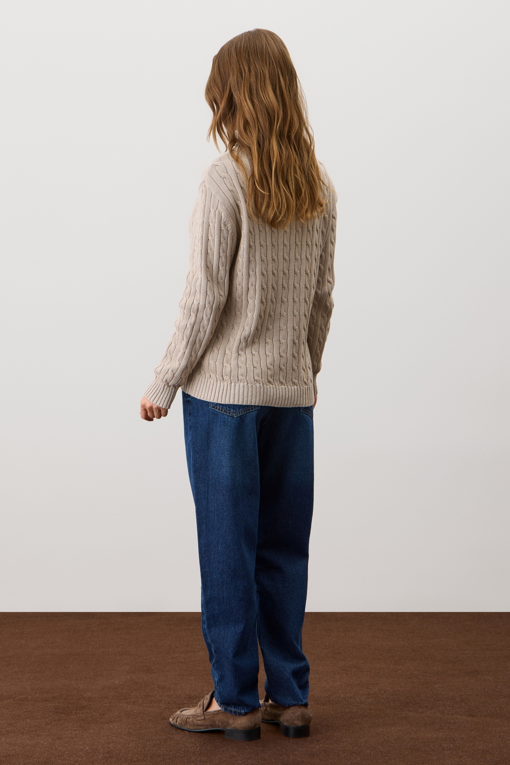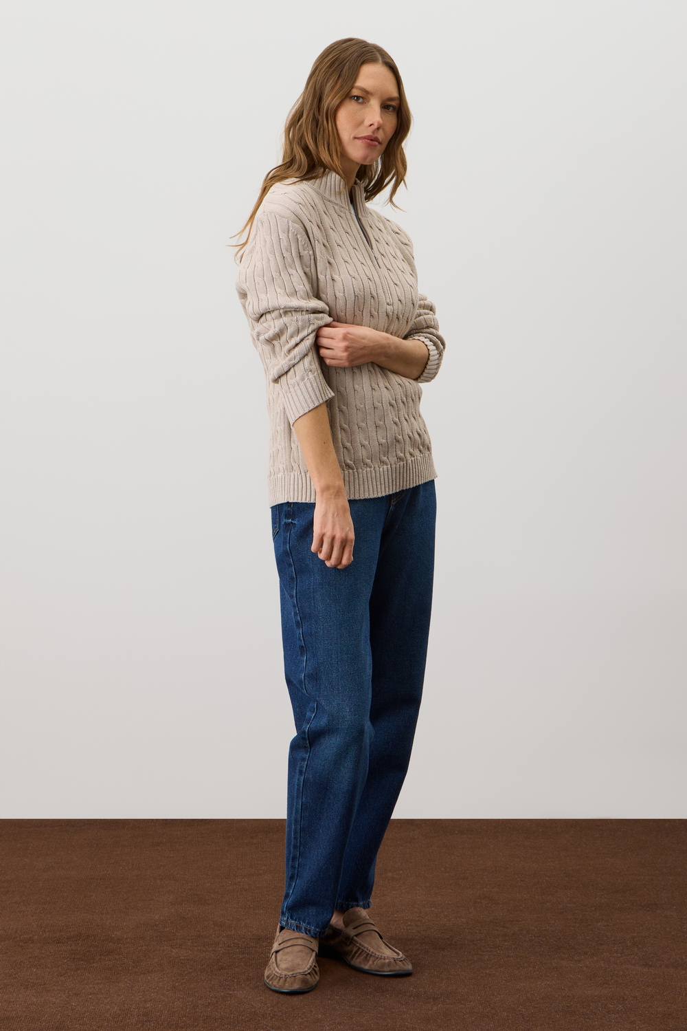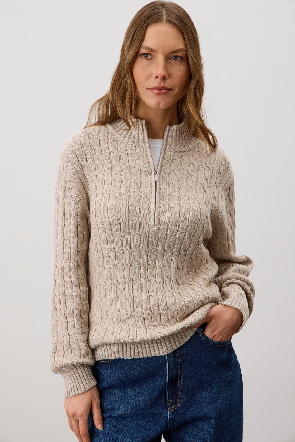 Джемпер с воротником на молнии является лаконичной базой. Комфортный тандем вязки косами и расслабленного кроя становится стильным дополнением различным образам. Джемпер создан из хлопковой пряжи и прошел дополнительную обработку по итальянской технологии, это гарантирует минимальную усадку во время носки. Акрил в составе не позволяет изделию пилинговаться.