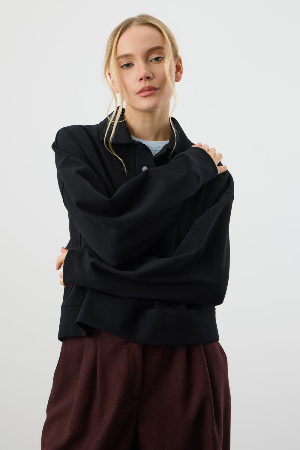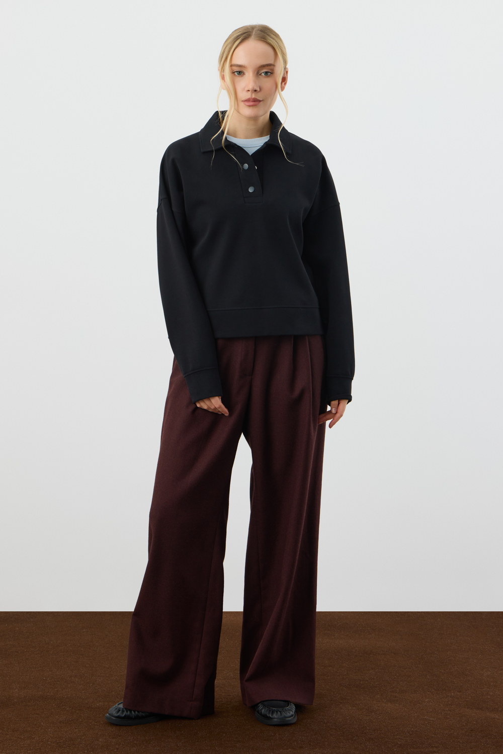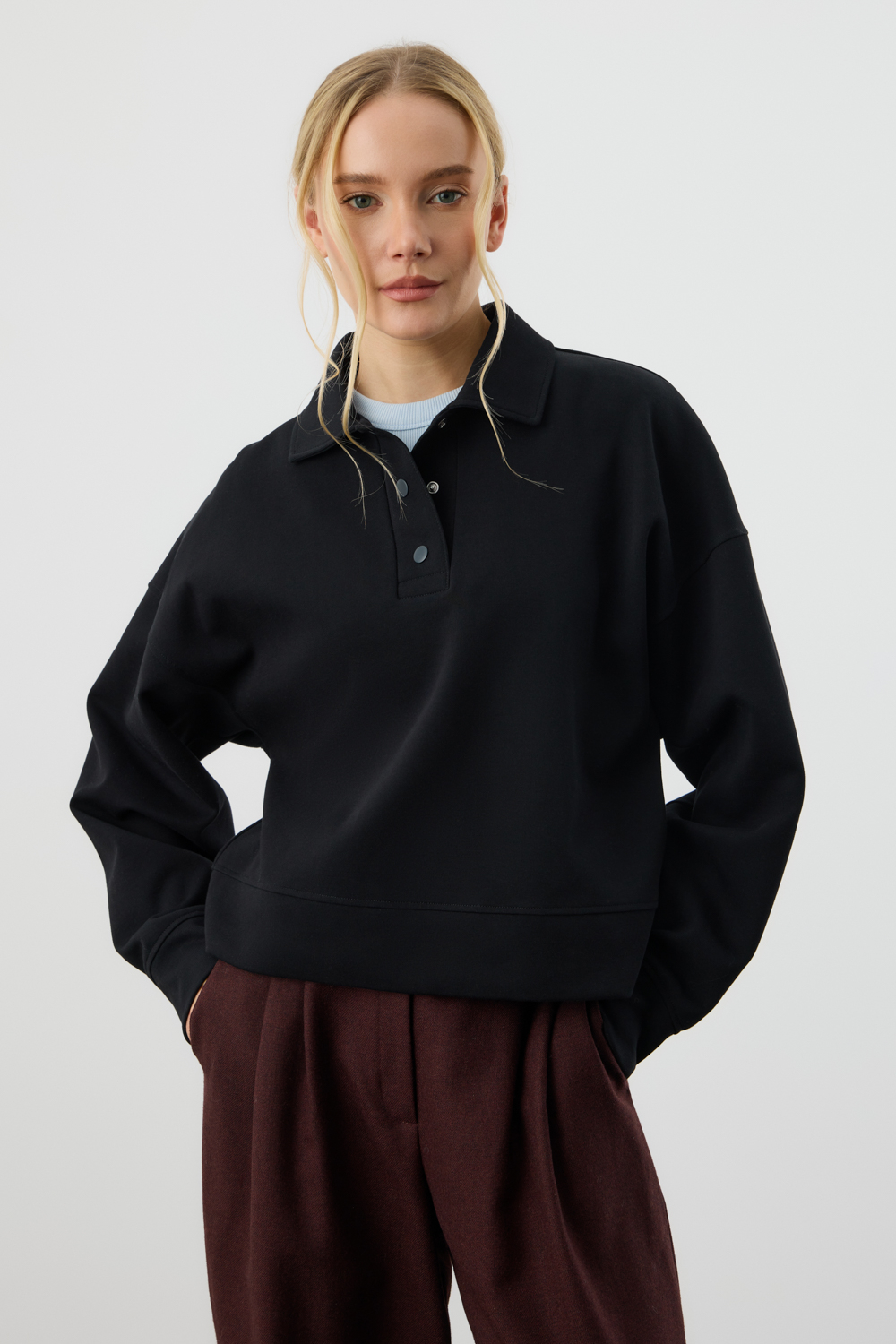 Джемпер-поло из премиального мягкого трикотажа выделяется благодаря спущенной линии плеч, что отличает его от классических моделей. Широкие манжеты и пояс формируют расслабленный стиль.