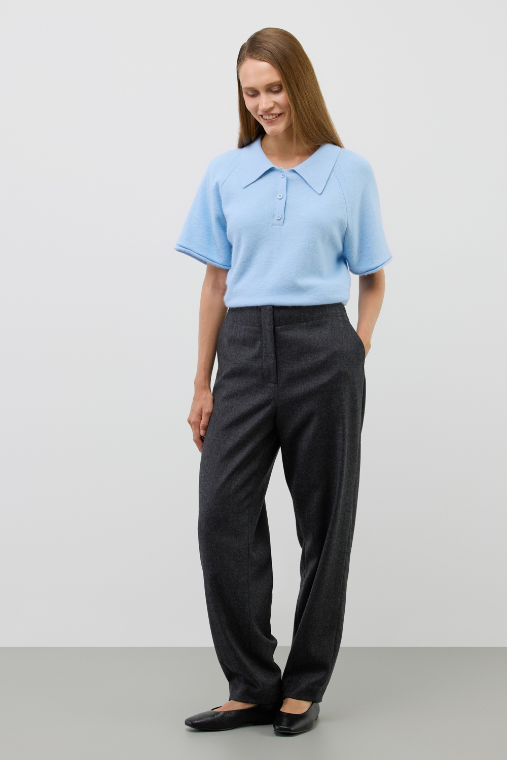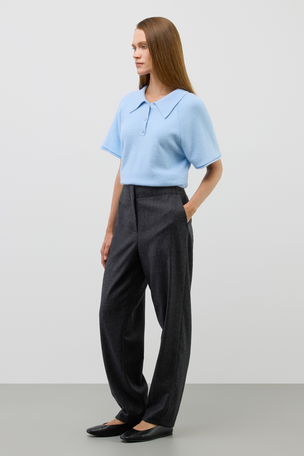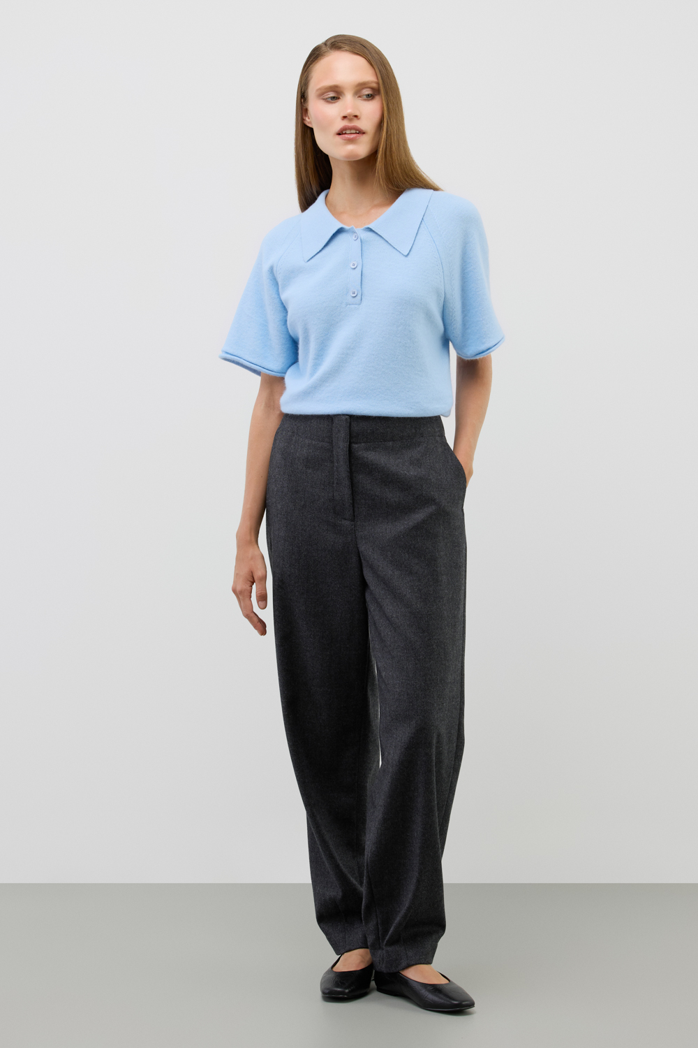 Пушистый джемер-поло из шерсти ангоры. Спущенное плечо и свободный крой делают джемпер идеальным для повседневной носки. Состав является гипоаллергенным и способствует отличному сохранению формы изделия.