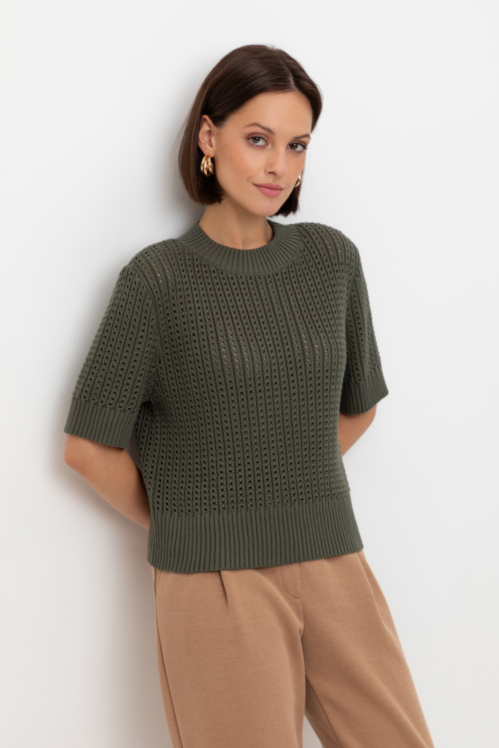 Джемпер с коротким рукавом ажурной вязки из итальянского хлопка. Умеренное переплетение, хлопок в составе придают изделию форму и дают ощущение комфорта во время носки. Незаменим в повседневном летнем гардеробе.