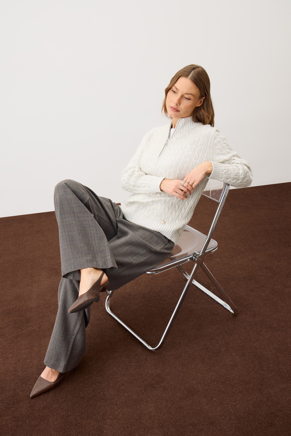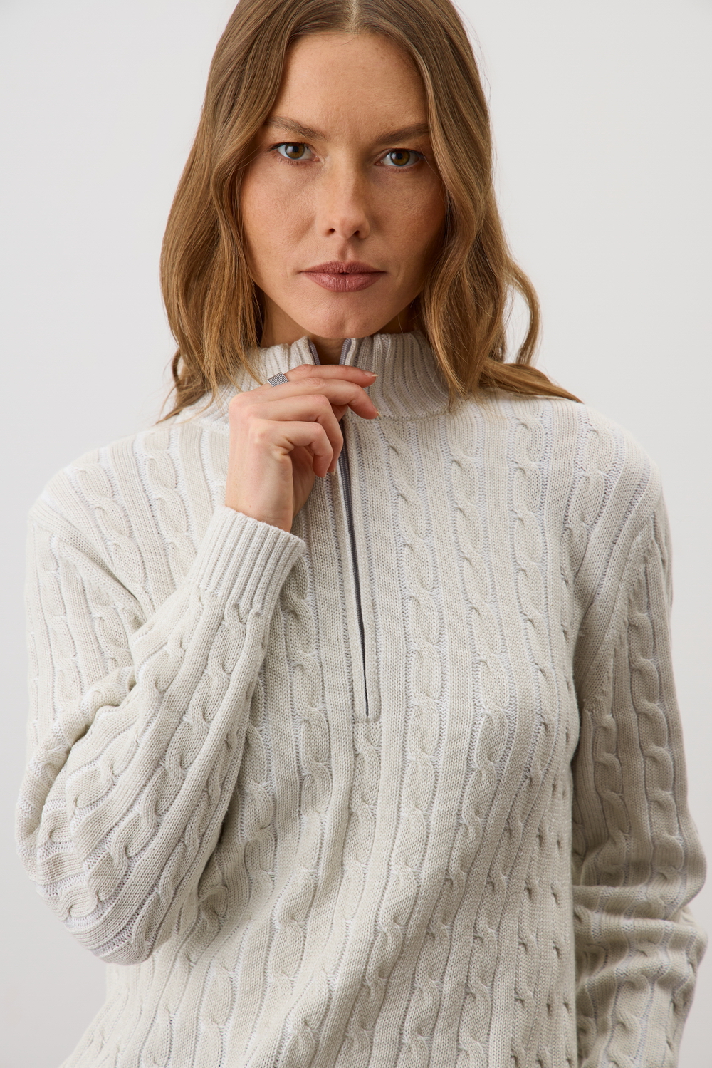 Джемпер с воротником на молнии является лаконичной базой. Комфортный тандем вязки косами и расслабленного кроя становится стильным дополнением различным образам. Джемпер создан из хлопковой пряжи и прошел дополнительную обработку по итальянской технологии, это гарантирует минимальную усадку во время носки. Акрил в составе не позволяет изделию пилинговаться.