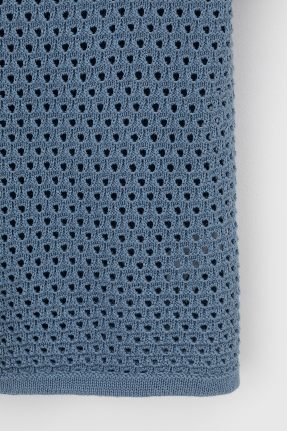 Джемпер с коротким рукавом ажурной вязки из итальянского хлопка. Умеренное переплетение, хлопок в составе придают изделию форму и дают ощущение комфорта во время носки. Незаменим в повседневном летнем гардеробе.