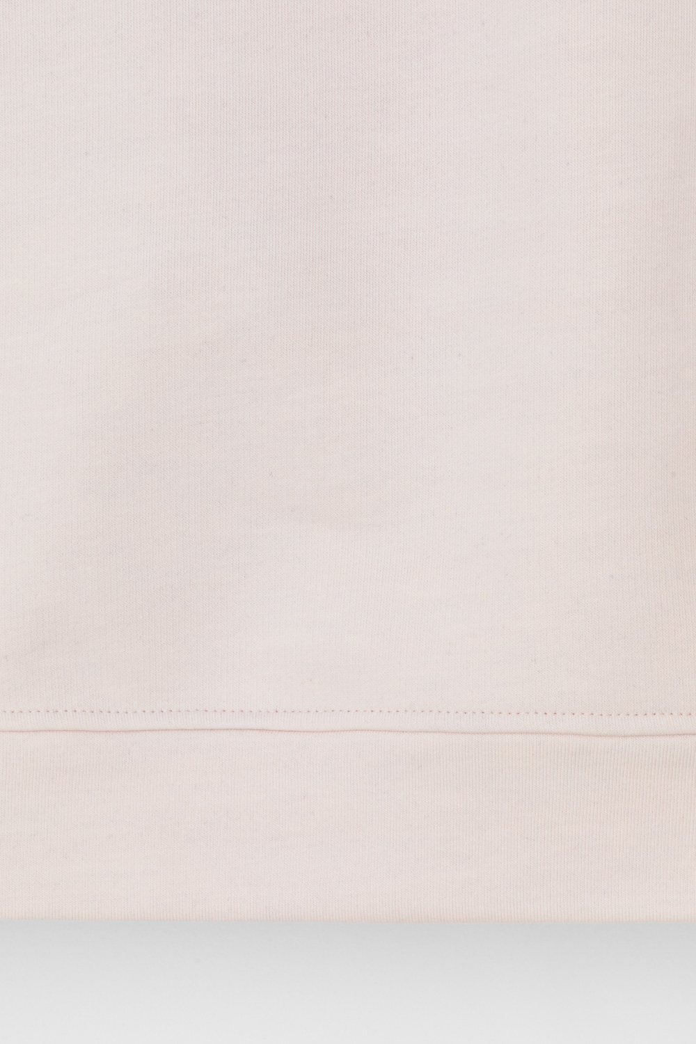 Объемный свитшот из двухцветного трикотажного футера. Внутренняя сторона изделия представлена в натуральном цвете хлопка, внешняя в нежно-розовом. За счет использования крашенной пряжи, данный вид полотна прошел минимальную обработку, что придало изделию мягкость и шелковистость.