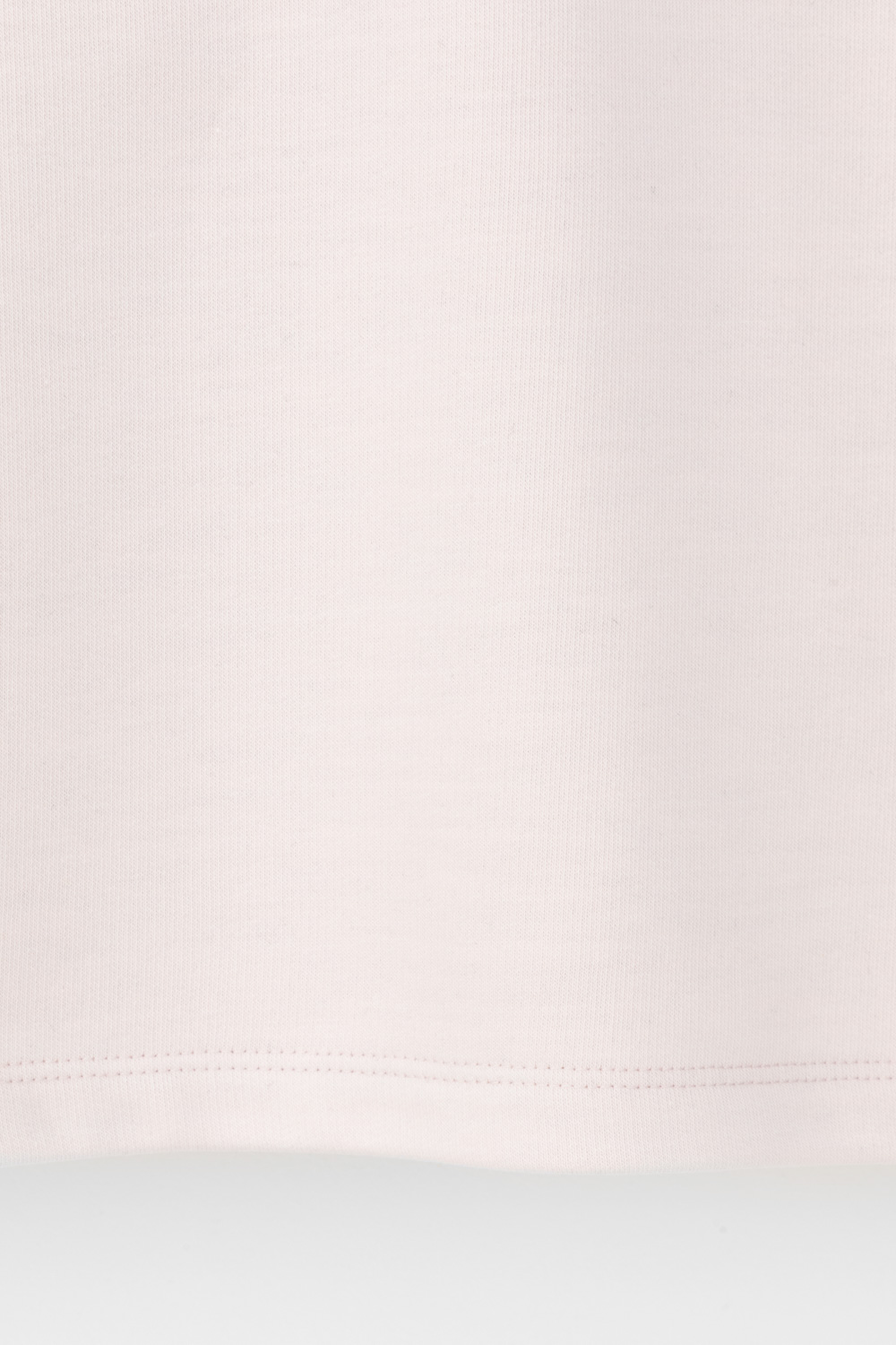 Футболка из мягкого двухцветного футера. Внутренняя сторона изделия представлена в натуральном цвете хлопка, внешняя в нежно-розовом. За счет использования крашенной пряжи, данный вид полотна прошел минимальную обработку, что придало изделию мягкость и шелковистость.
