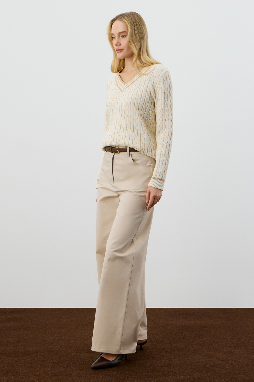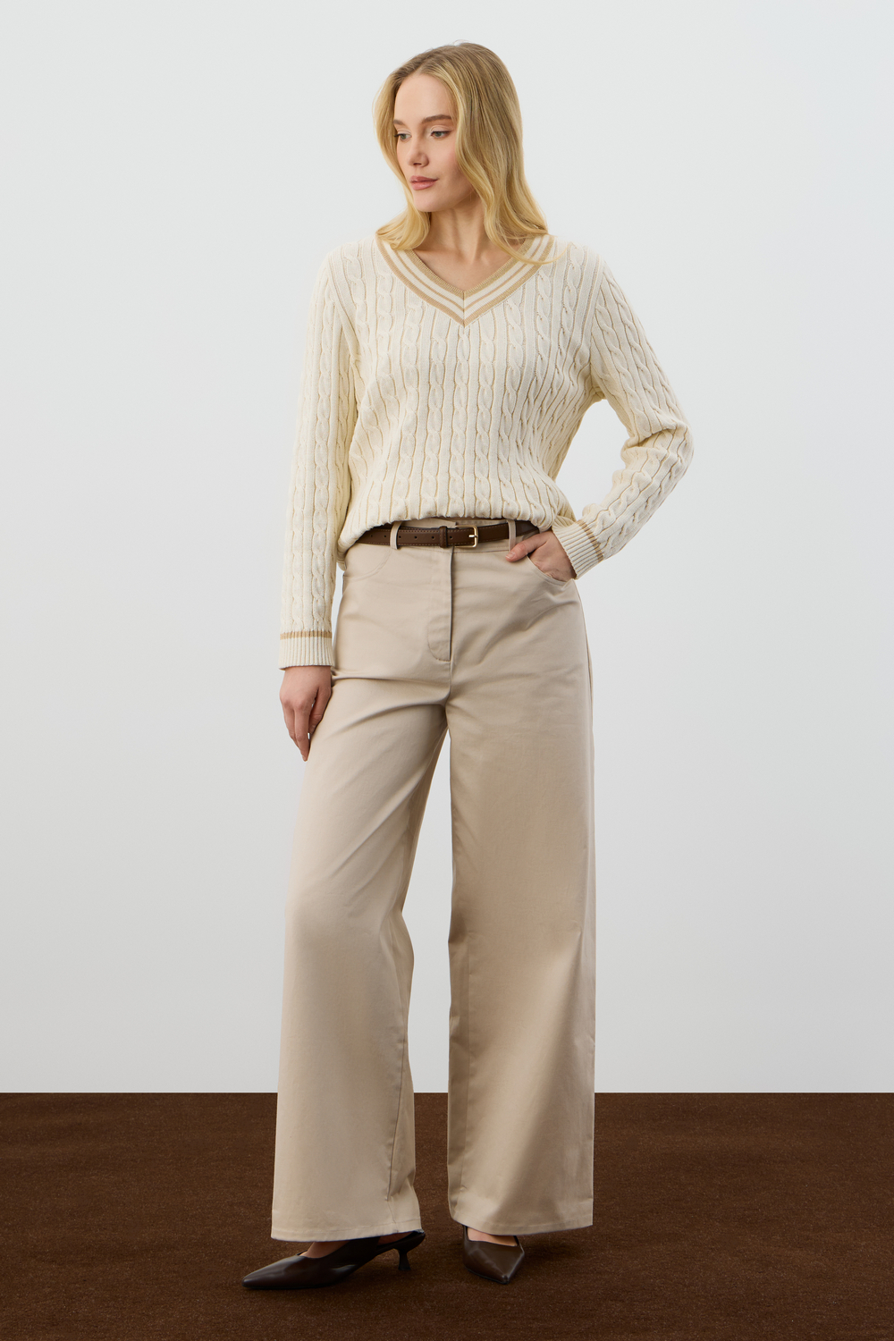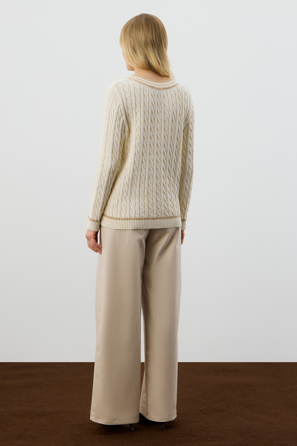 Хлопковый джемпер дополняет классический вырез, а вязка косами элегантно завершает изделие. Джемпер прошел дополнительную обработку по итальянской технологии, это гарантирует минимальную усадку во время носки. Акрил в составе не позволяет изделию пилинговаться.