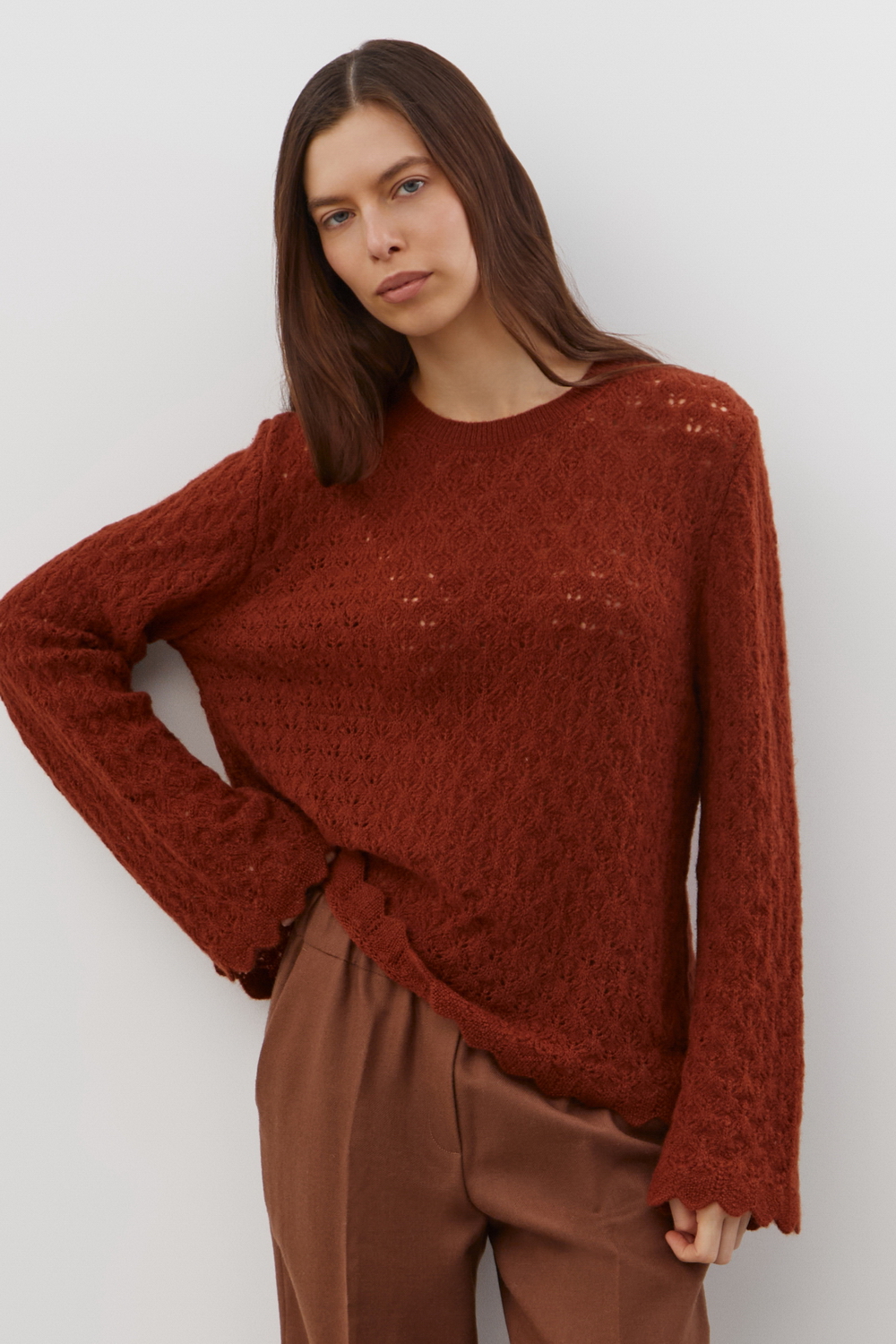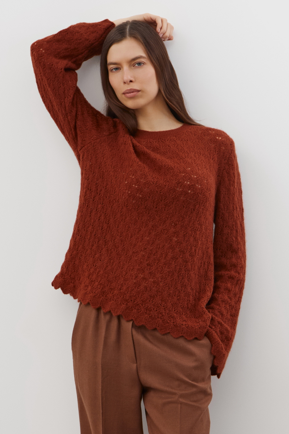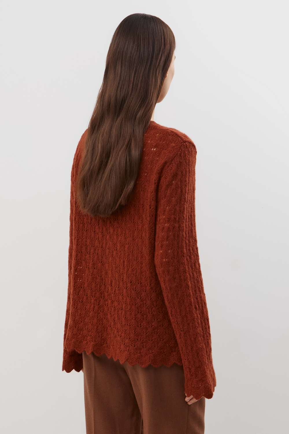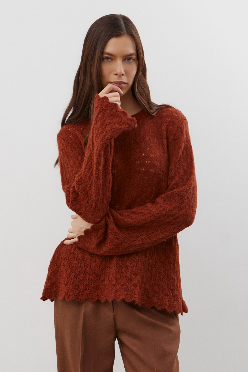 Ажурный джемпер из мериносовой шерсти и мохера  — идеальный выбор для ценителей качества и стиля. Изысканное сочетание натуральных материалов и акрила создает непревзойденный комфорт: модель деликатно подчеркивает силуэт, обеспечивает нежное прикосновение к коже и сохраняет безупречный внешний вид.