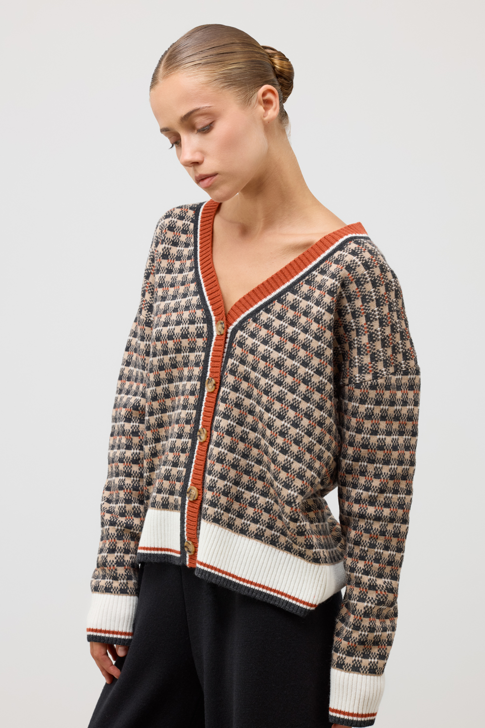 Элегантный кардиган в кантри-стиле изготовлен из высококачественной пряжи с применением передовой технологии смешанных волокон. Изысканное сочетание шерсти и акрила создает непревзойденный комфорт: модель деликатно подчеркивает силуэт, обеспечивает нежное прикосновение к коже и сохраняет безупречный внешний вид.