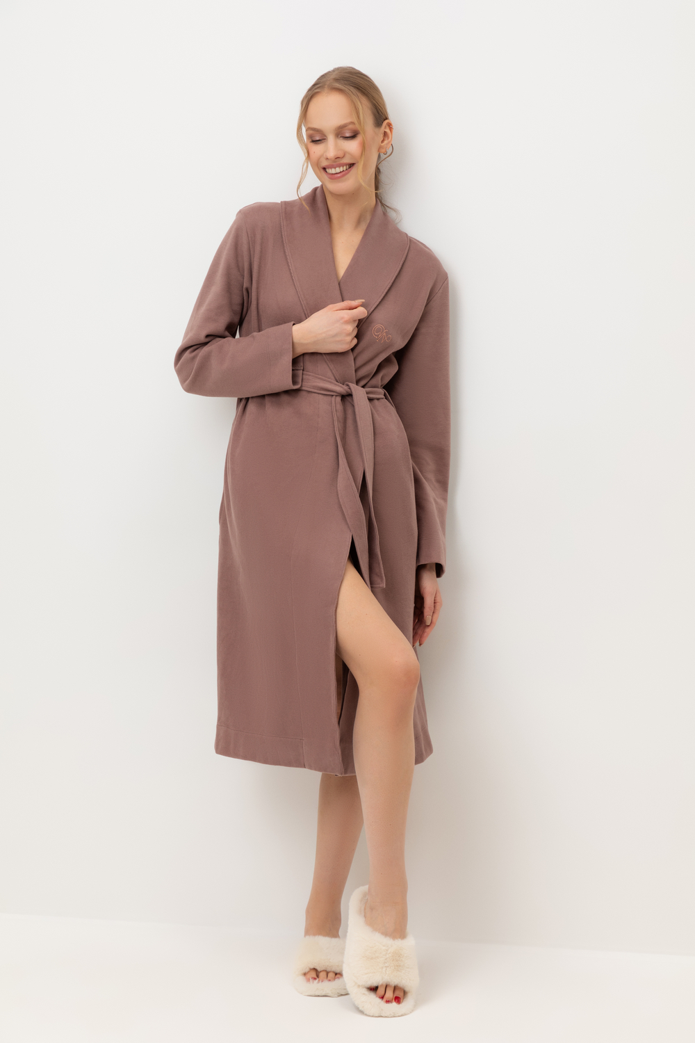 Халат из мягкого 100% хлопка с обработкой пич эффектом  подарит атмосферу домашнего уюта и комфорта, придавая изделию бархатистость и мягкость.