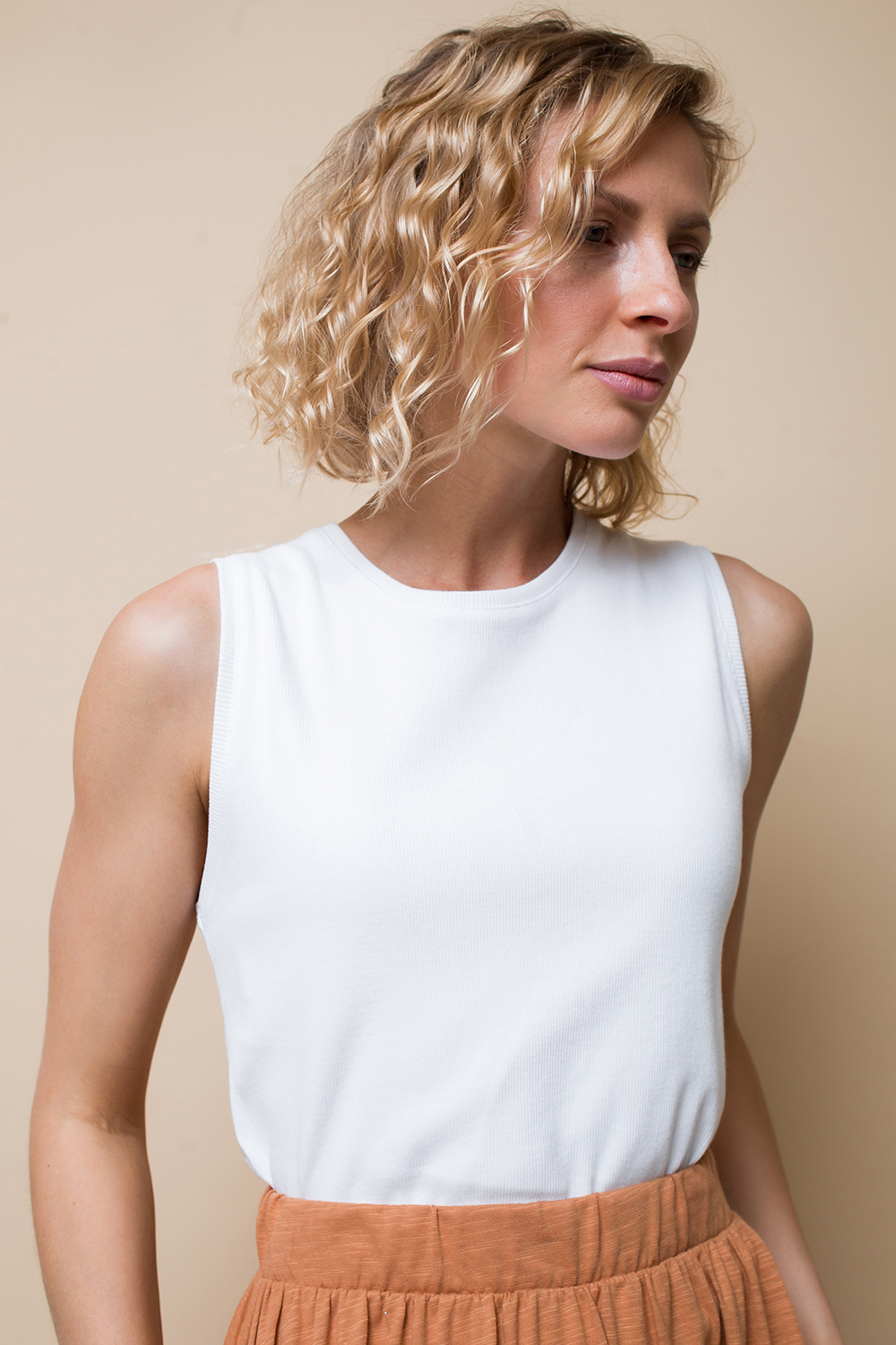 Классическим элементом гардероба является базовый топ в рубчик. Широкие бретели и высокий вырез делают изделие комфортным в носке и универсальным в повседневной жизни.